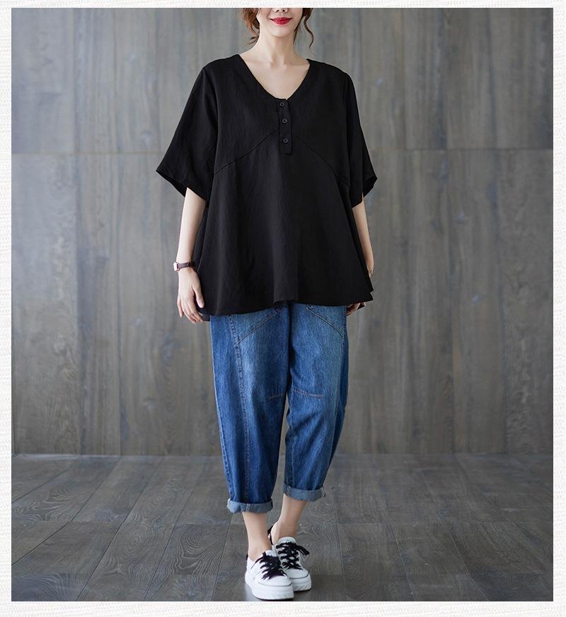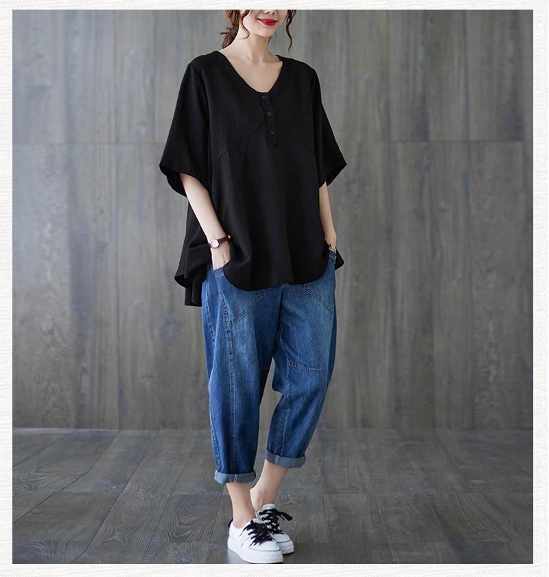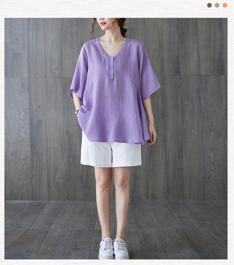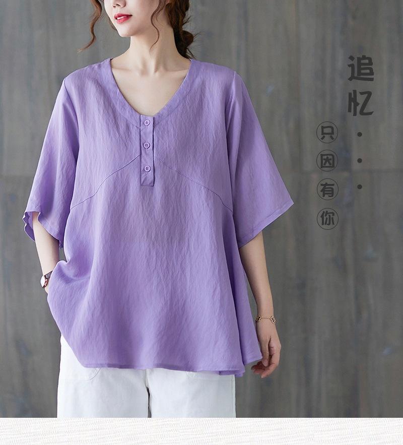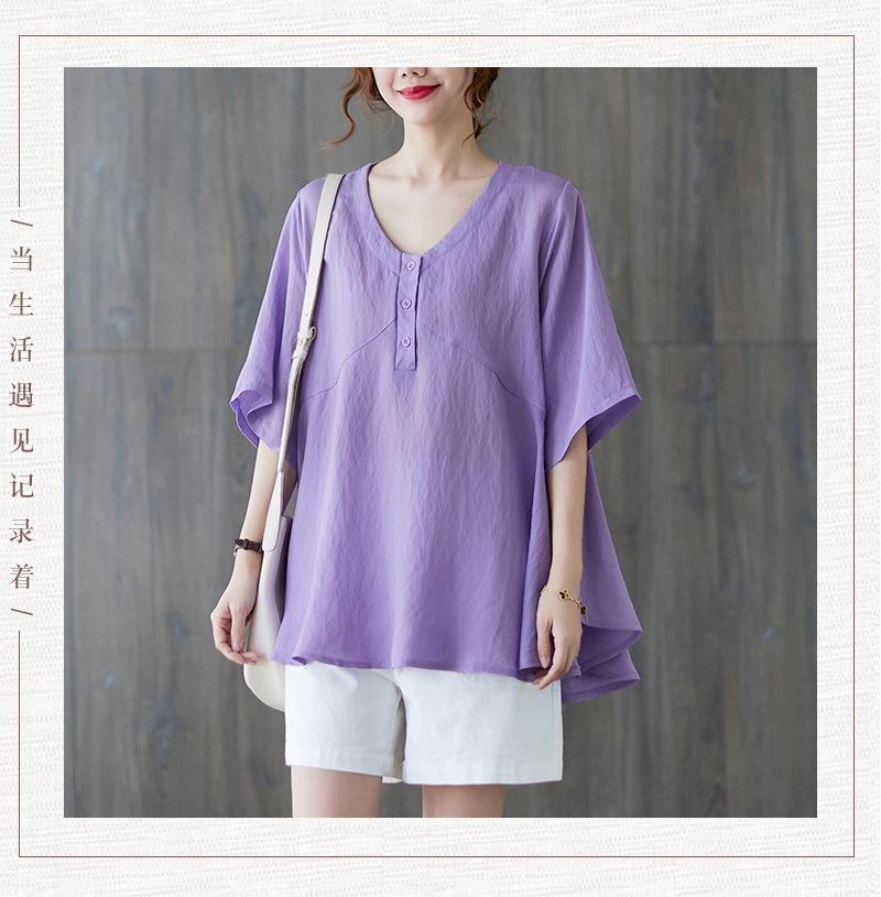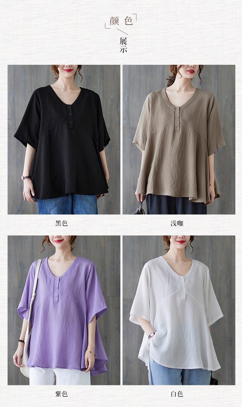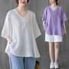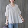 2025 Nova Camiseta Feminina de Verão Plus Size Solta Cor Pura Decote V Manga Média Top para Mulheres