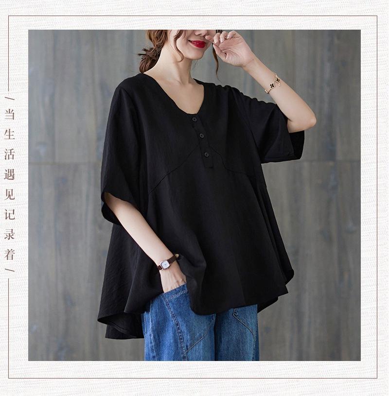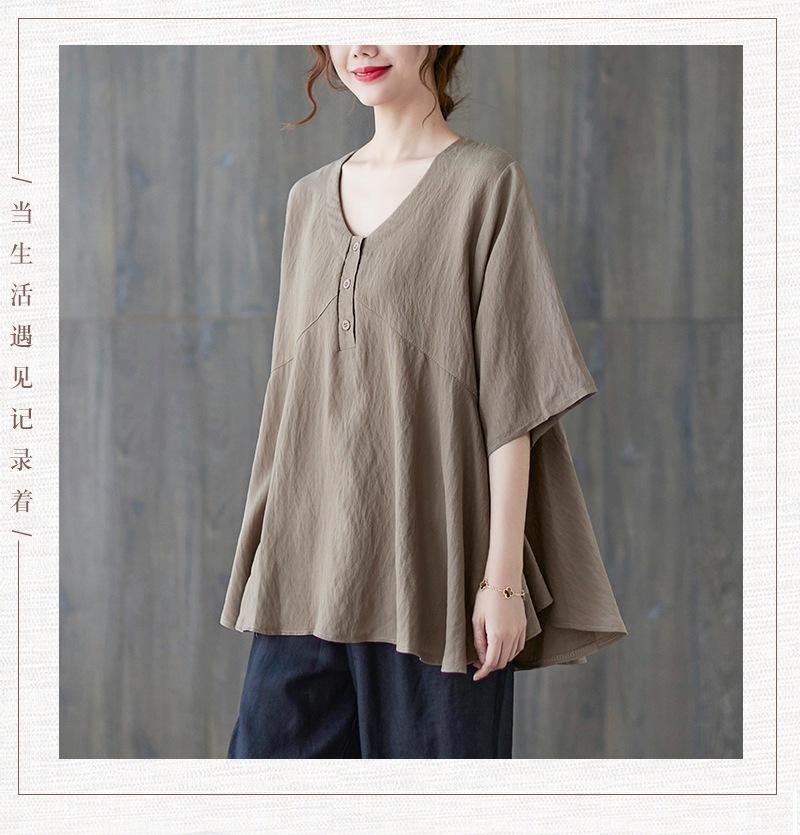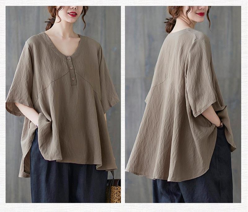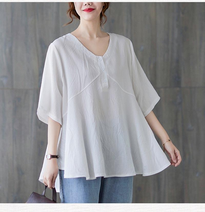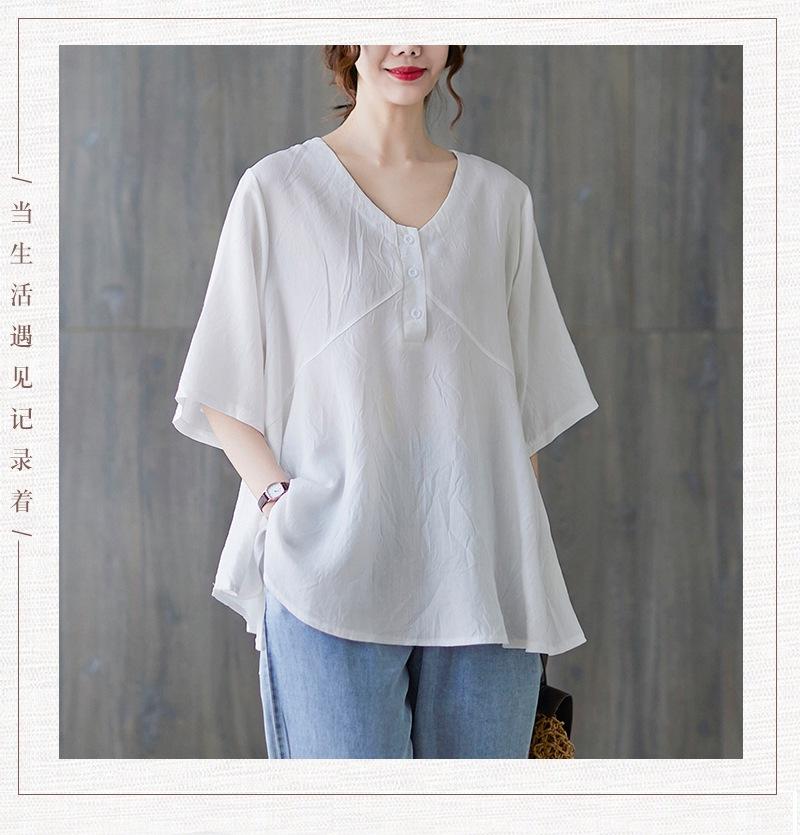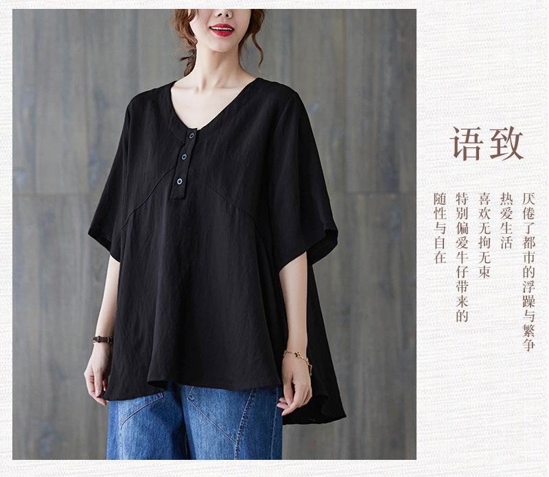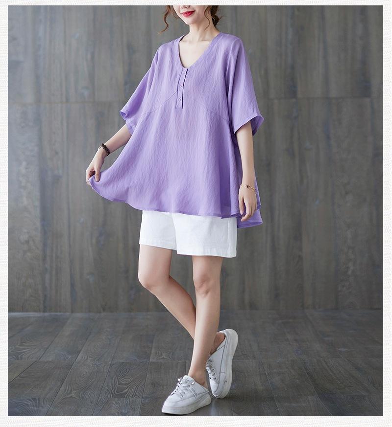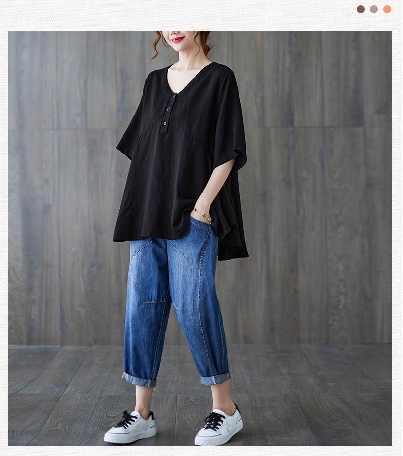 2025 Nova Camiseta Feminina de Verão Plus Size Solta Cor Pura Decote V Manga Média Top para Mulheres