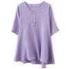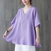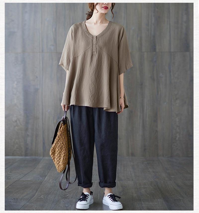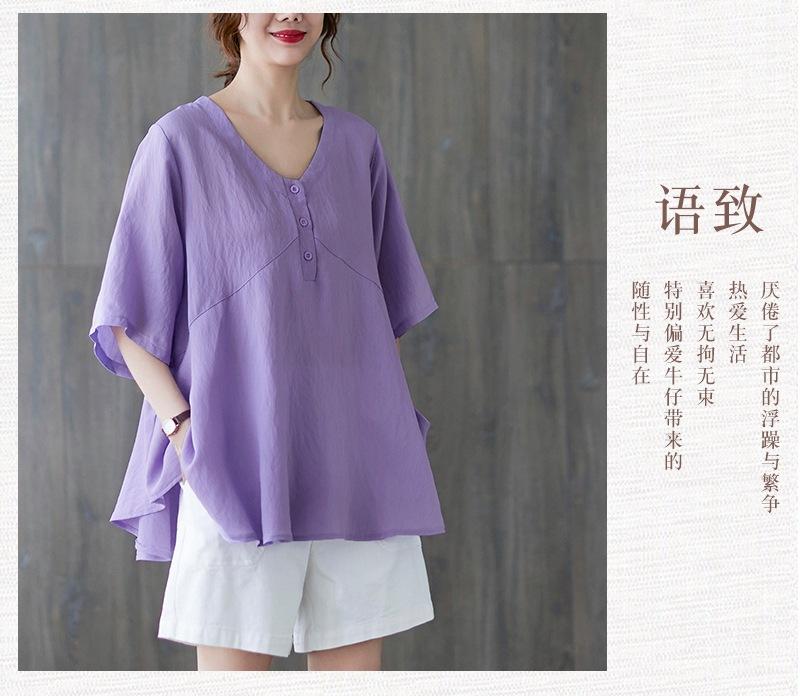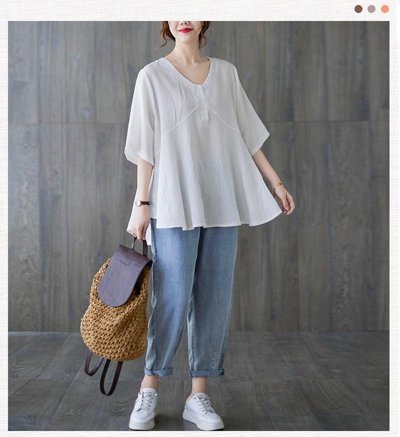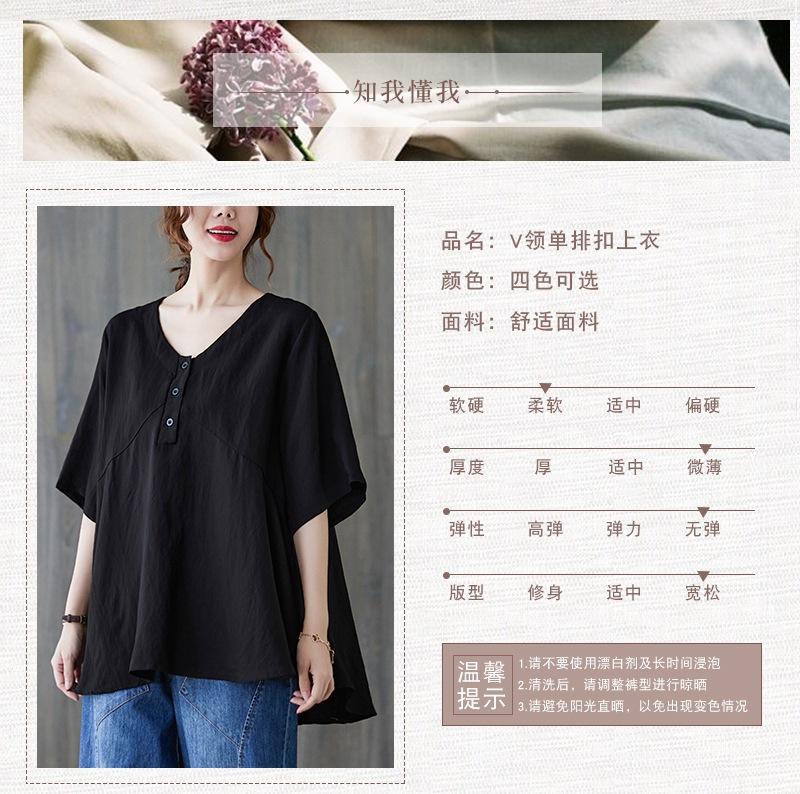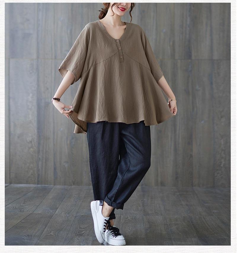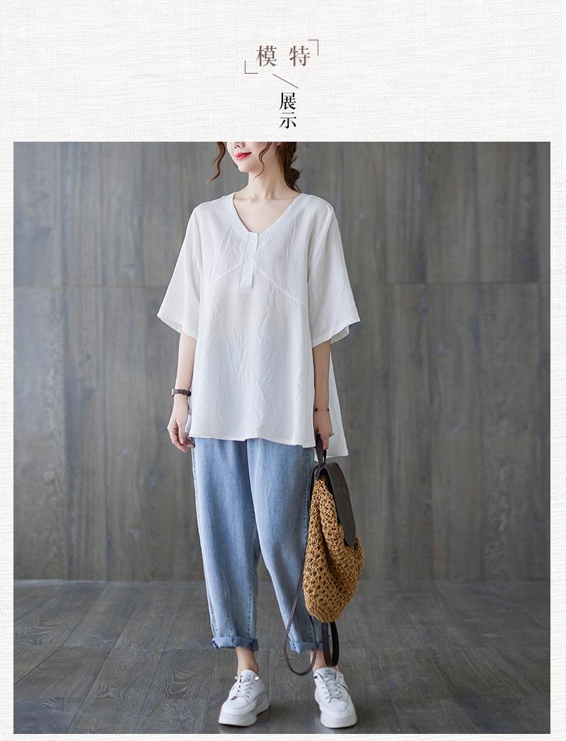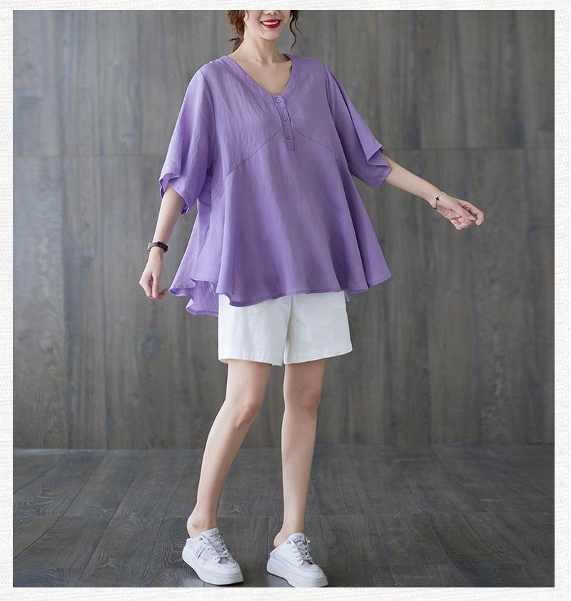 2025 Nova Camiseta Feminina de Verão Plus Size Solta Cor Pura Decote V Manga Média Top para Mulheres