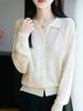 Cardigã feminino de tricô com lapela em lã fina, mangas compridas e modelagem ampla, em jacquard, lançamento do início do outono de 2025.