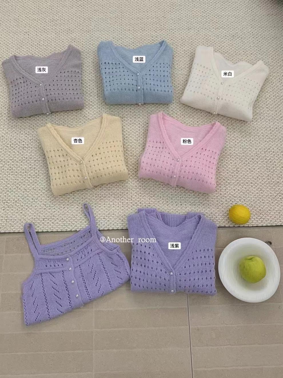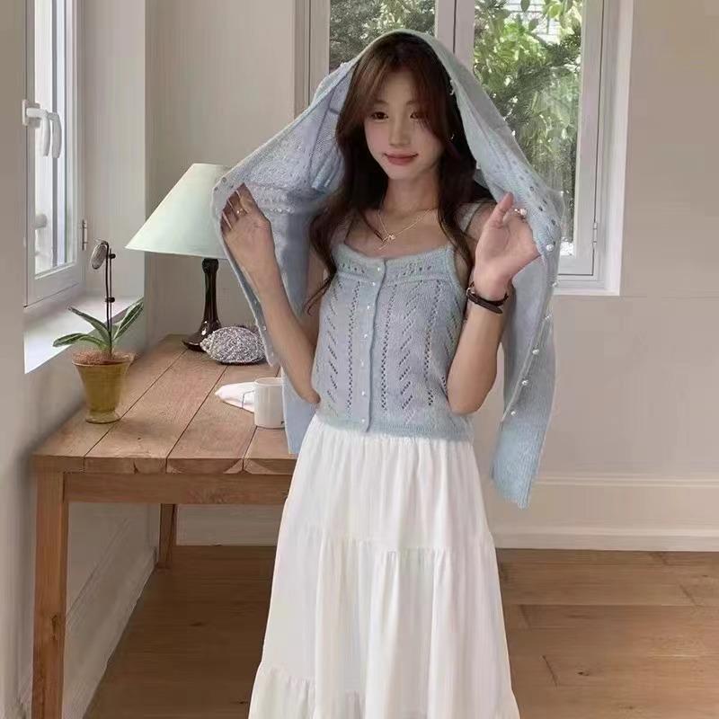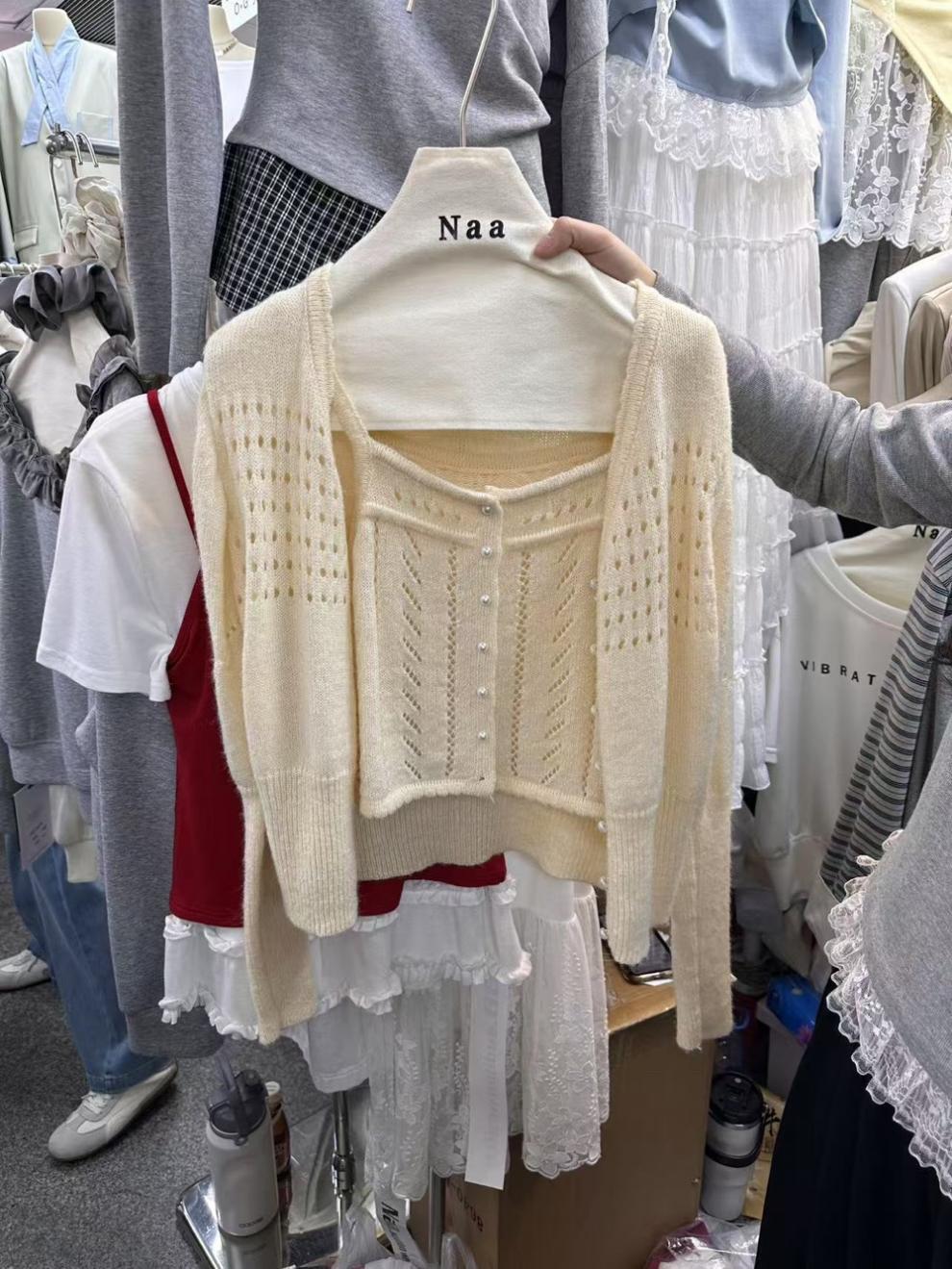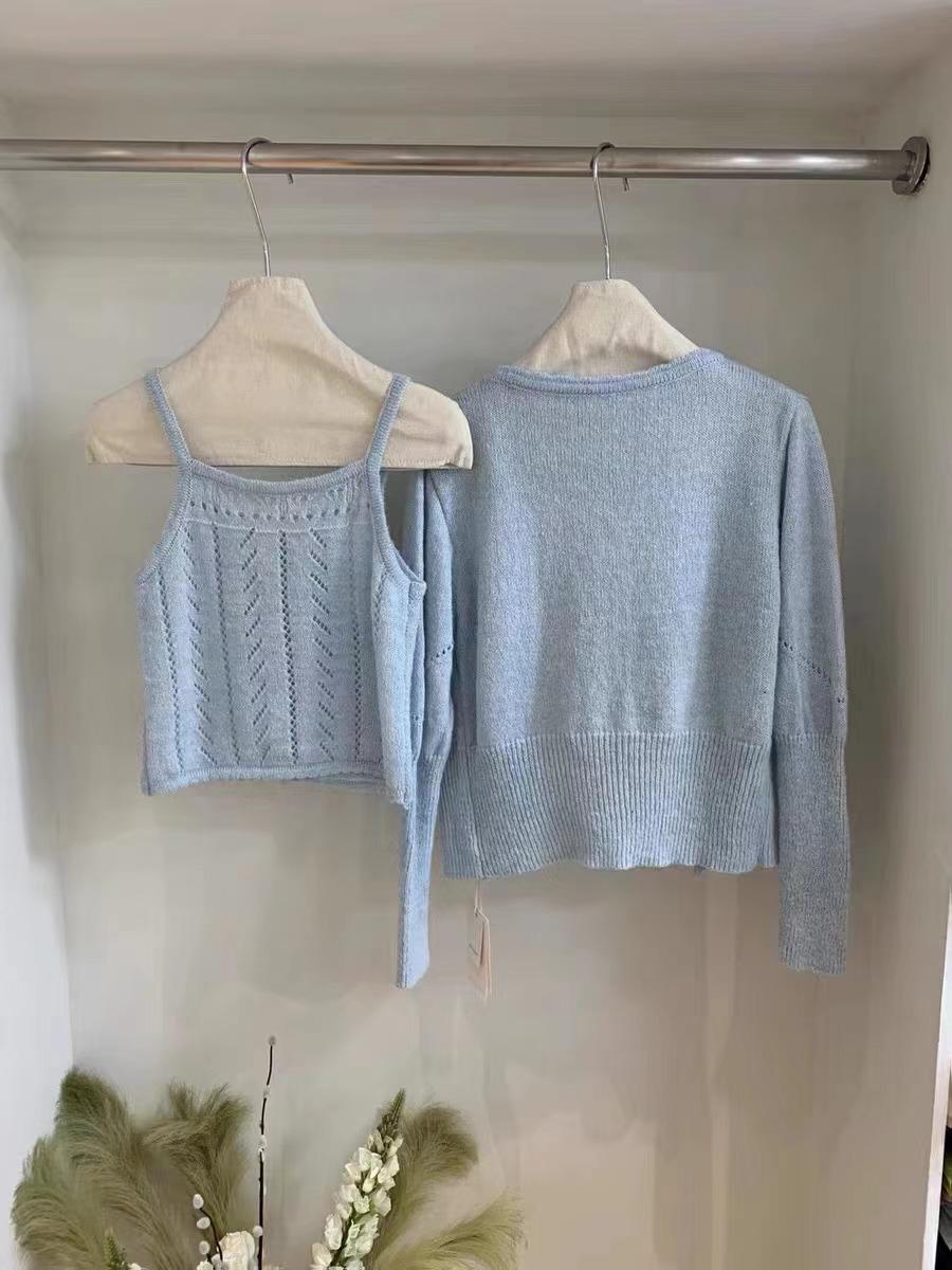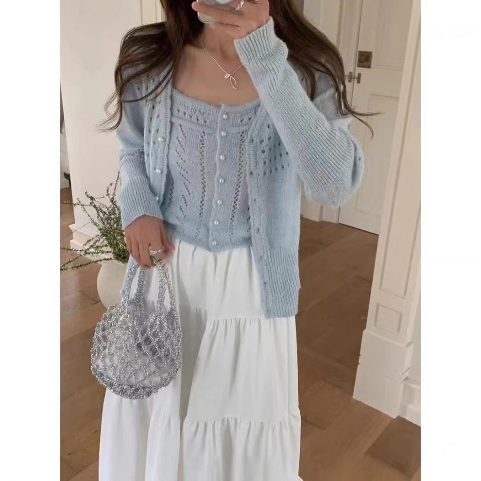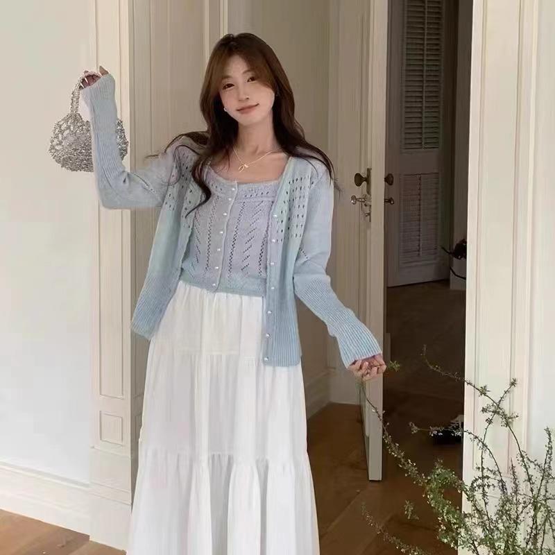 Conjunto Cardigã Tricotado Estilo Coreano Delicado Regata Mulher 2025 Primavera Novo Temperamento Cor Sólida Conjunto Duas Peças Tendência