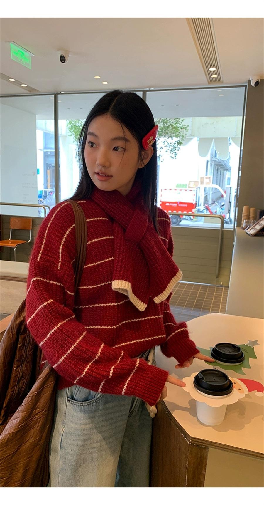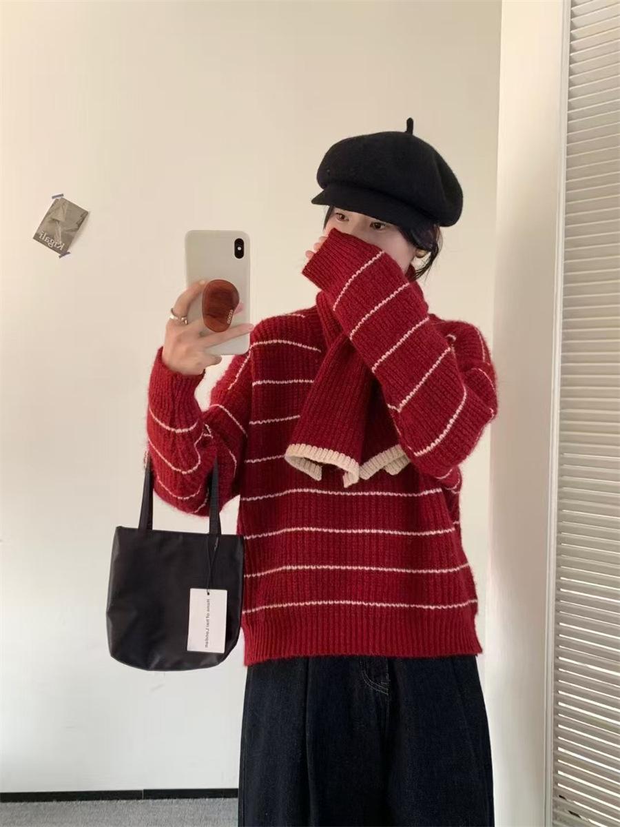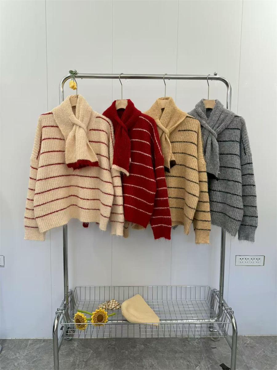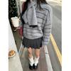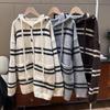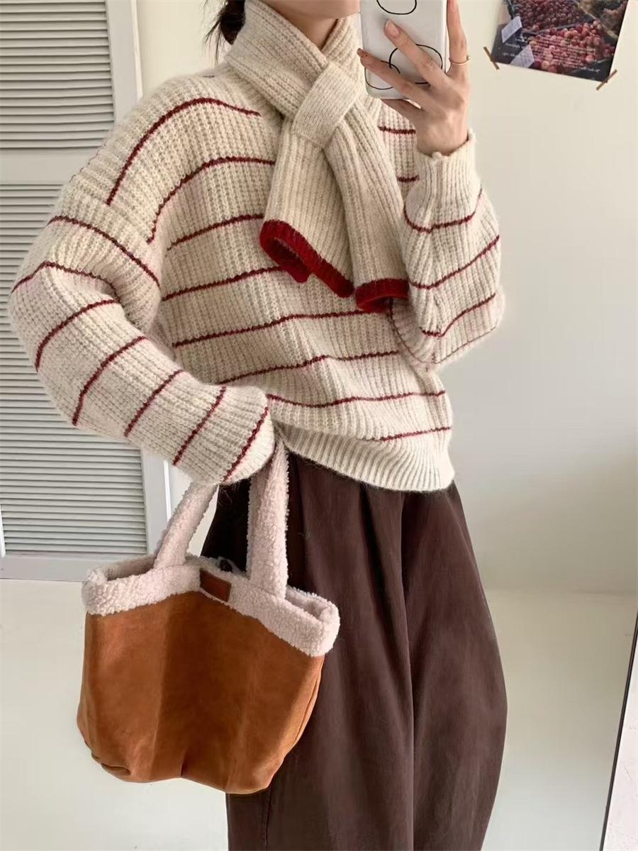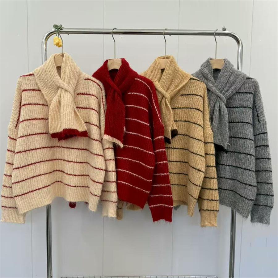 Novo Cardigã de Tricô Listrado com Bloco de Cores Versátil Solto Estilo Coreano da Moda Outono/Inverno com Cachecol Top