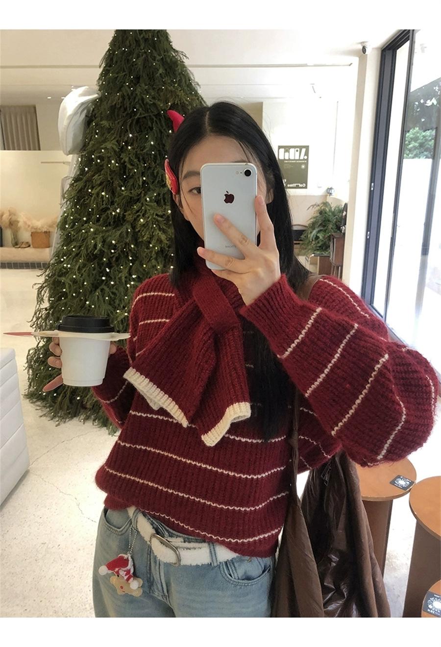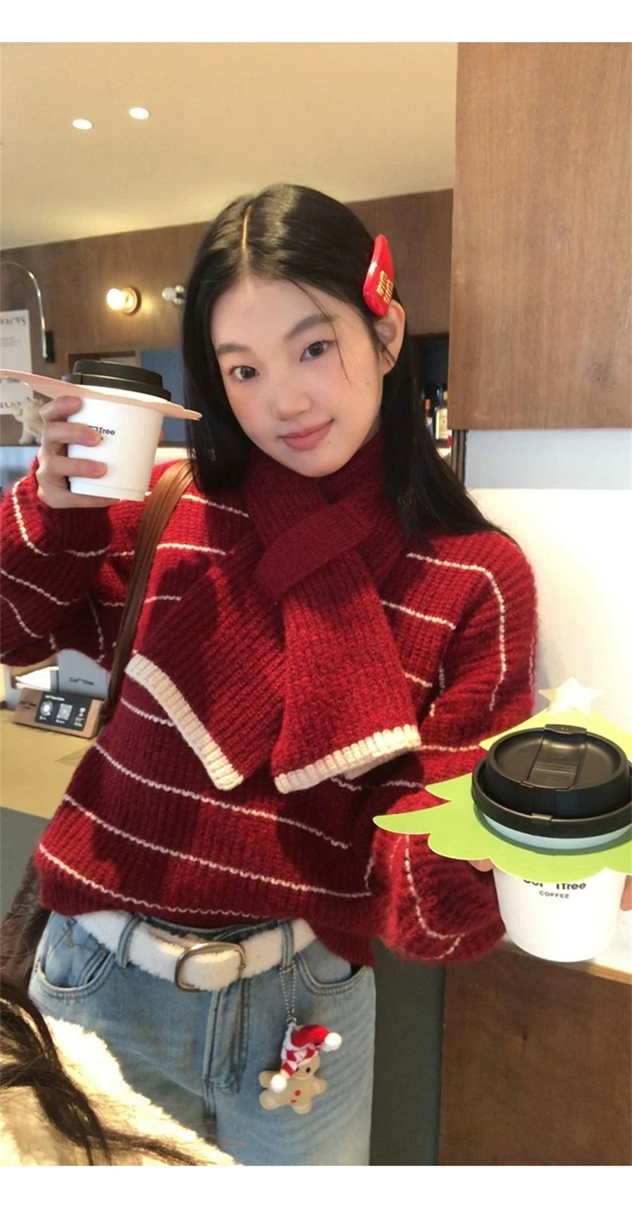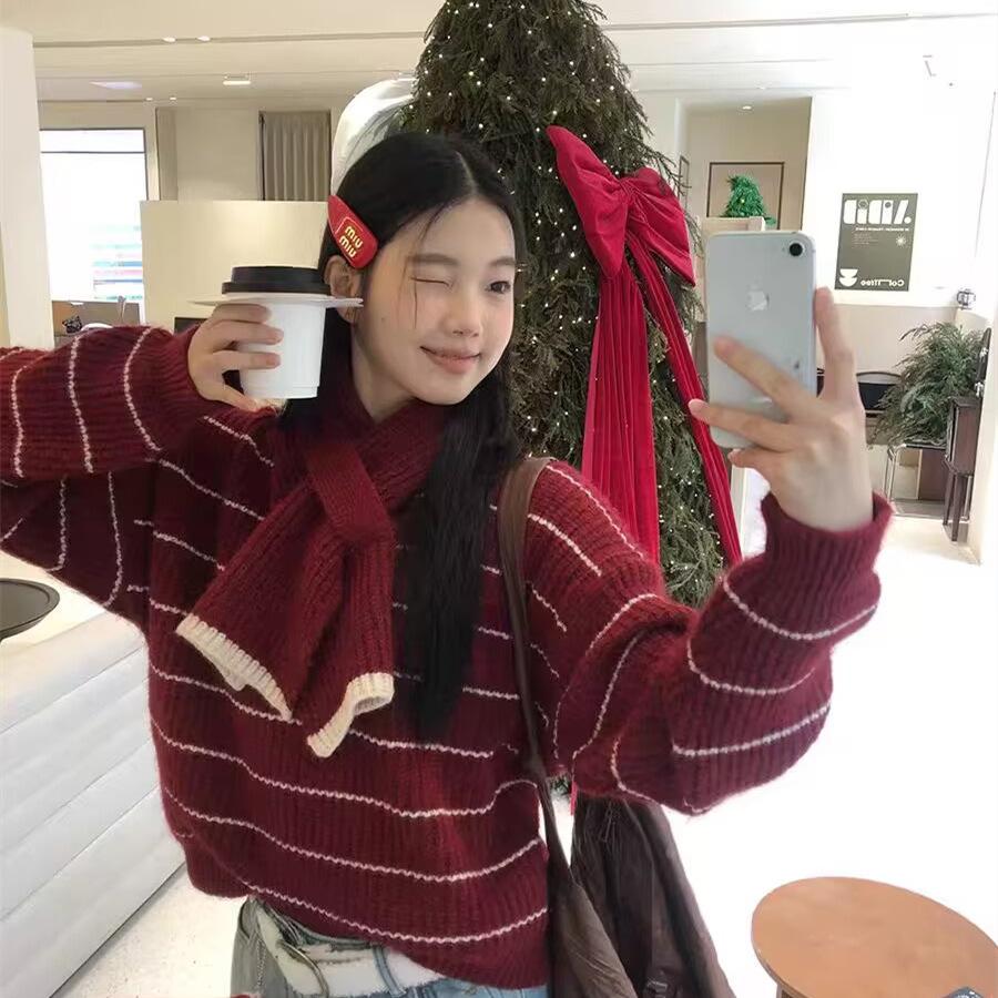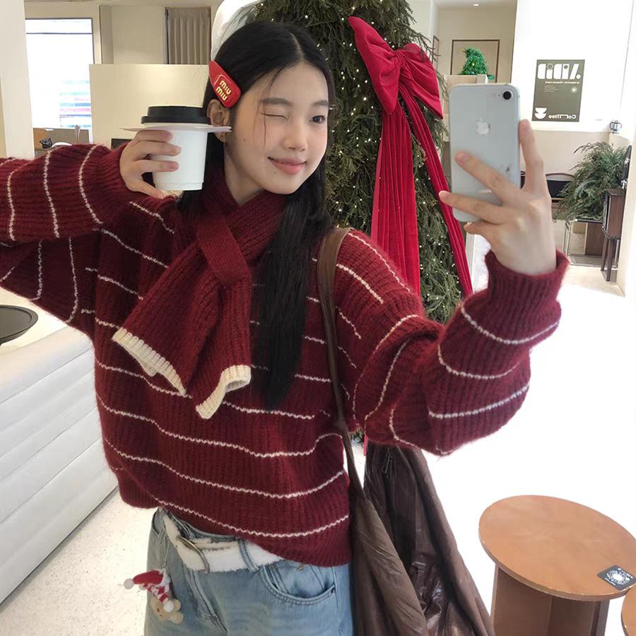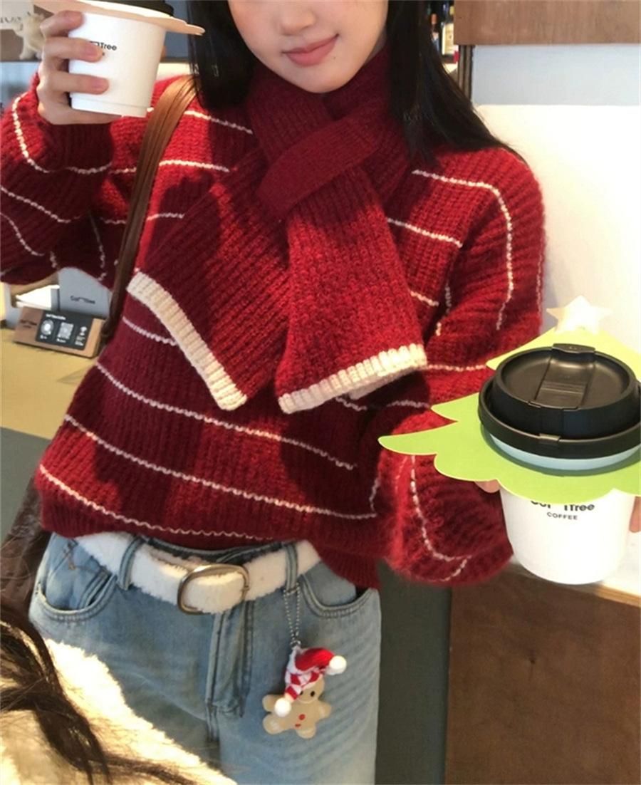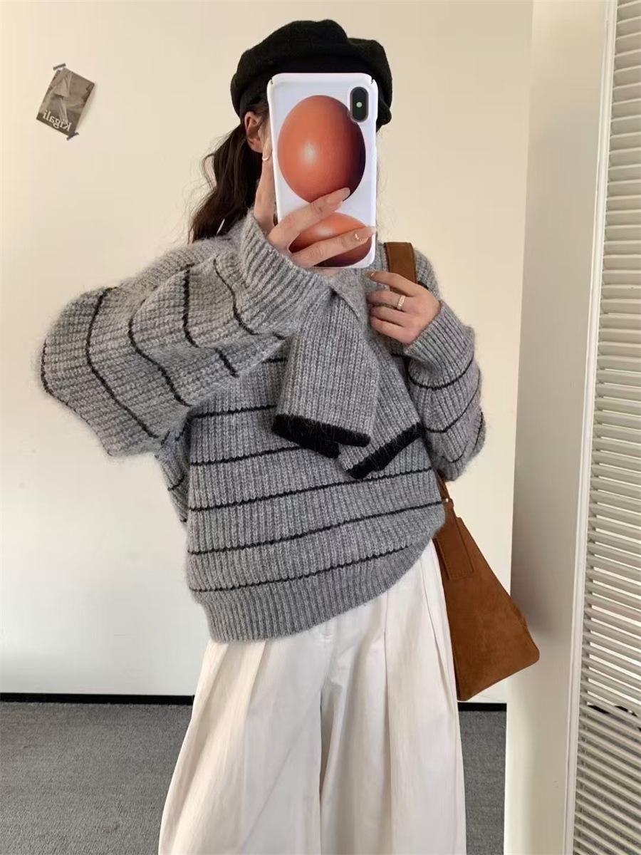 Novo Cardigã de Tricô Listrado com Bloco de Cores Versátil Solto Estilo Coreano da Moda Outono/Inverno com Cachecol Top