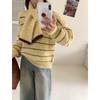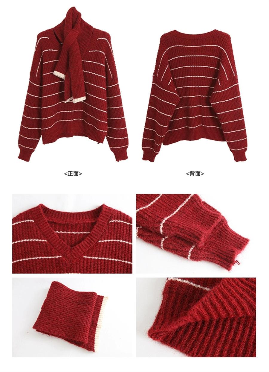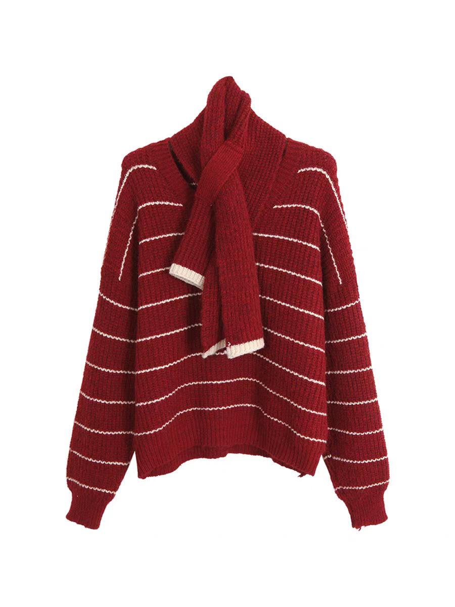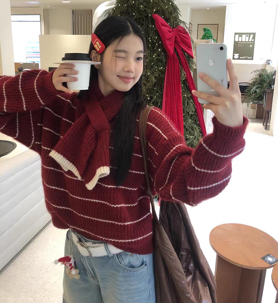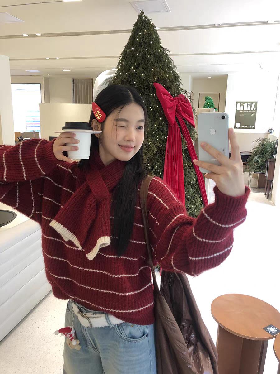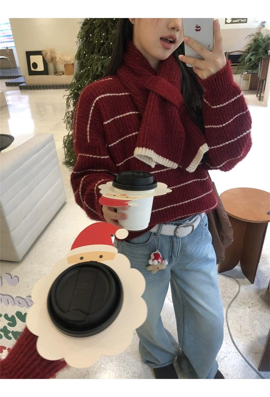 Novo Cardigã de Tricô Listrado com Bloco de Cores Versátil Solto Estilo Coreano da Moda Outono/Inverno com Cachecol Top