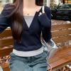Foto real em estoque temperamento falso duas peças camiseta preta feminina ano novo manga longa feminina outono estilo europeu plus size top