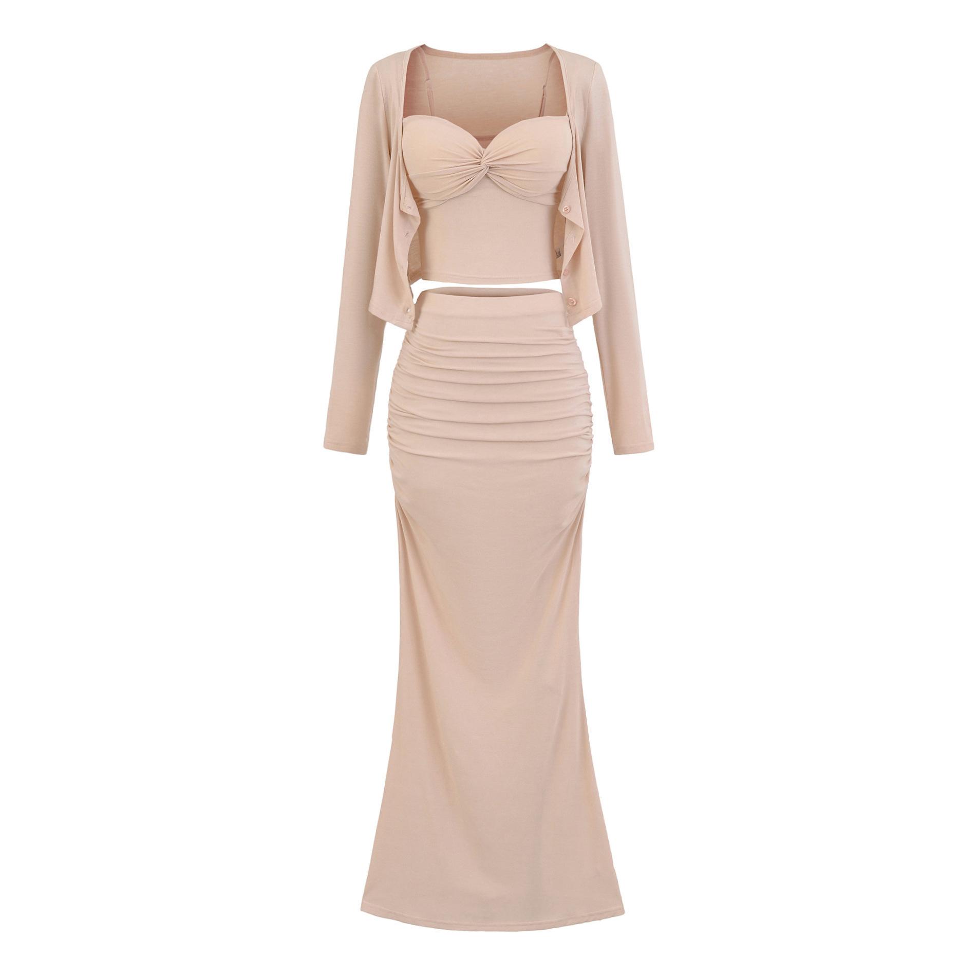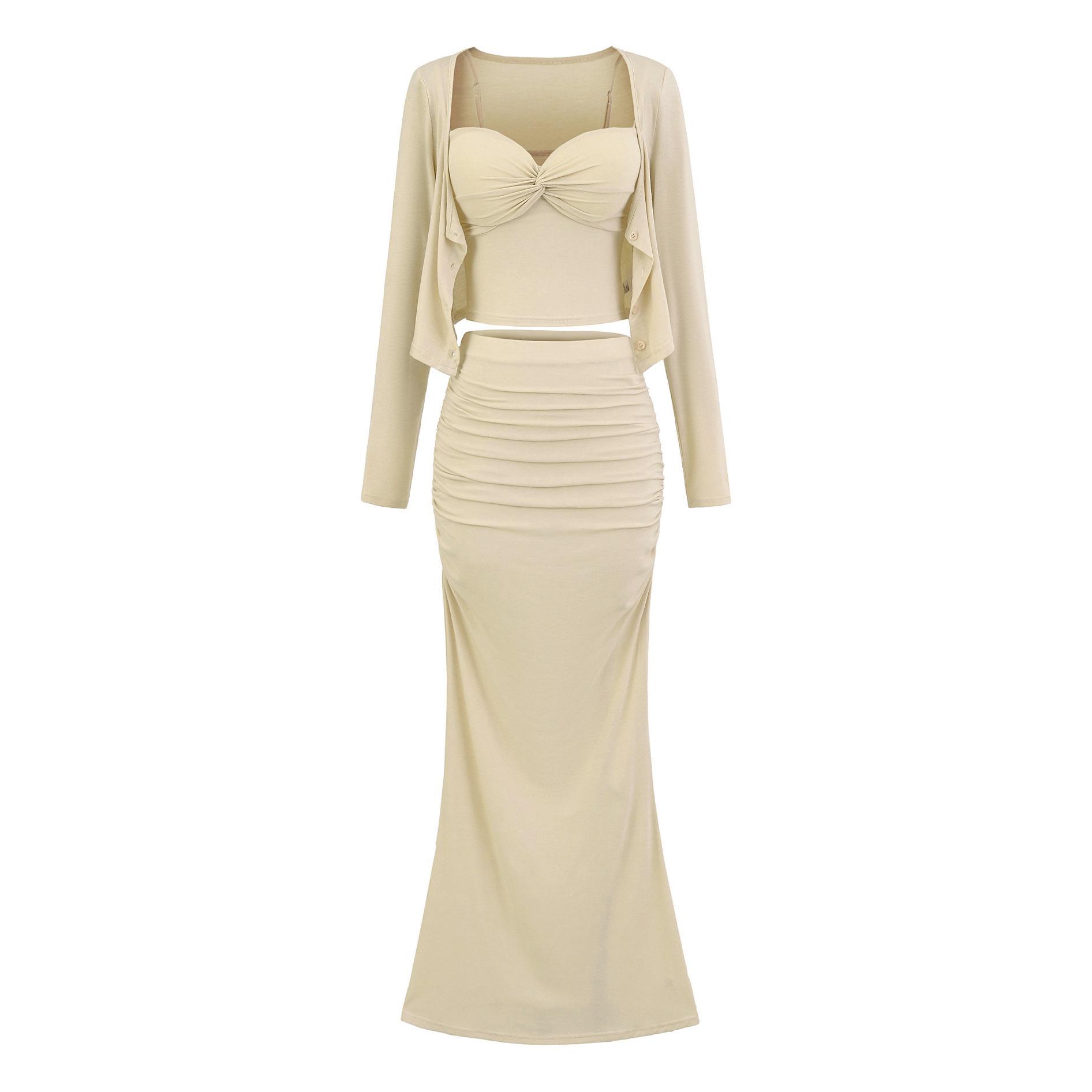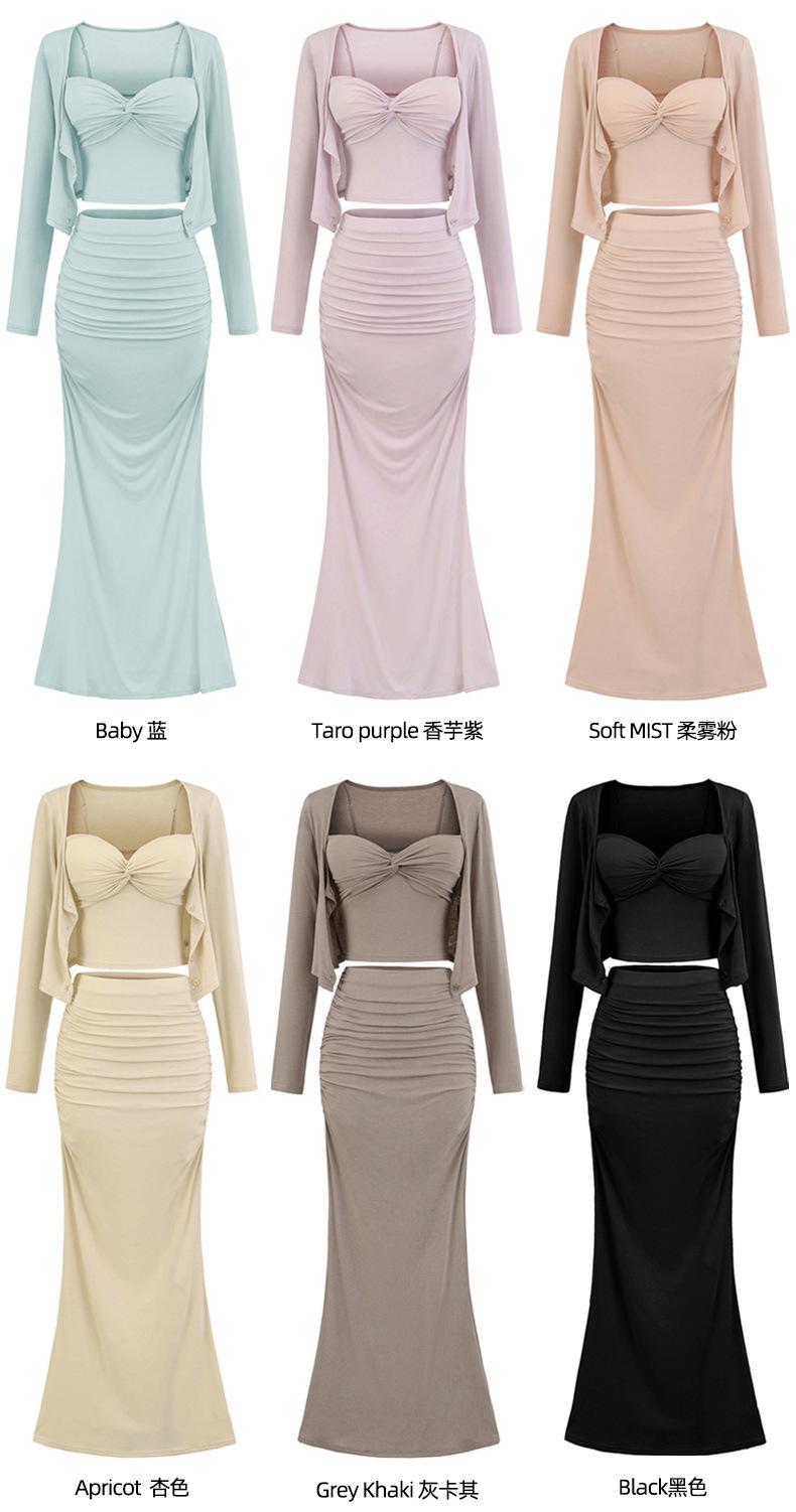 Início do Outono Nova Chegada Mulher Madura Suave High-End Cardigan de Manga Longa + Regata Camisole + Saia Midi Justa ao Quadril Conjunto de Três Peças Feminino