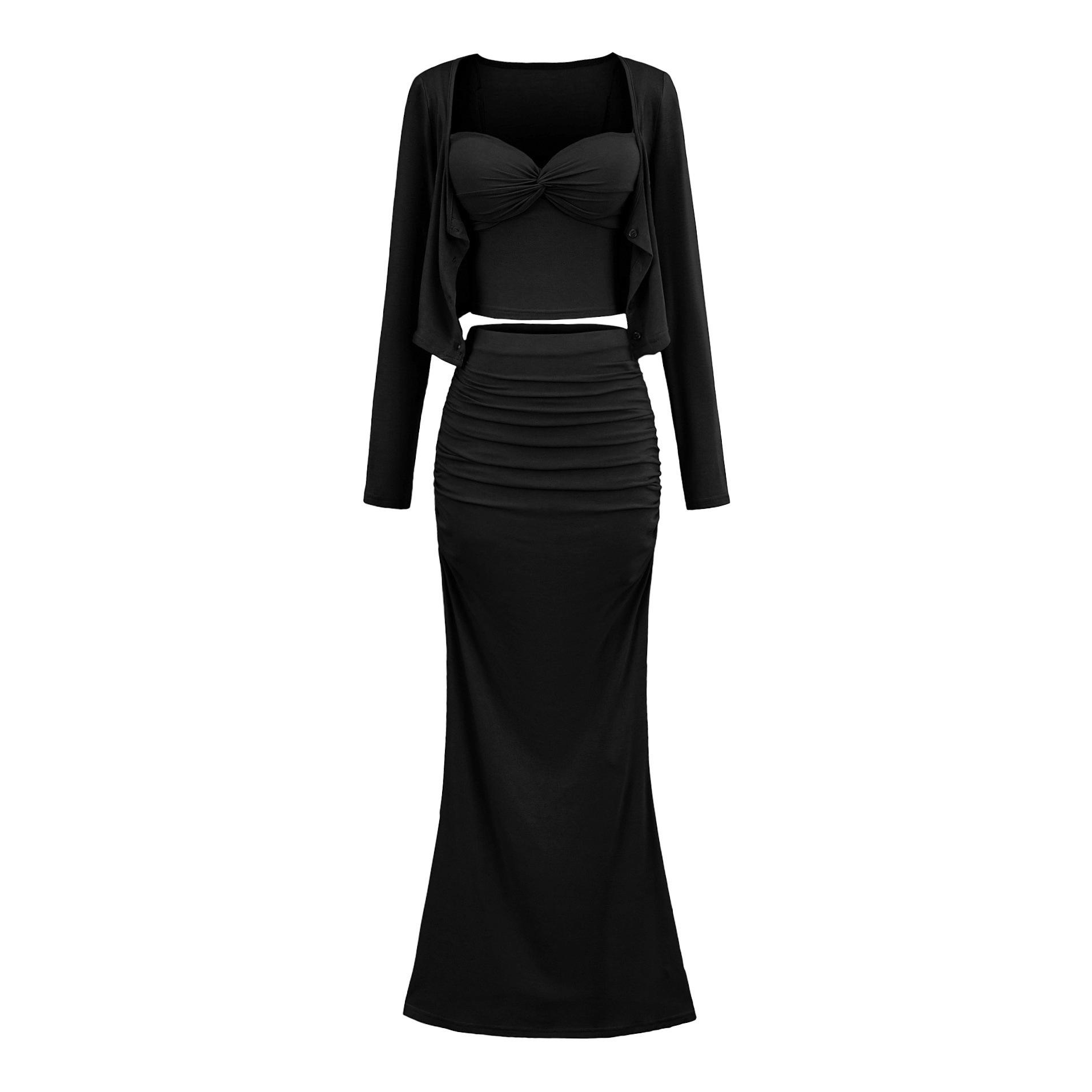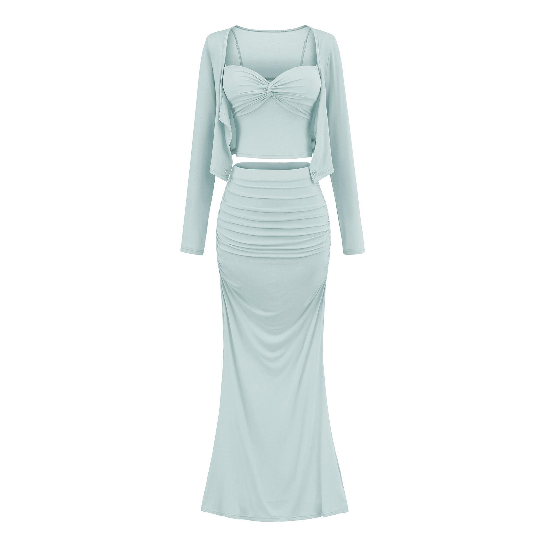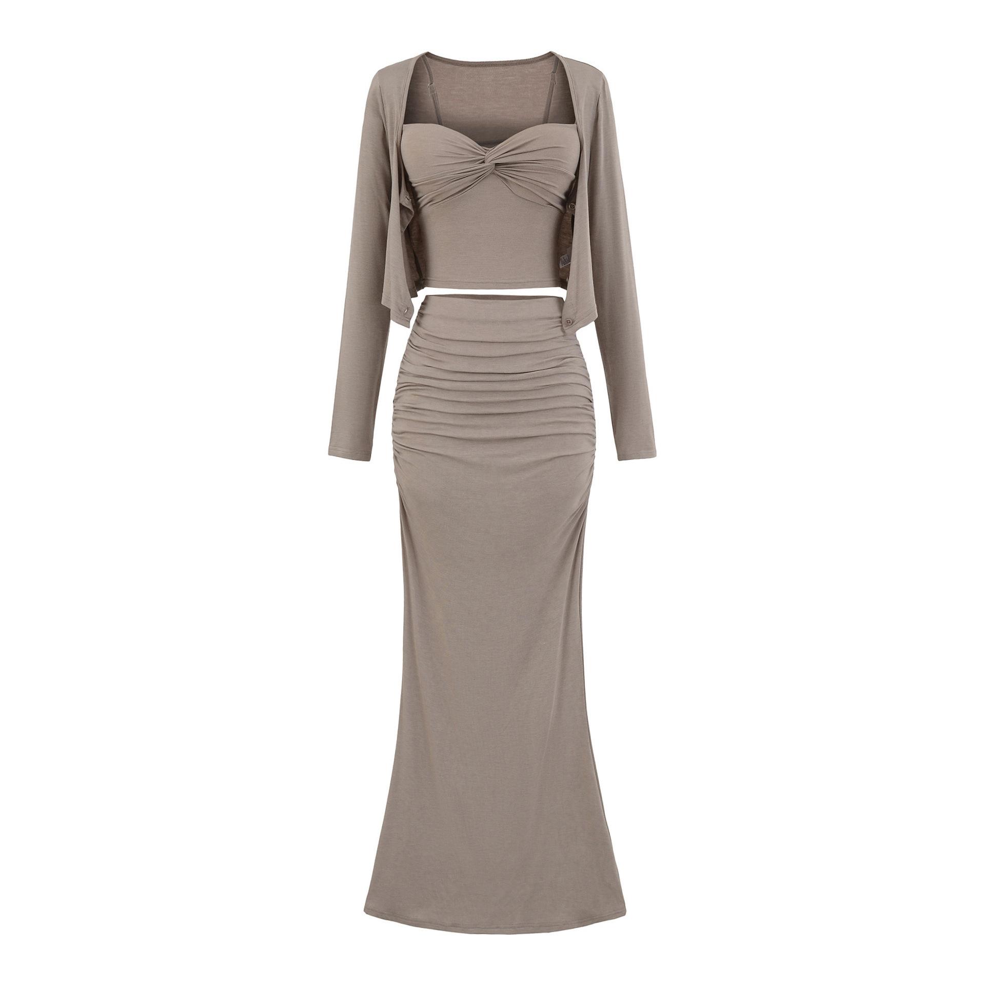 Início do Outono Nova Chegada Mulher Madura Suave High-End Cardigan de Manga Longa + Regata Camisole + Saia Midi Justa ao Quadril Conjunto de Três Peças Feminino