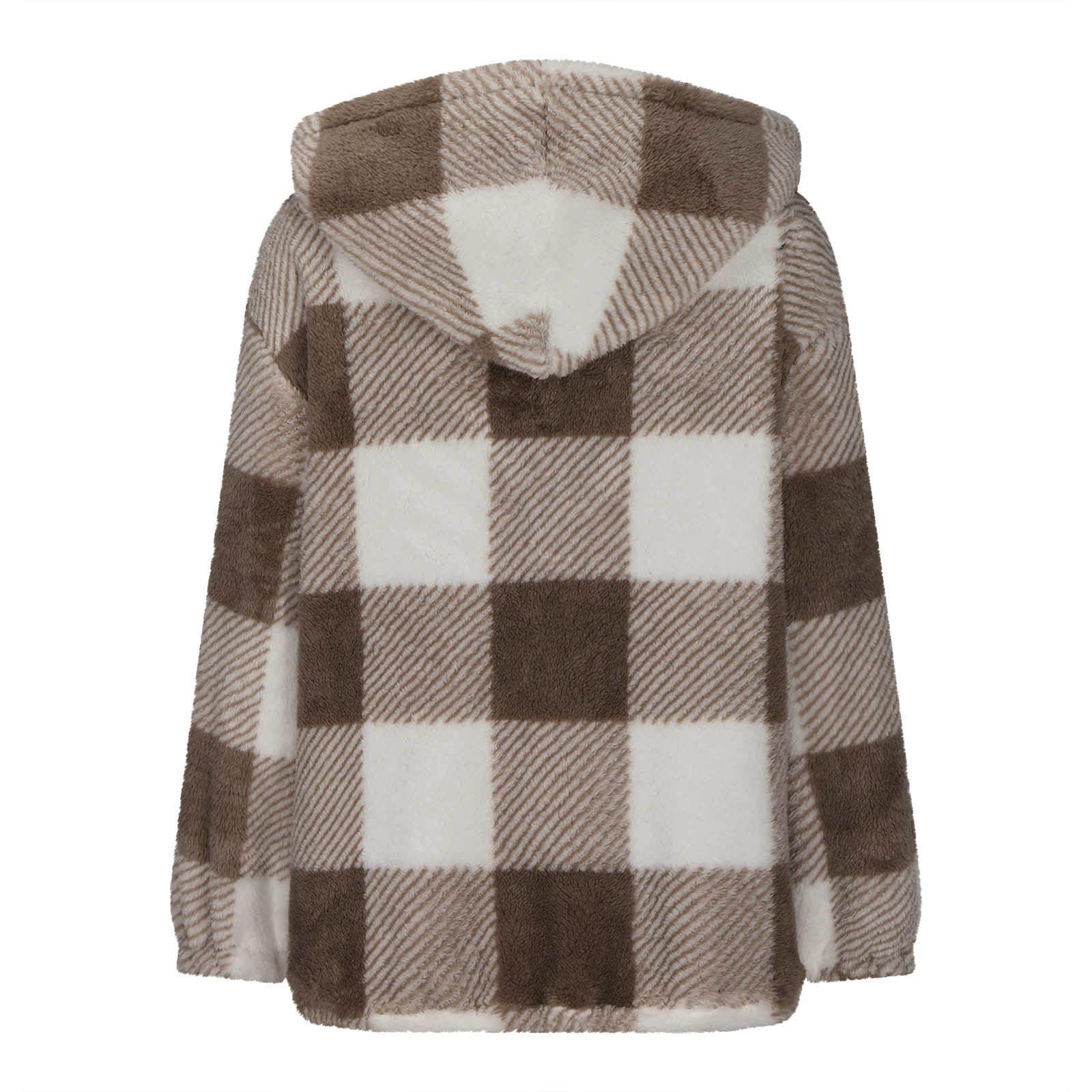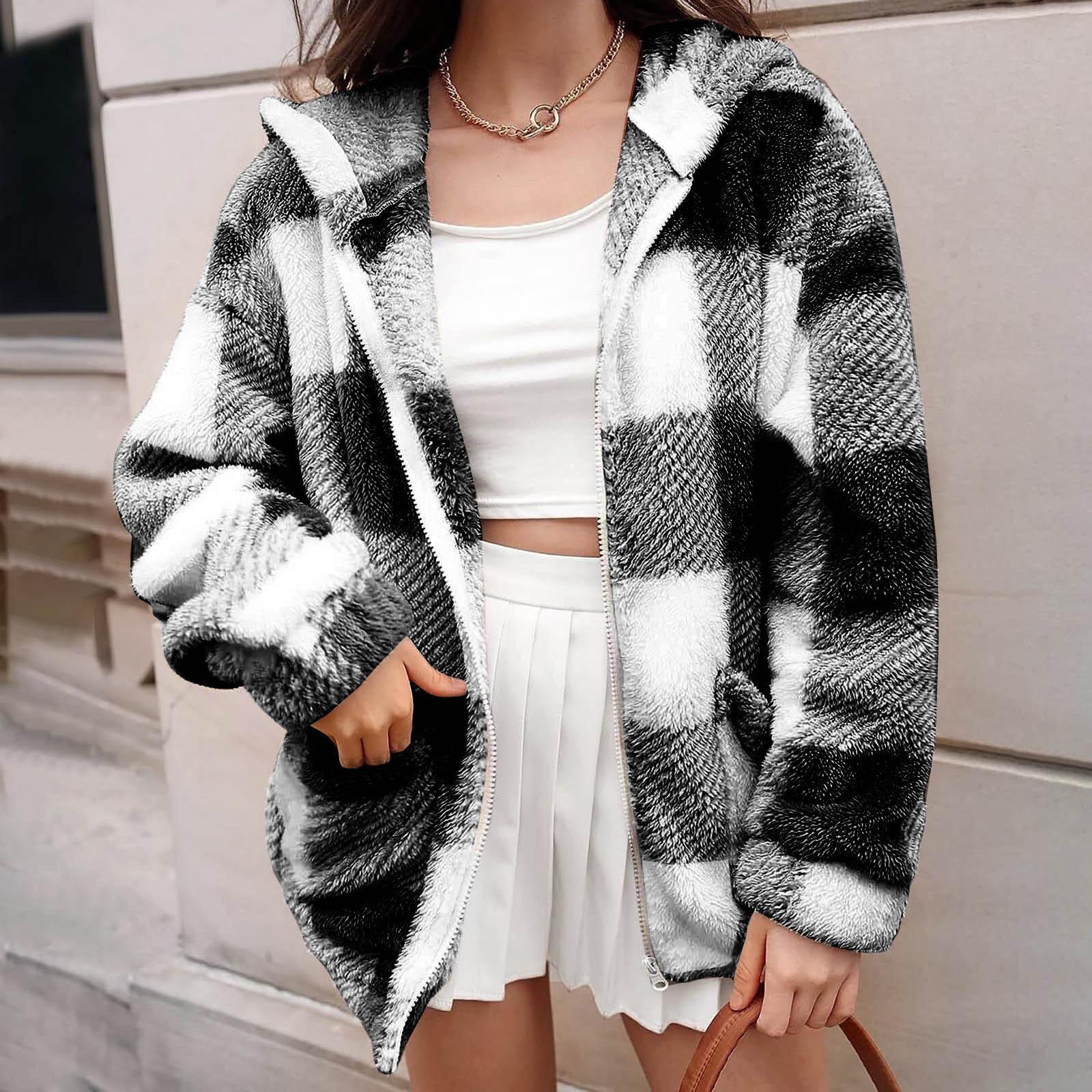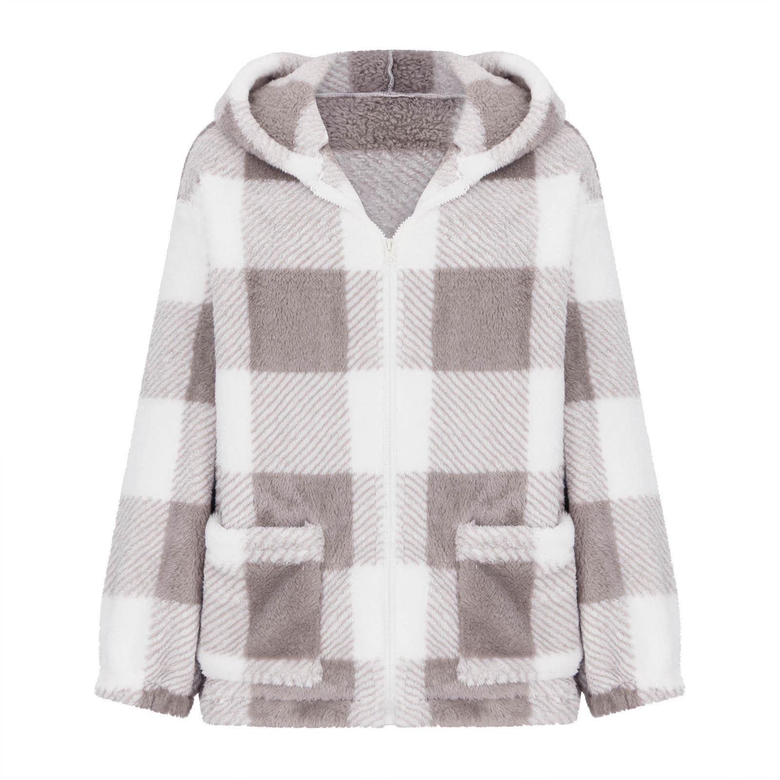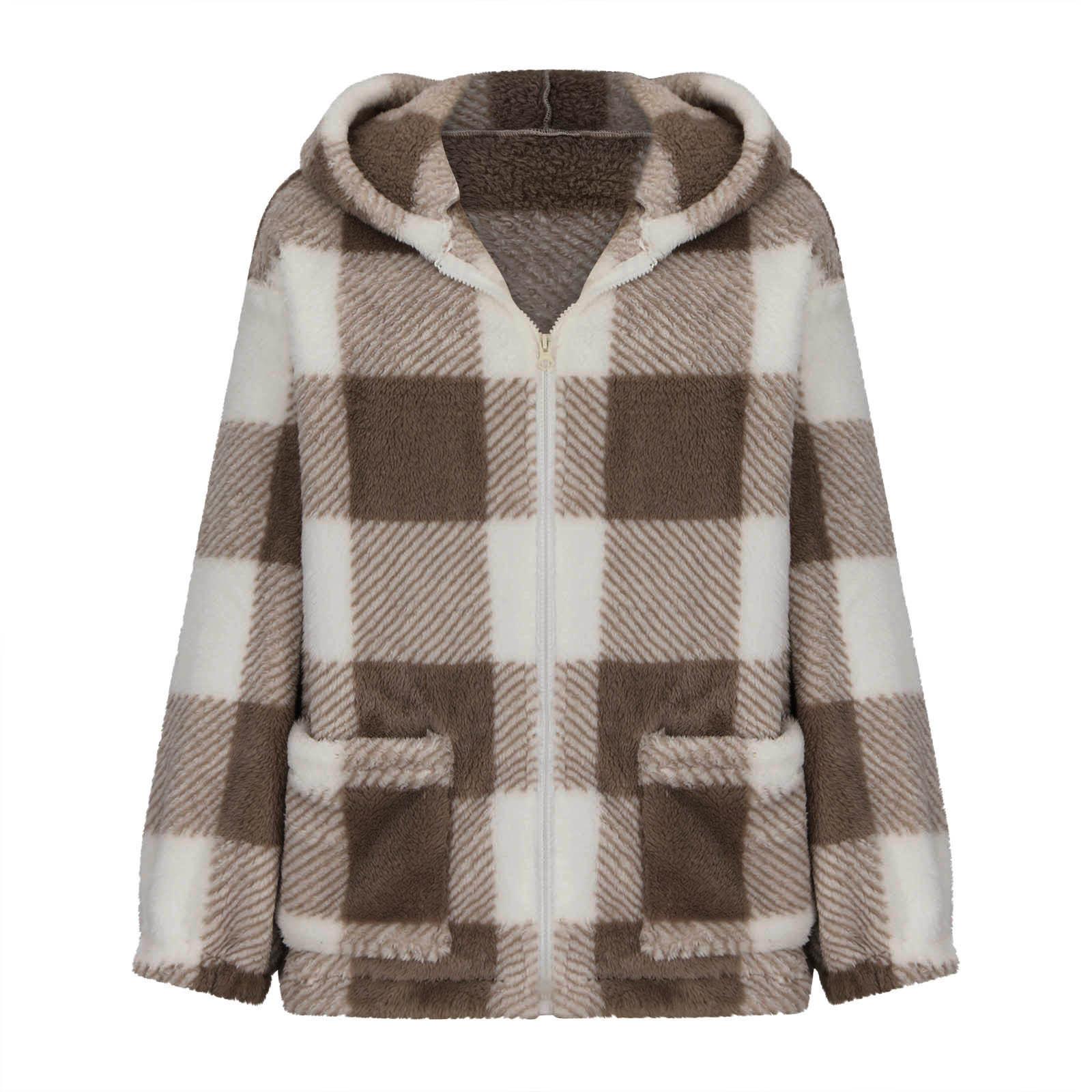 Novo 2024 Amazon Outono e Inverno Elegante Xadrez Solto Casual Manga Longa com Capuz Peludo Cardigan Jaqueta com Zíper
