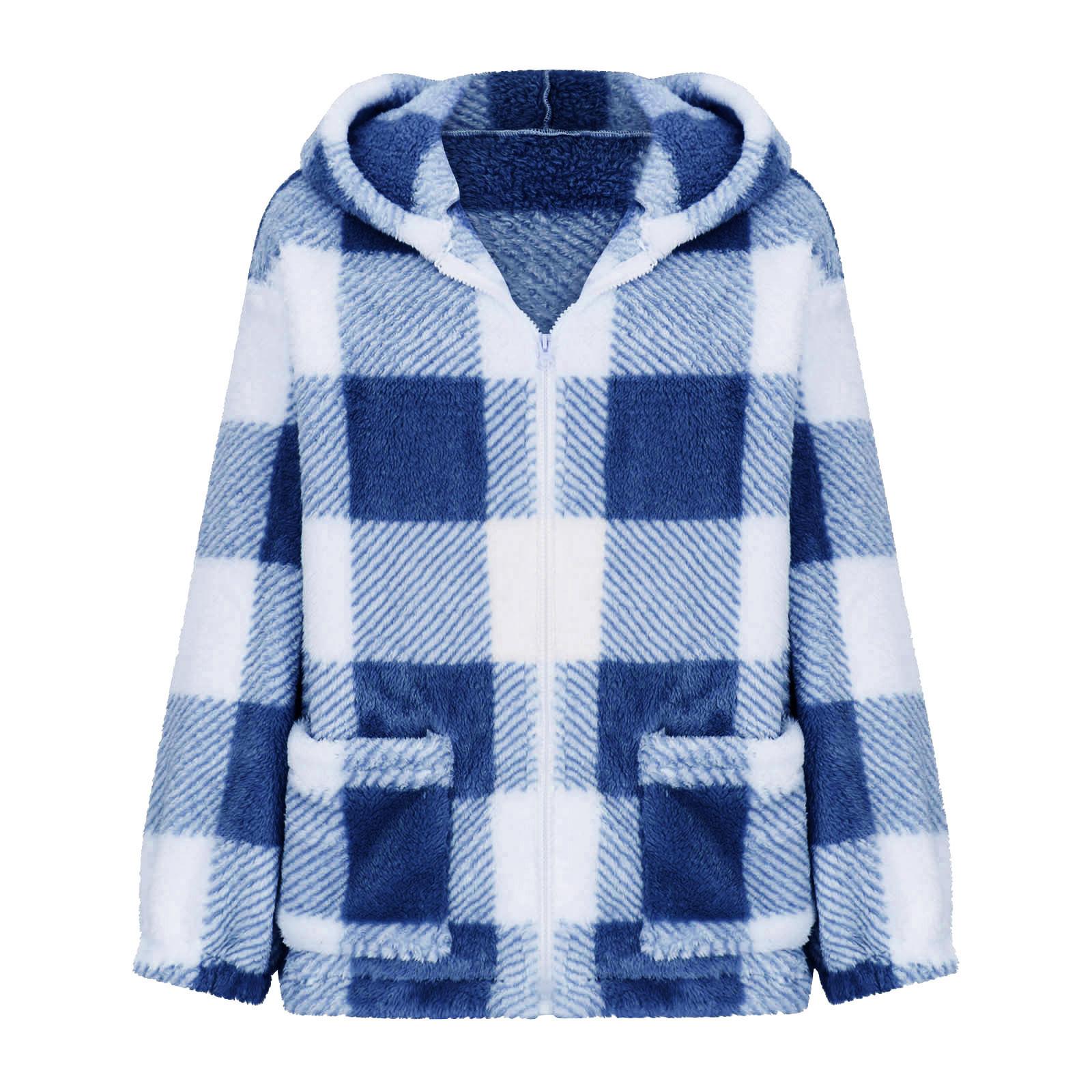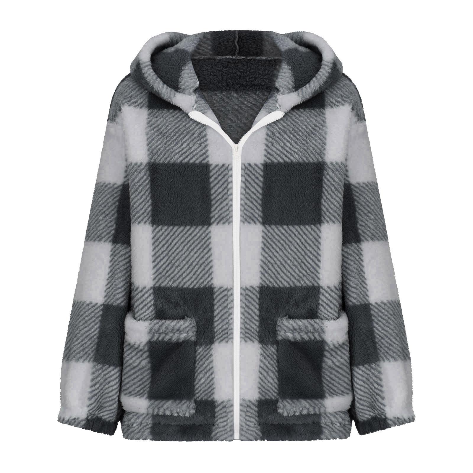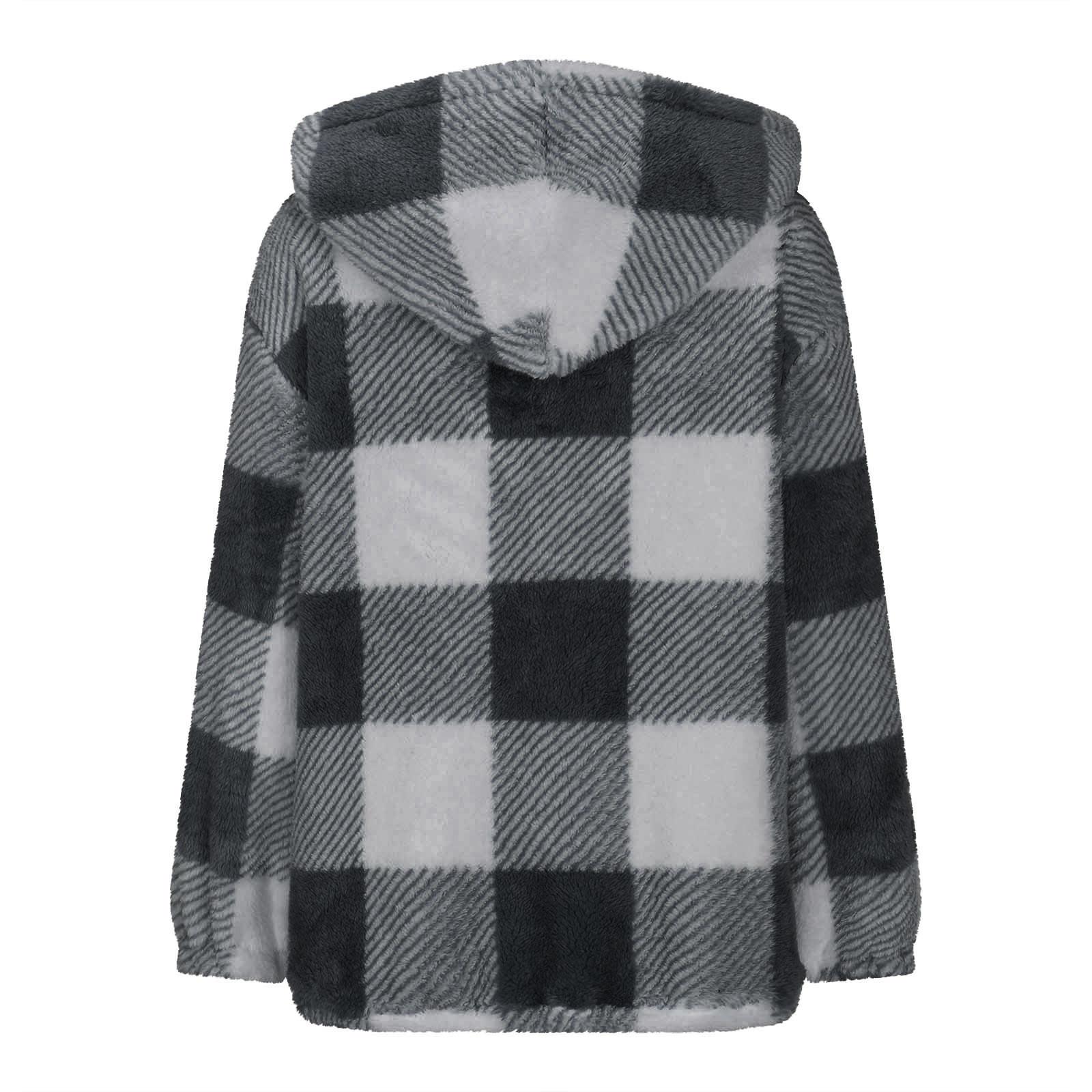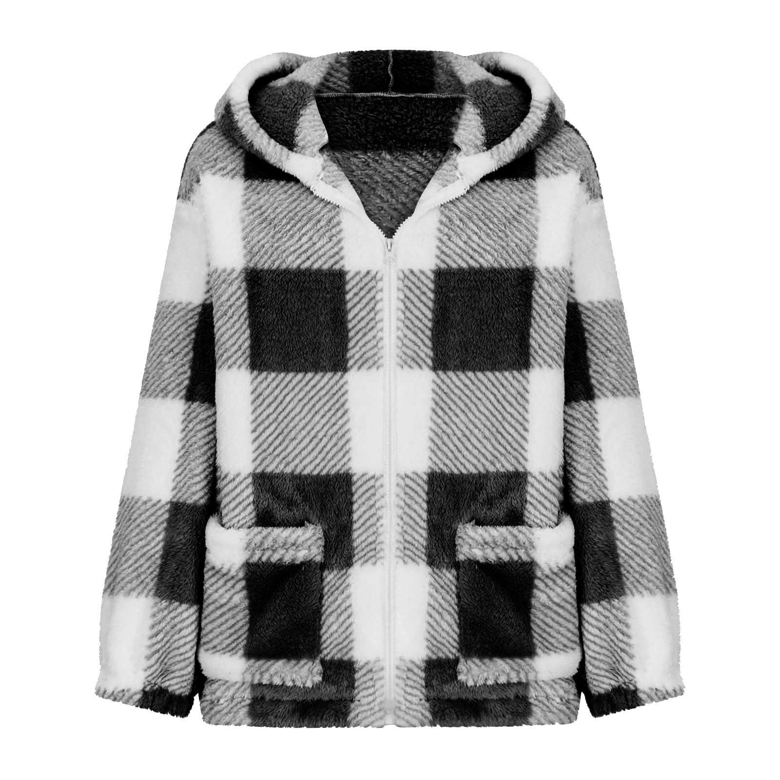 Novo 2024 Amazon Outono e Inverno Elegante Xadrez Solto Casual Manga Longa com Capuz Peludo Cardigan Jaqueta com Zíper