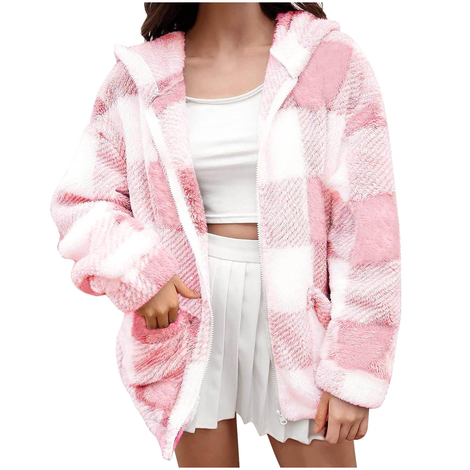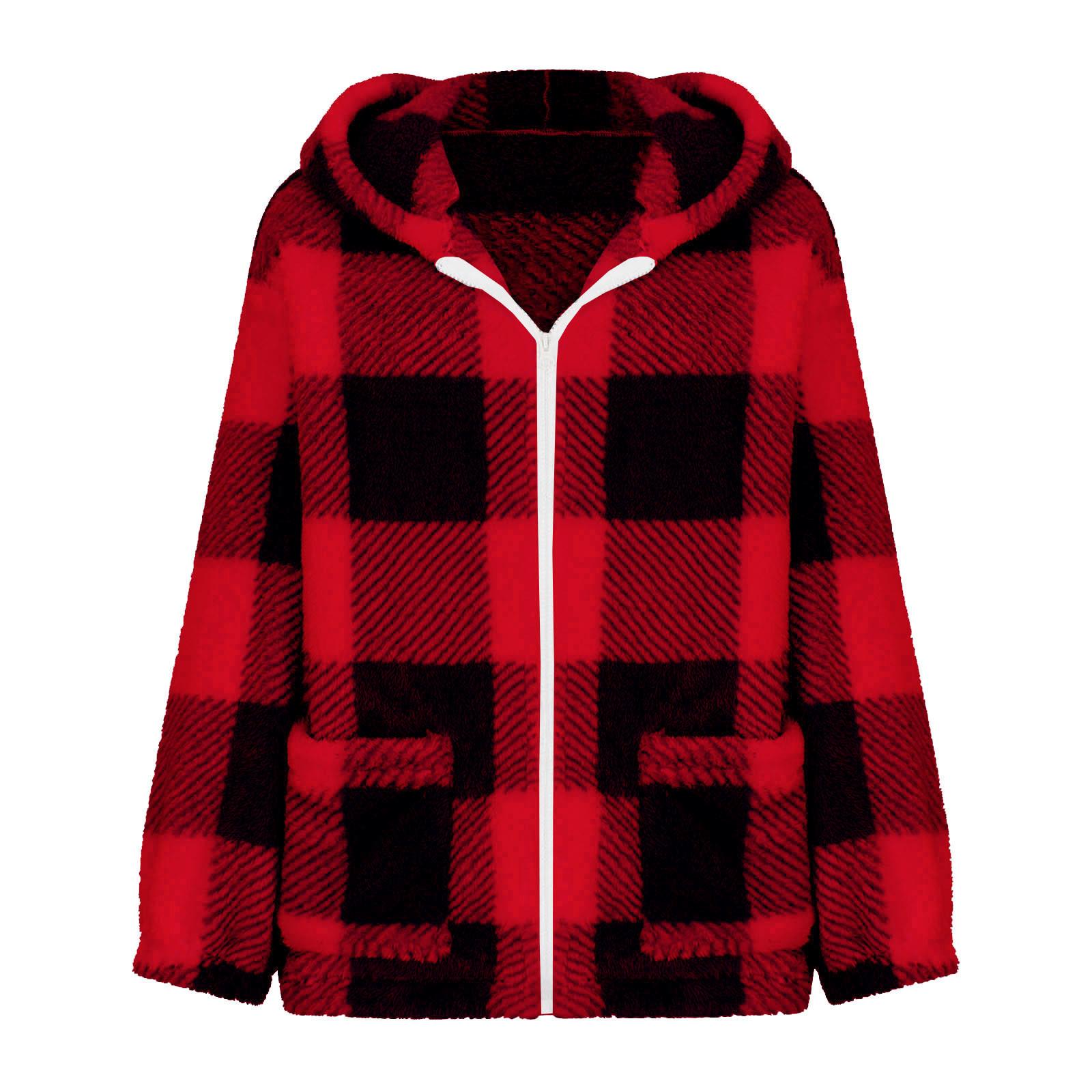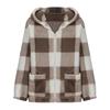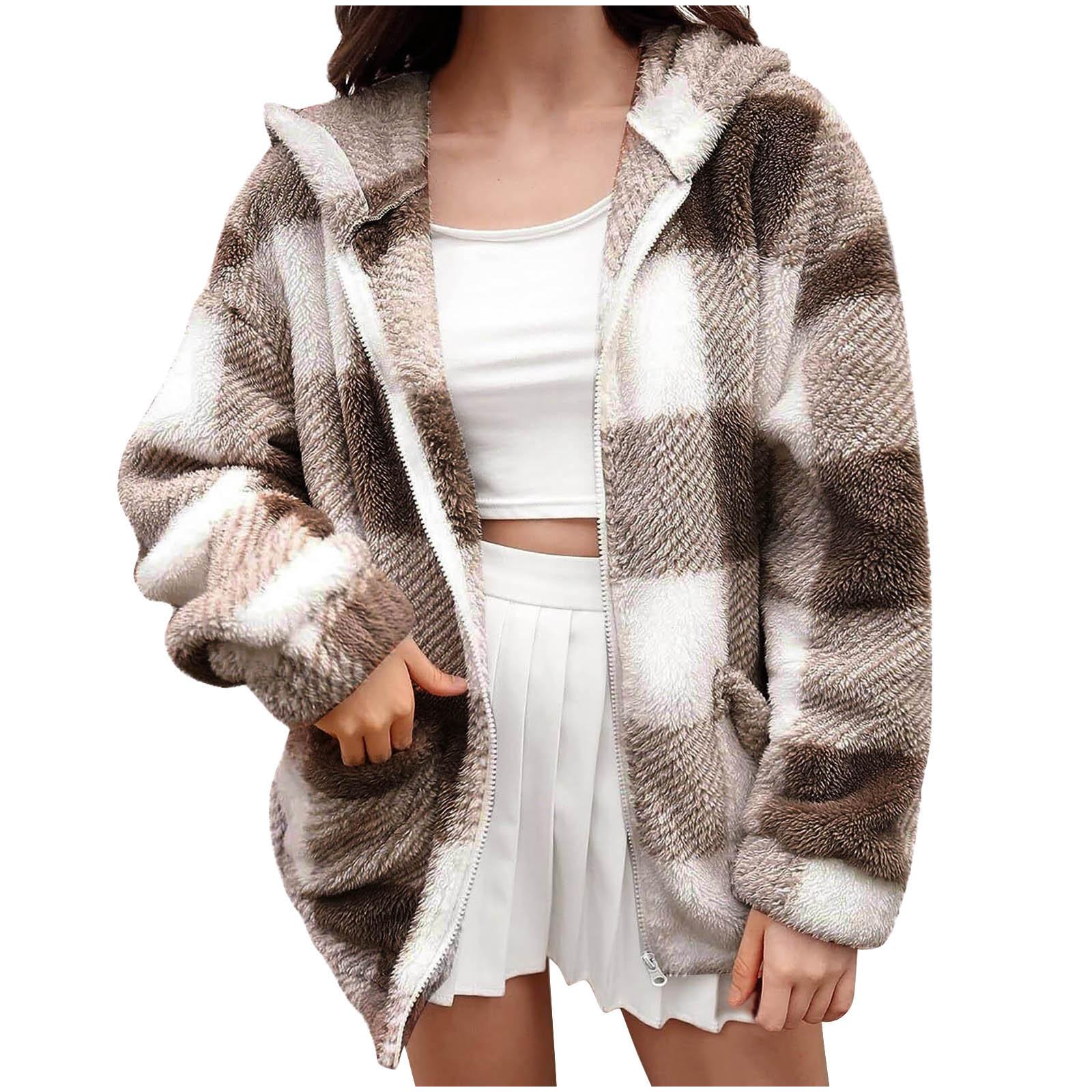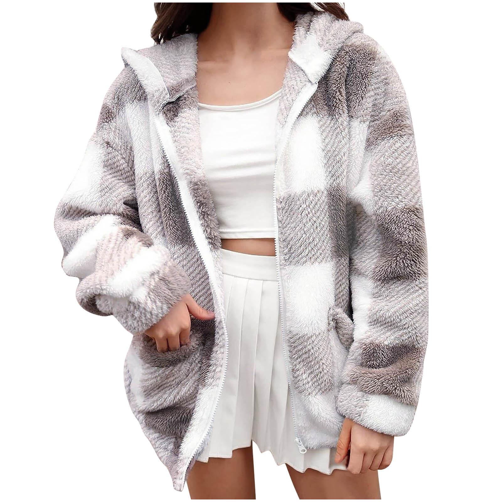 Novo 2024 Amazon Outono e Inverno Elegante Xadrez Solto Casual Manga Longa com Capuz Peludo Cardigan Jaqueta com Zíper