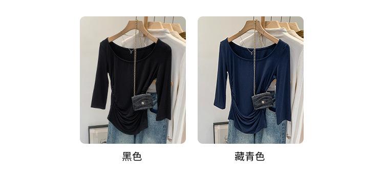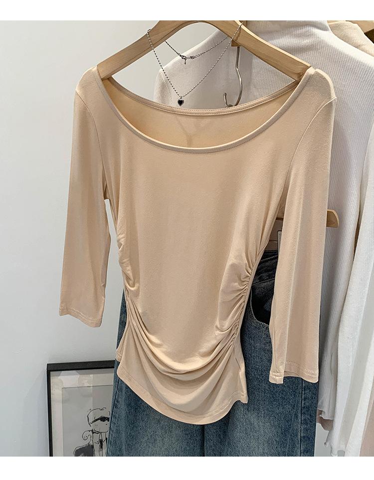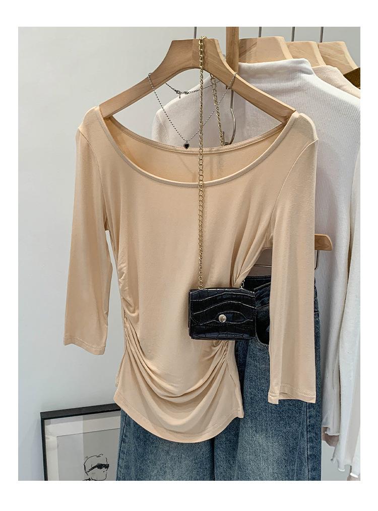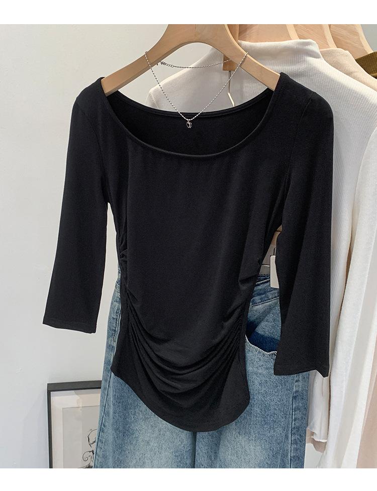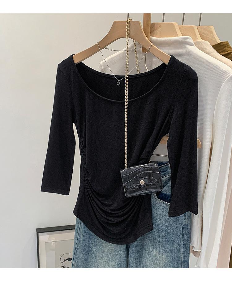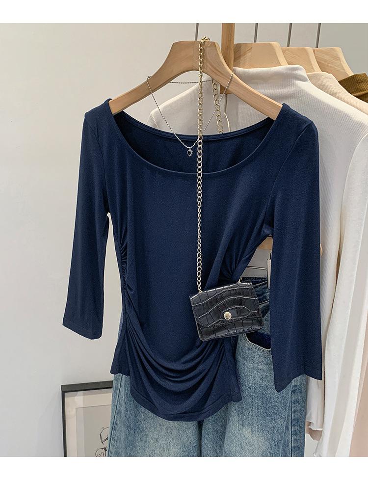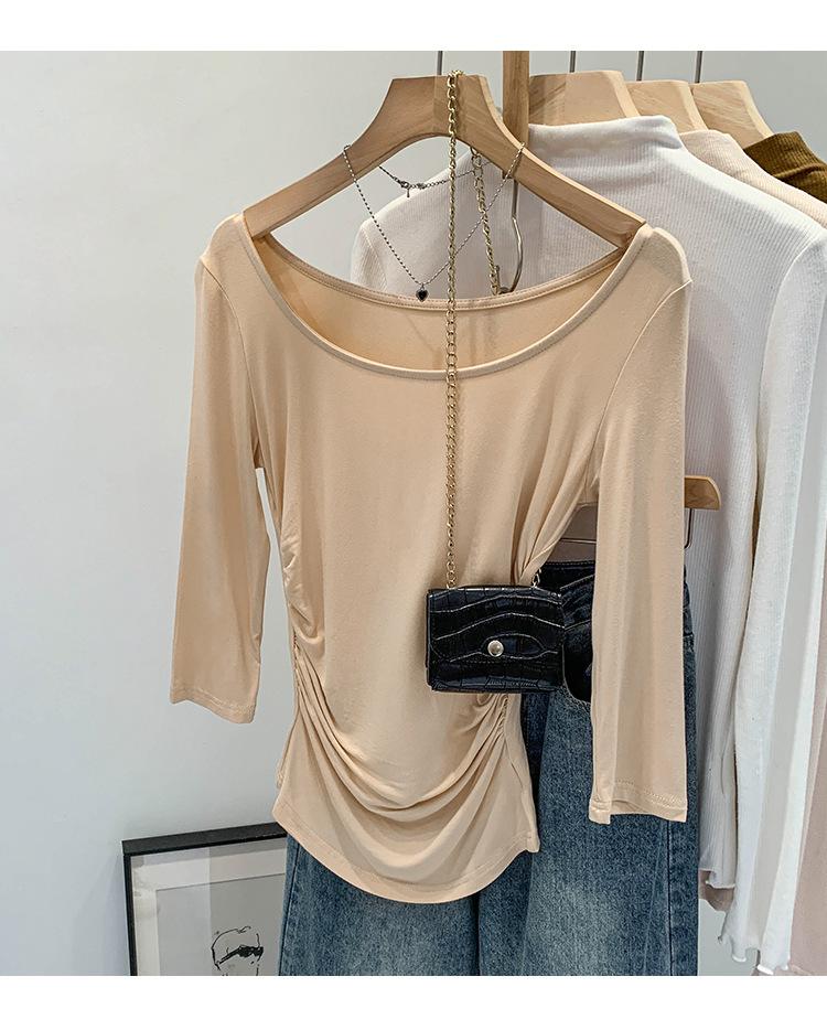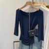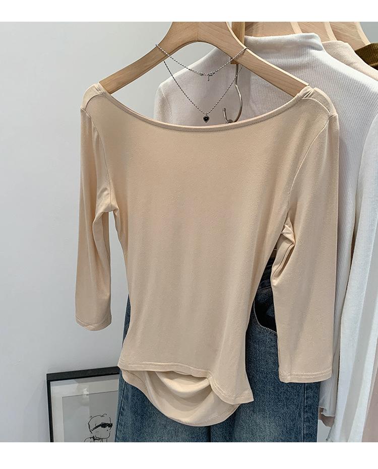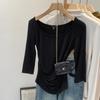 Camiseta feminina de estilo puro e sexy, decote U, ombro reto, roupa feminina moderna versão coreana 2025 outono nova, justa e que afina a silhueta, top de sete mangas