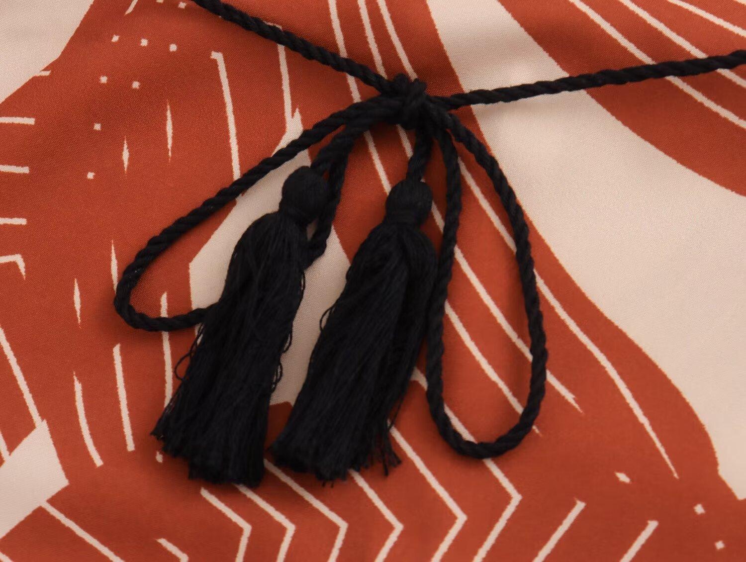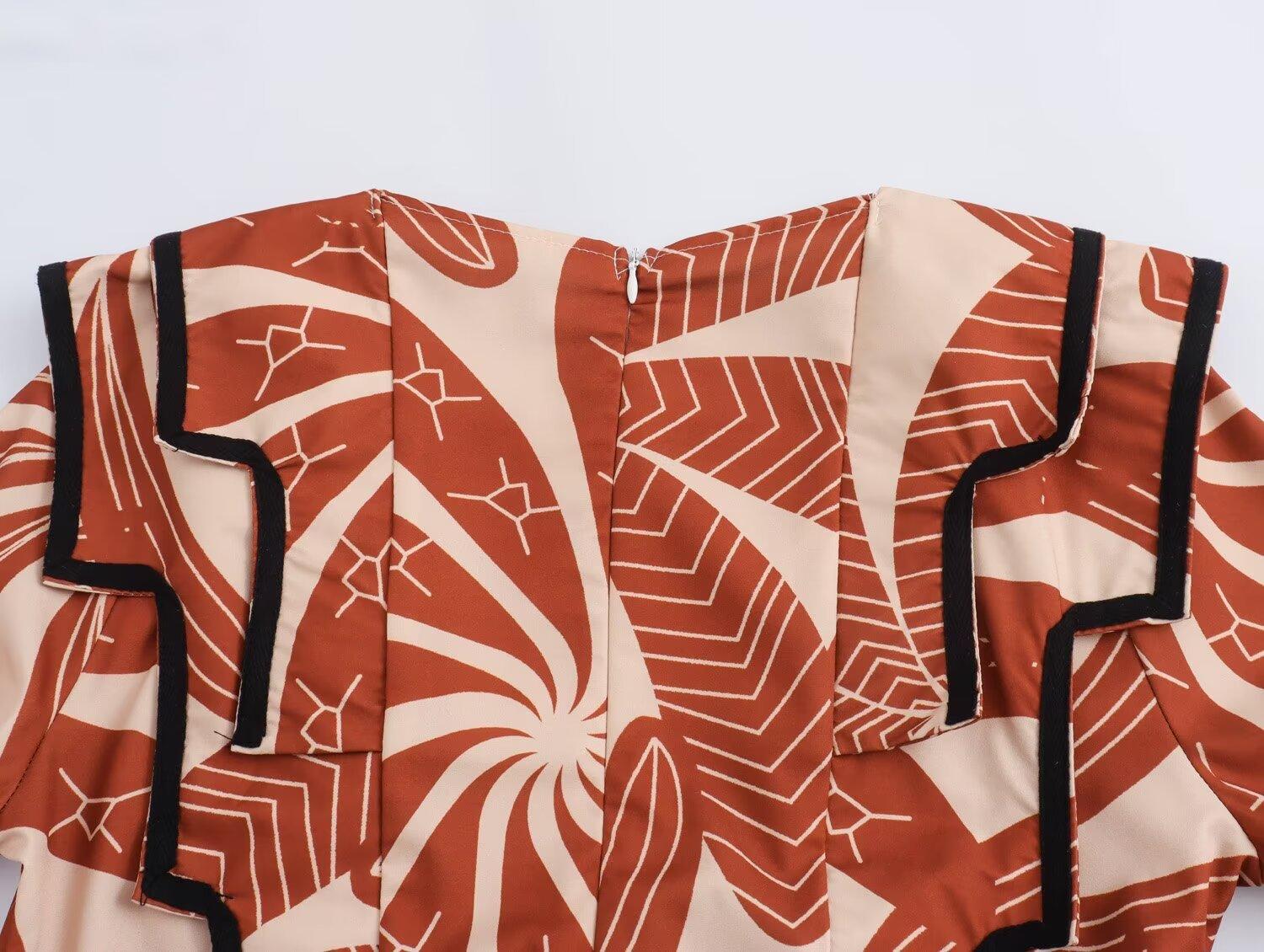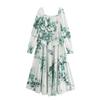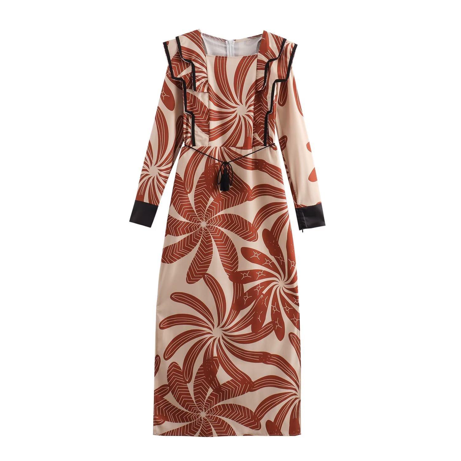 Atacado 2024 verão novo estilo europeu e americano vestido feminino com estampa localizada, gola quadrada e cintura com franjas