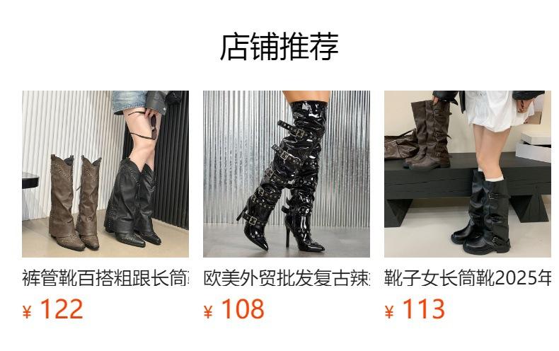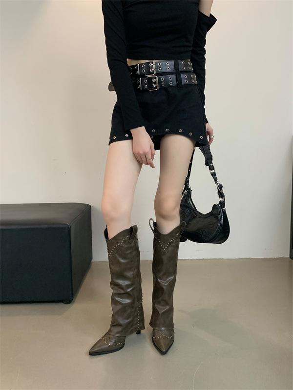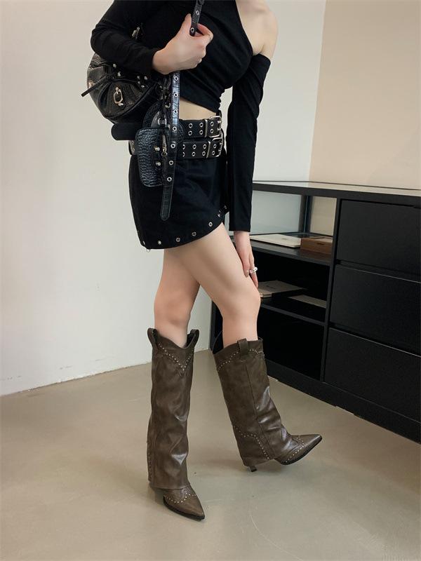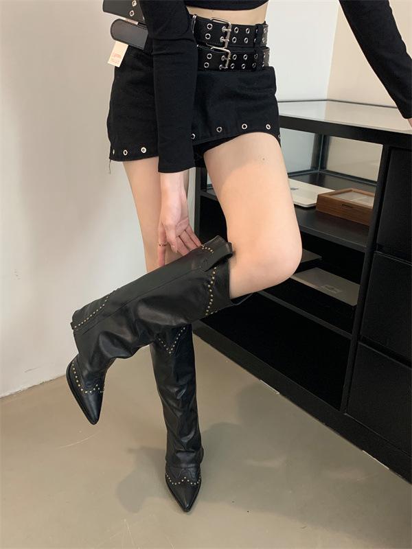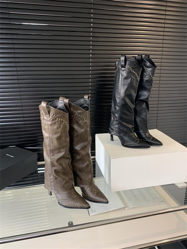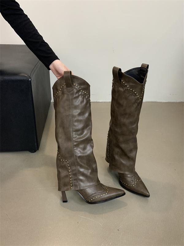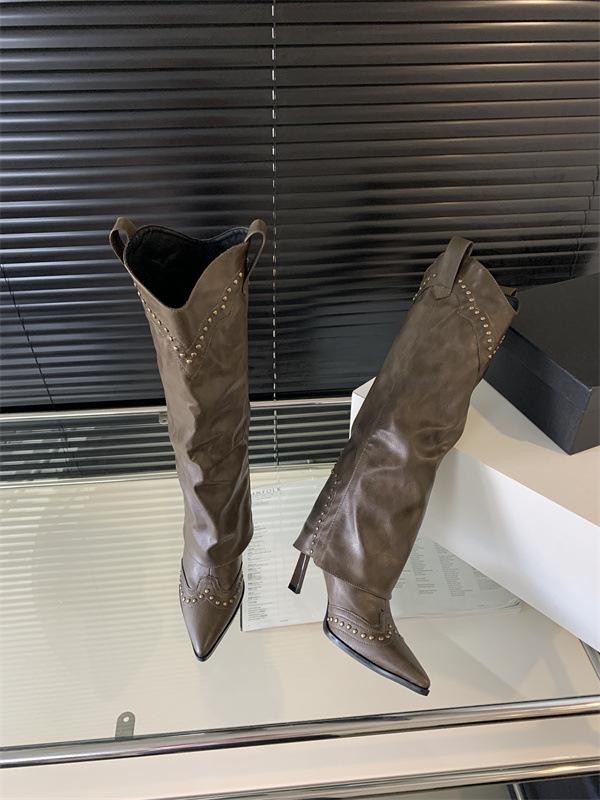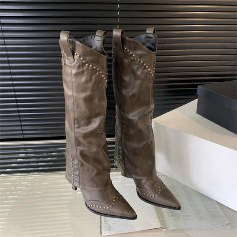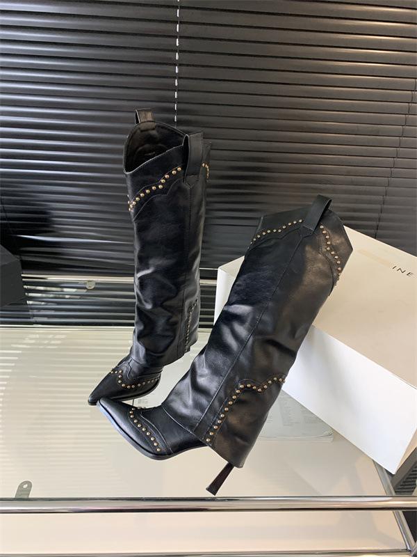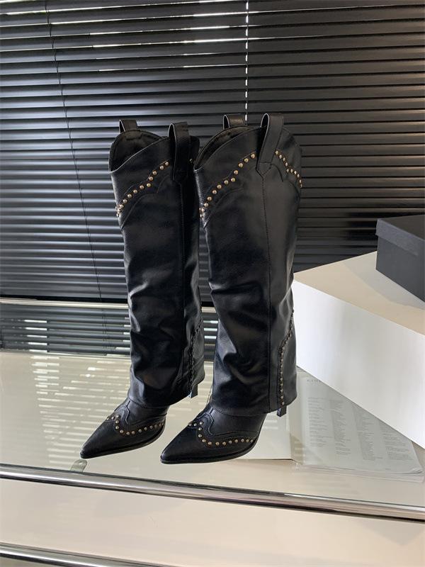 Calças Botas Botas Cowboy Western 2025 Inverno Novo Europeu e Americano Bico Fino Salto Agulha Cano Alto Rebite Botas Longas