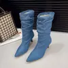 Botas de Salto Agulha Empilhadas Versáteis e Confortáveis da Moda Mulher 2025 Outono/Inverno Novas Bico Fino Cano Médio Franzidas Botas Martin Mulher
