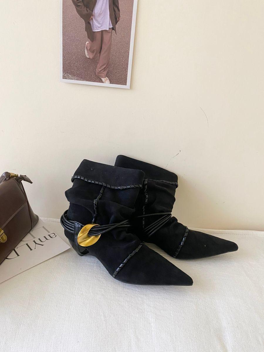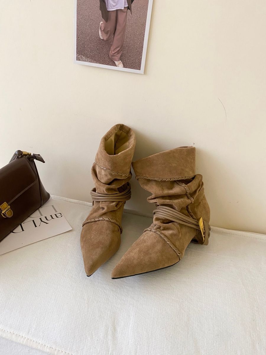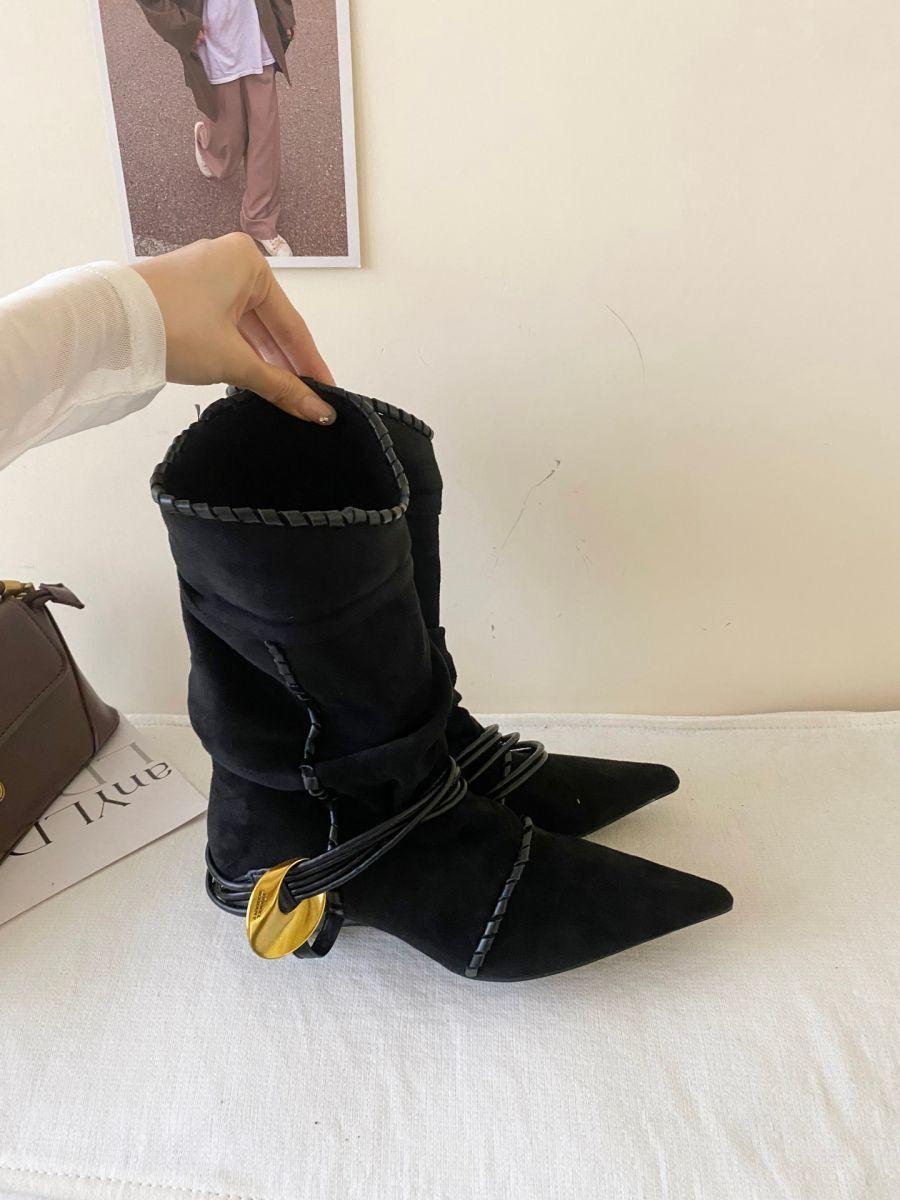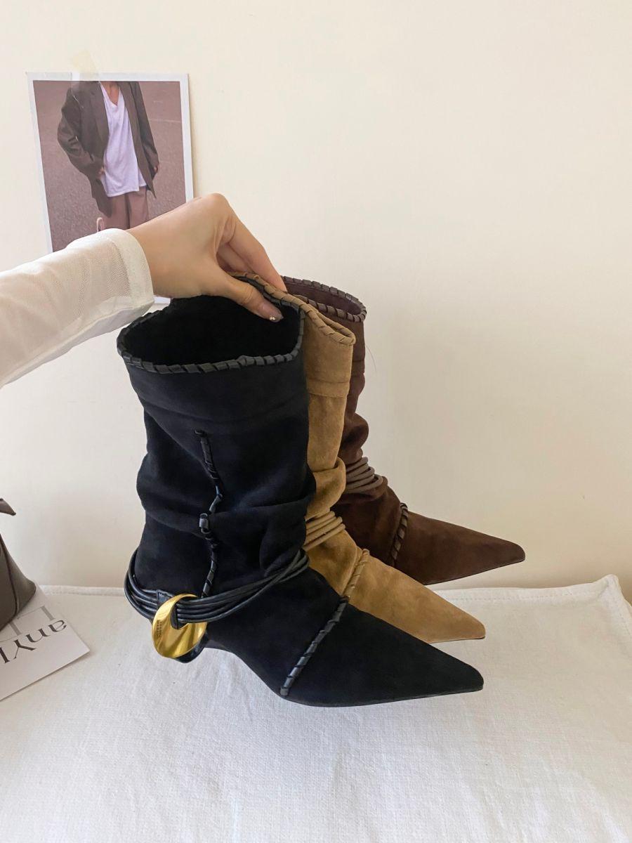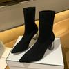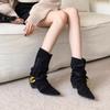 2025 Novo Outono e Inverno Bico Fino Salto Grosso Salto Médio Botins de Tornozelo Mulher Camurça Botas Skinny Elásticas Botins Curtos Mulher Botas Empilhadas