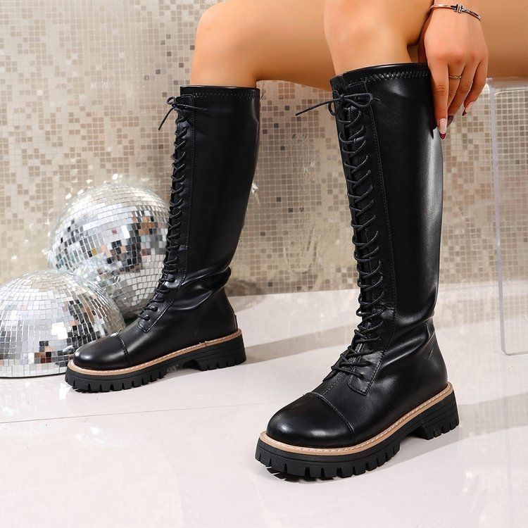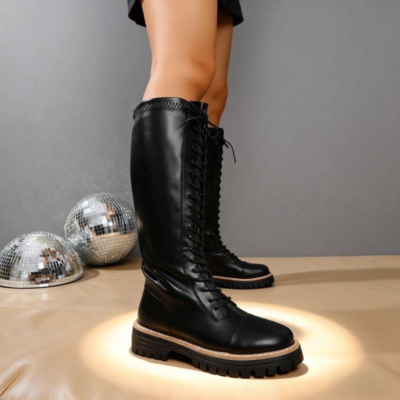 Botas de cano alto justas de sola grossa, botas até o joelho, botas de cavaleiro femininas, botas Martin de cadarço, botas de couro acima do joelho, novo outono/inverno 2025