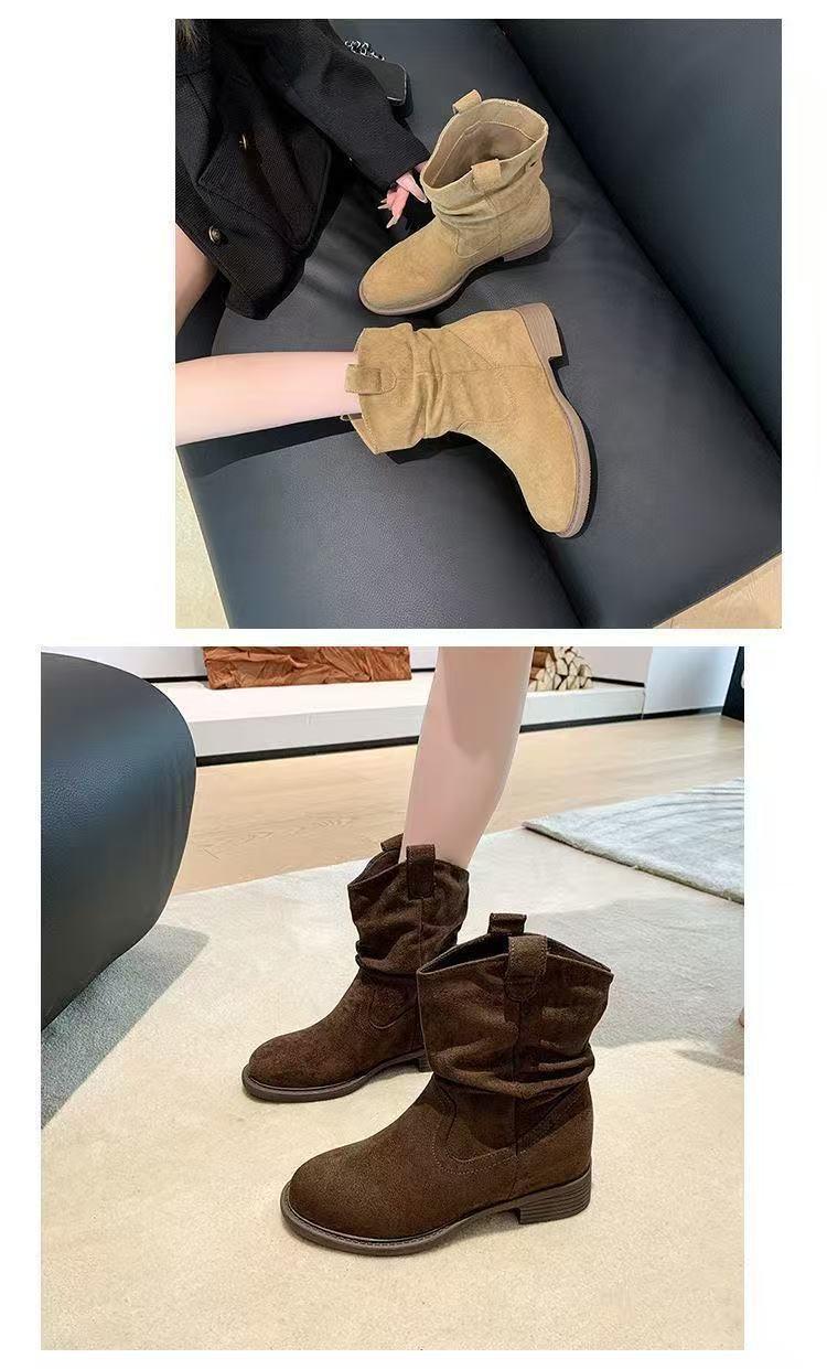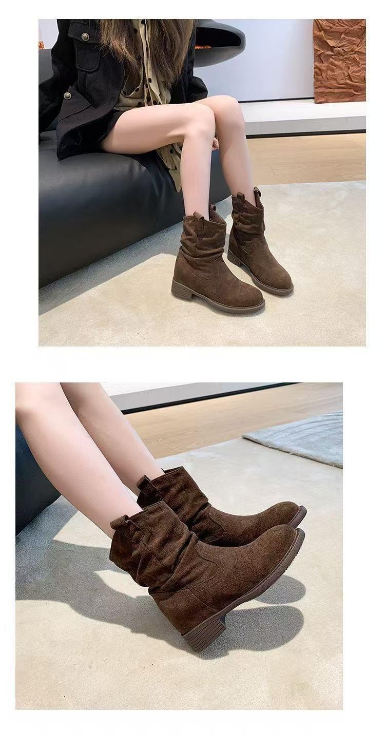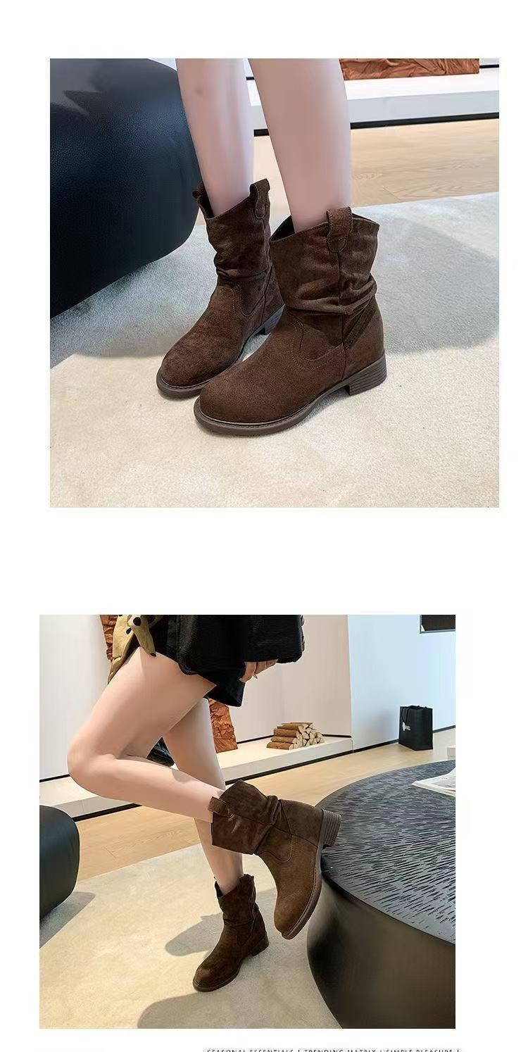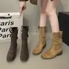 Botas Cowboy Retro Cáqui Empilhadas Botas Cowboy Mulher 2025 Outono e Inverno Novo Aumento Interno Salto Grosso Superfície Macia Botas Martin Mulher