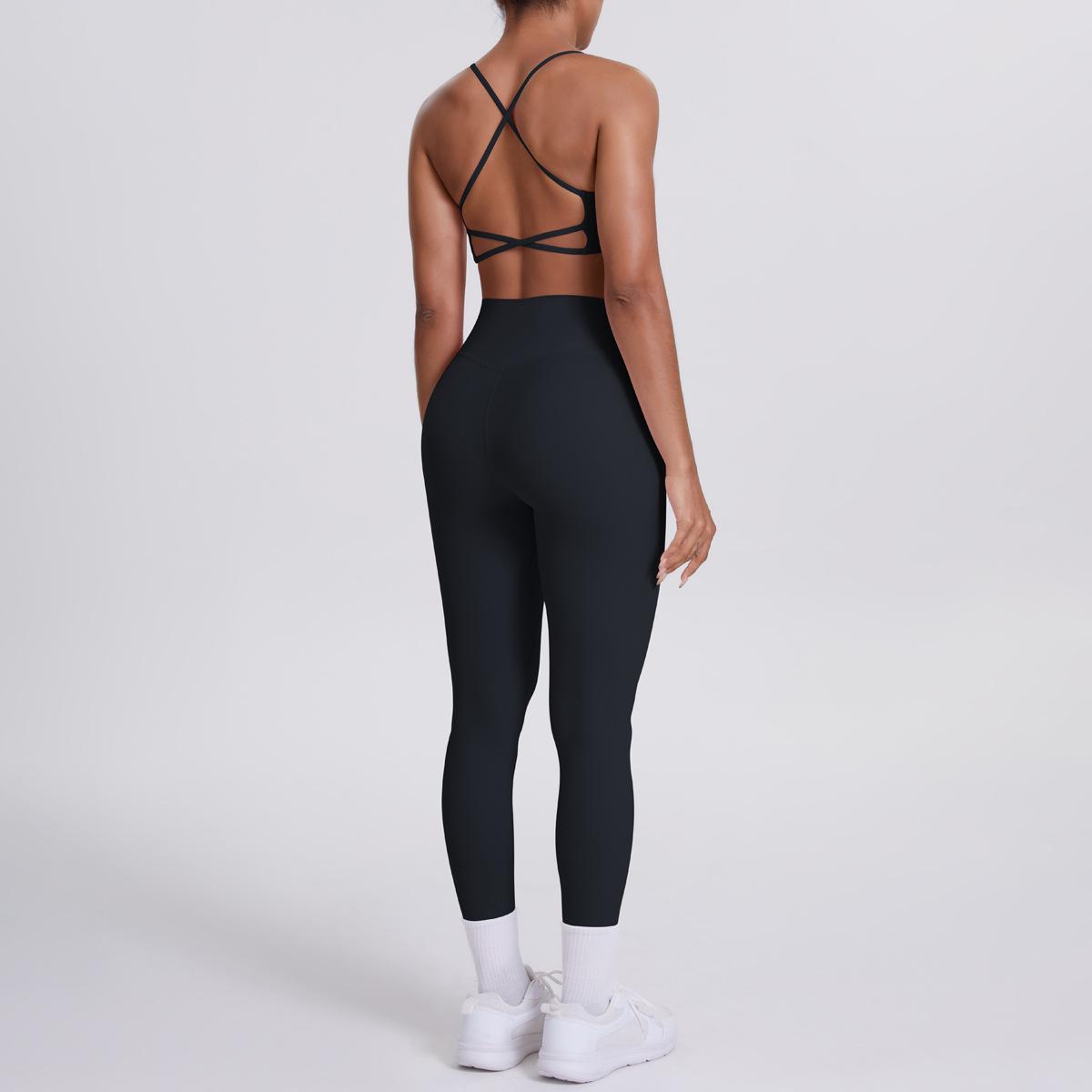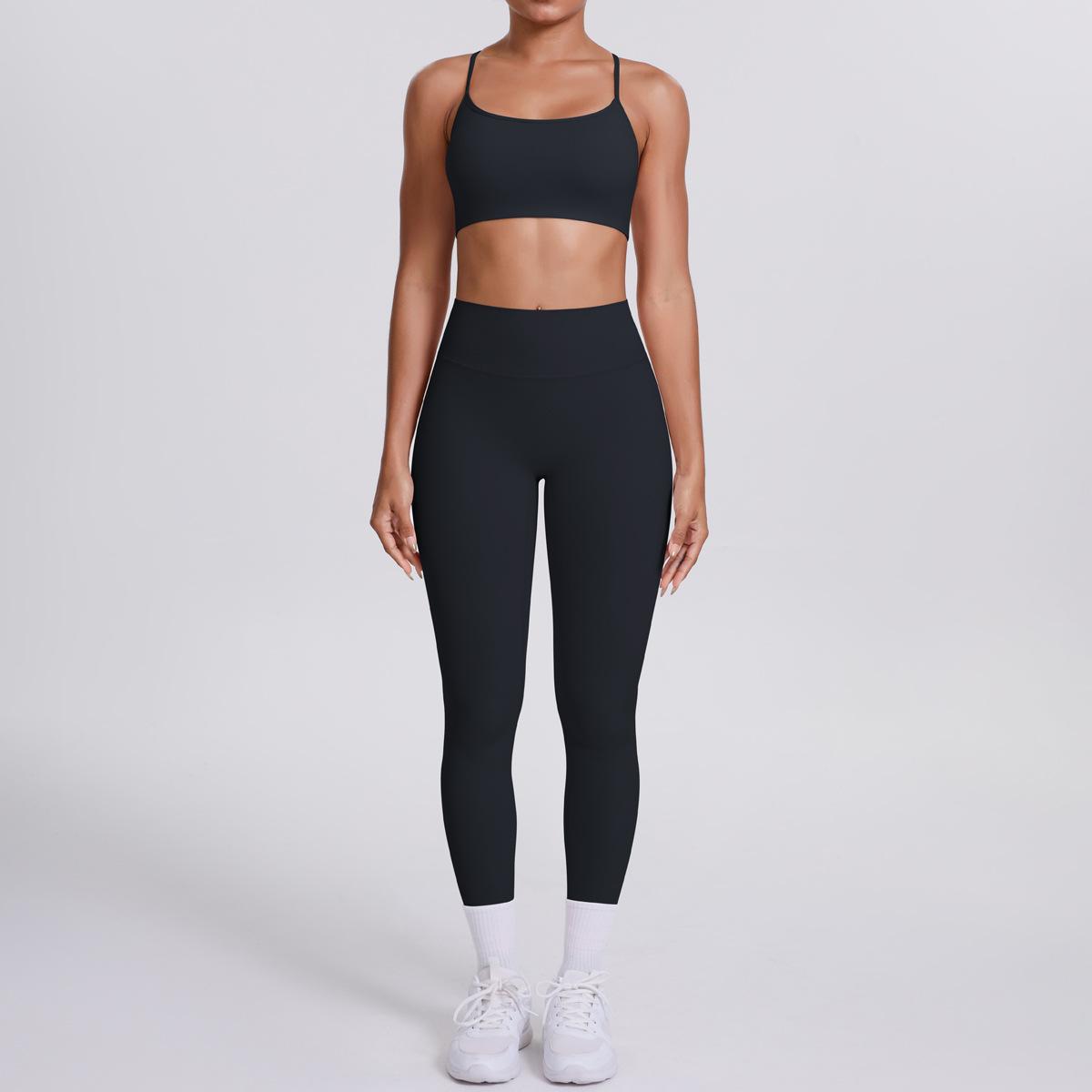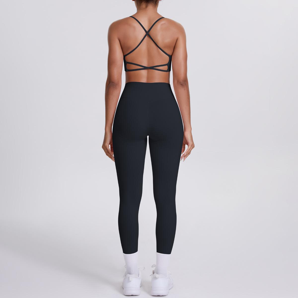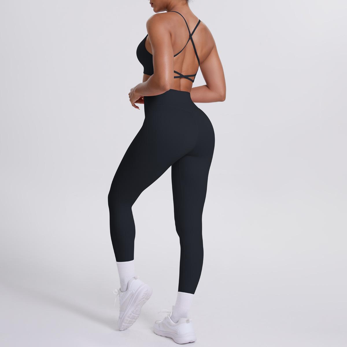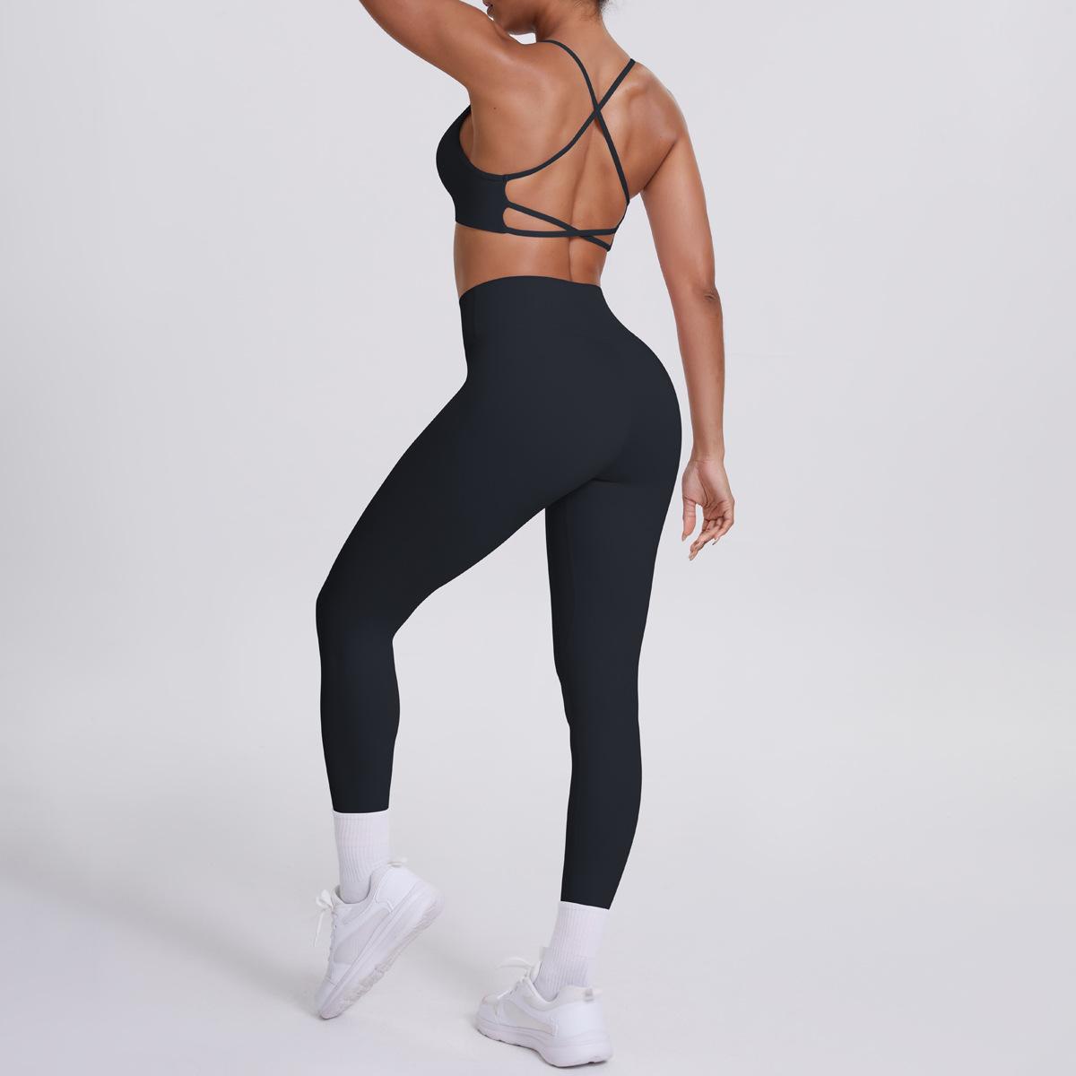 Novo Macacão de Yoga Esportivo Transfronteiriço Europeu e Americano de Nylon de Lado Duplo com Costas Bonitas e Ajustadas Cruzadas para Corrida e Fitness Conjunto de Duas Peças