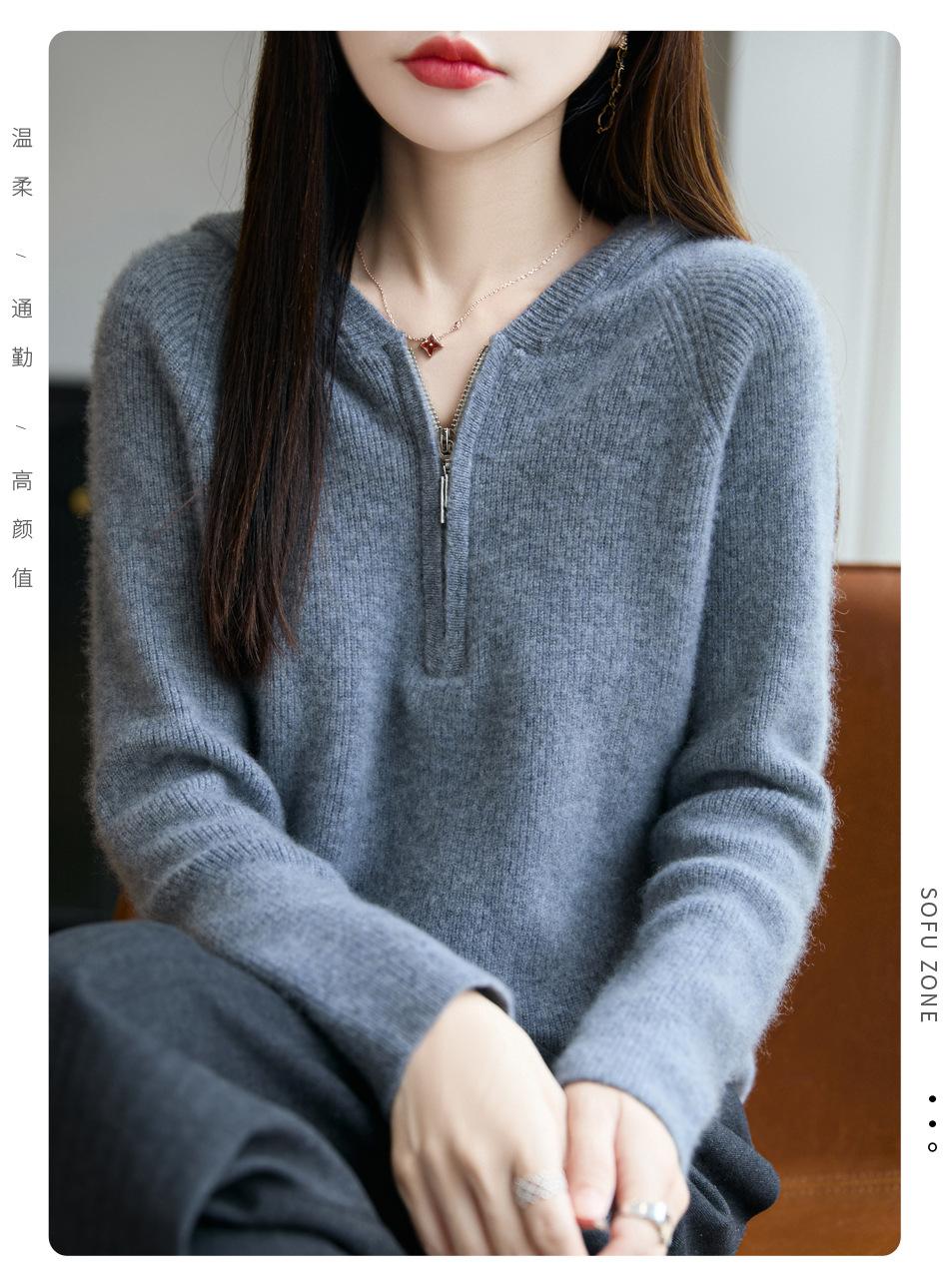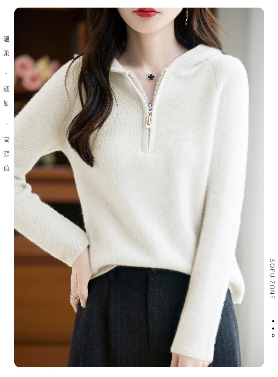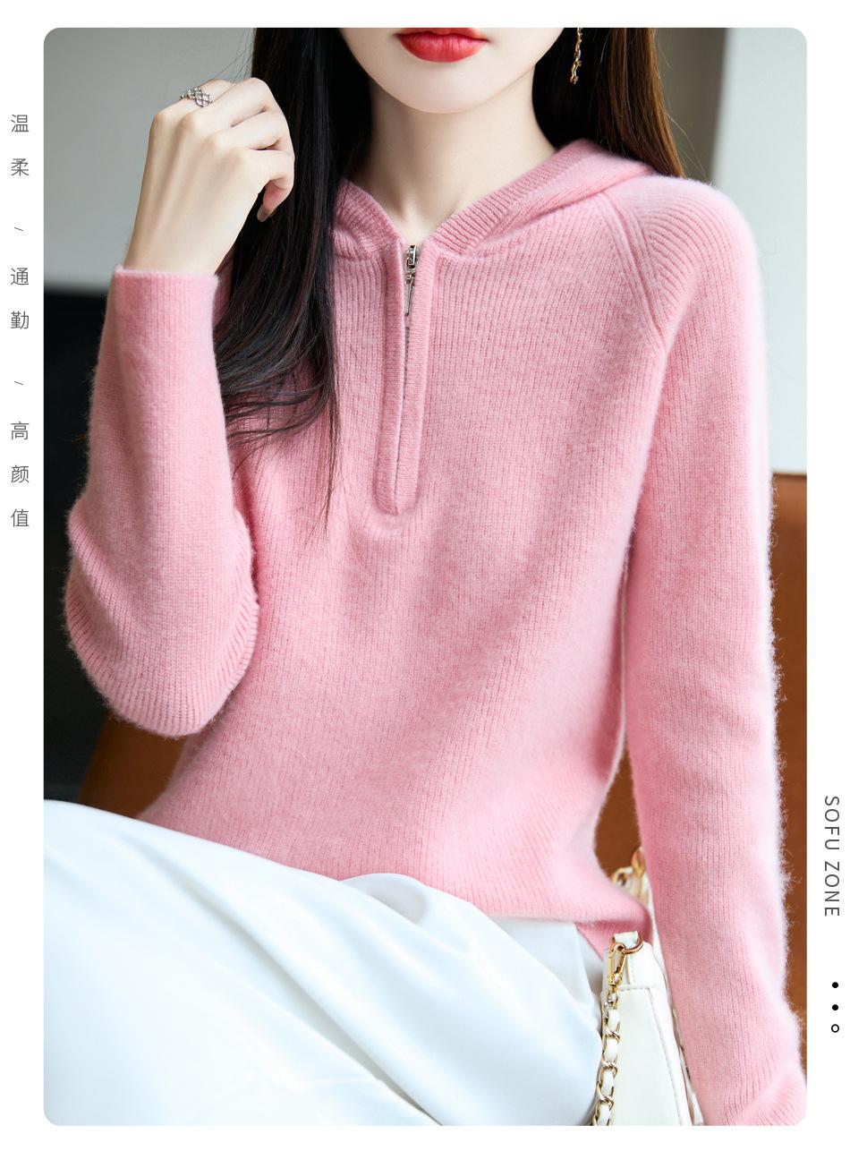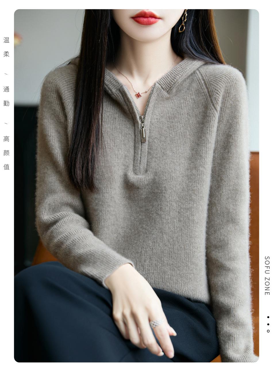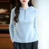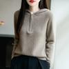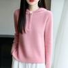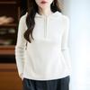 Suéter Tricotado de Lã Pura com Capuz e Meio Zíper Outono/Inverno 2025 Manga Longa Feminino Cor Sólida Macio Quente Camada Base