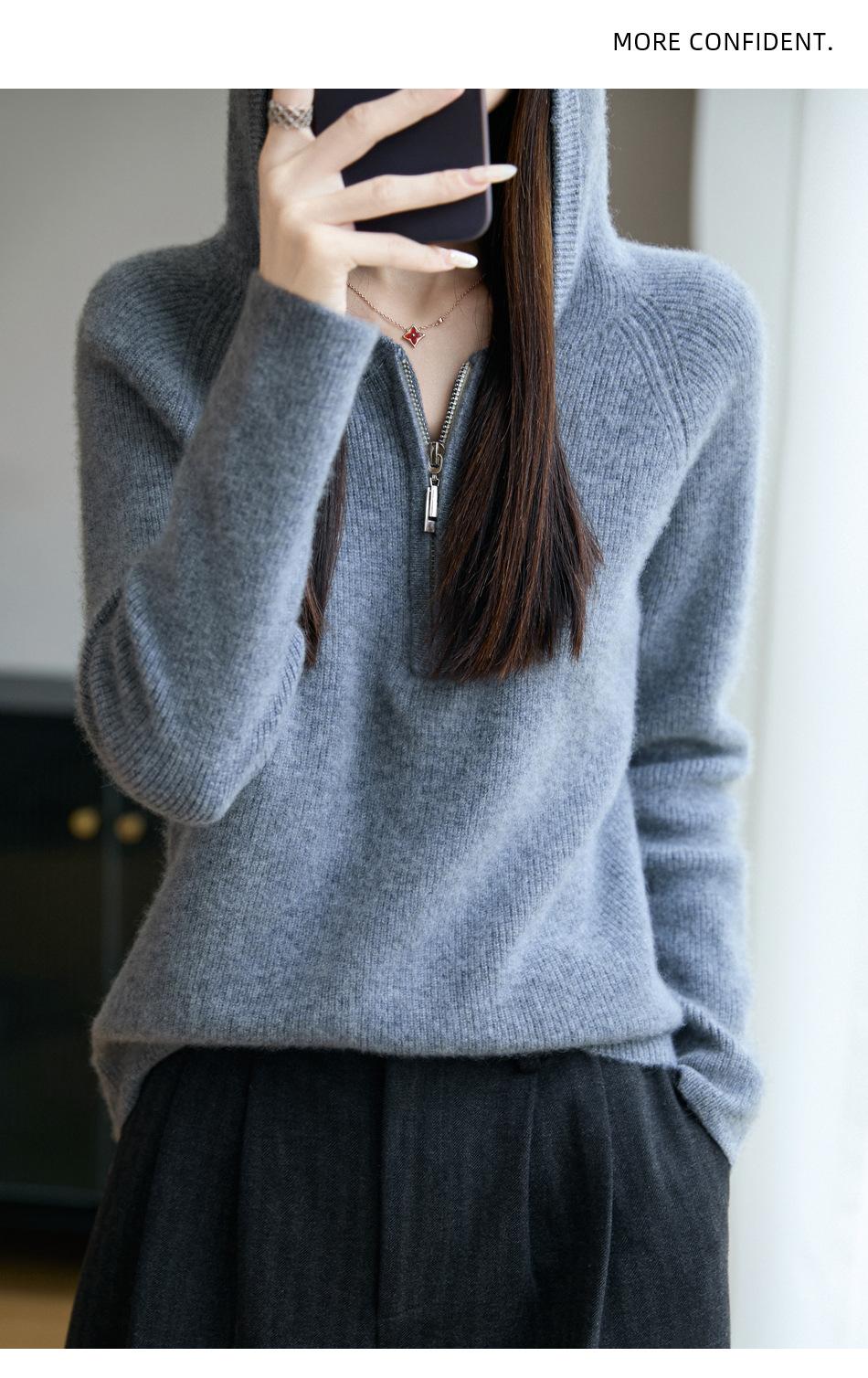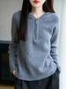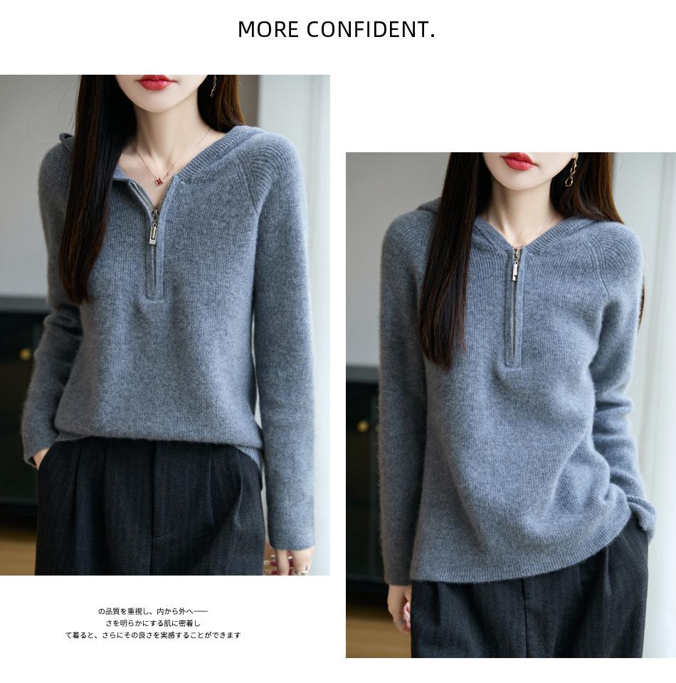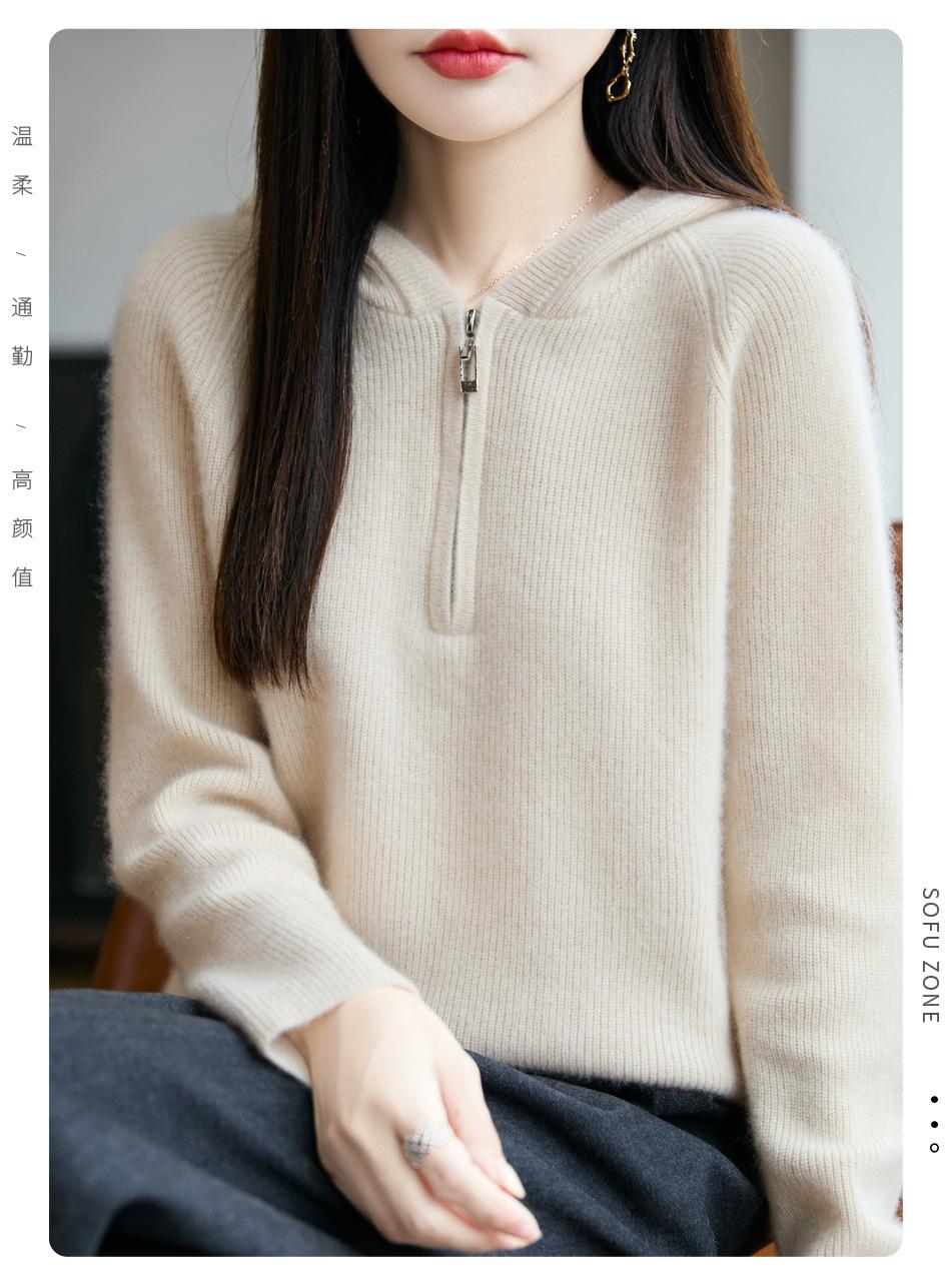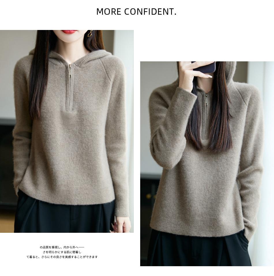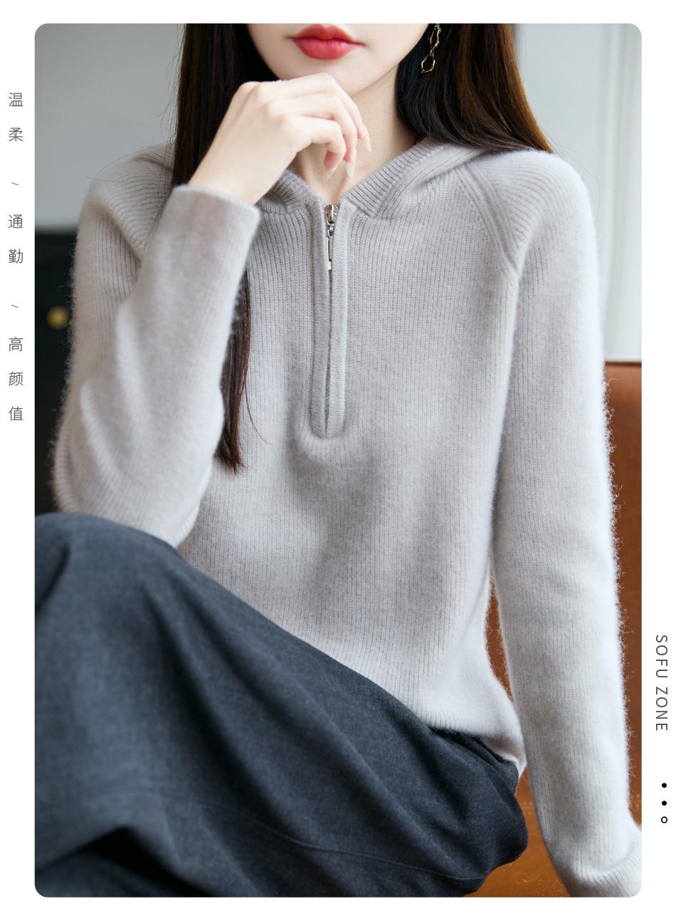 Suéter Tricotado de Lã Pura com Capuz e Meio Zíper Outono/Inverno 2025 Manga Longa Feminino Cor Sólida Macio Quente Camada Base