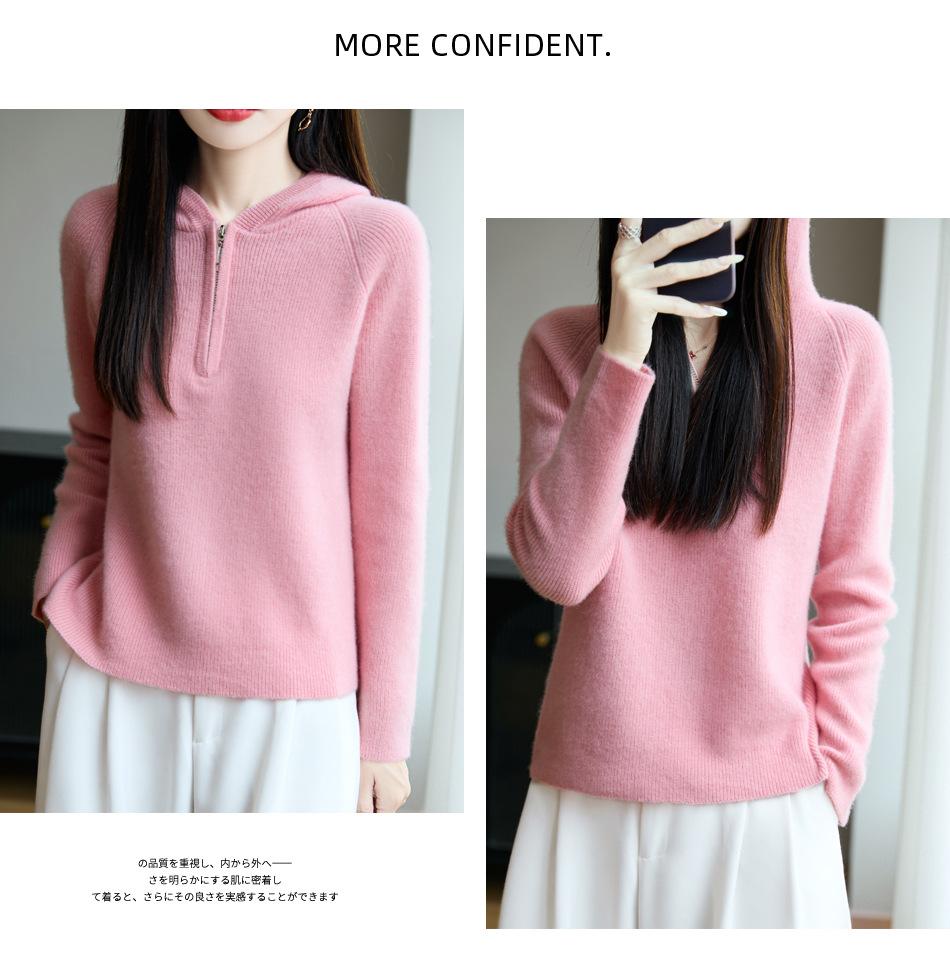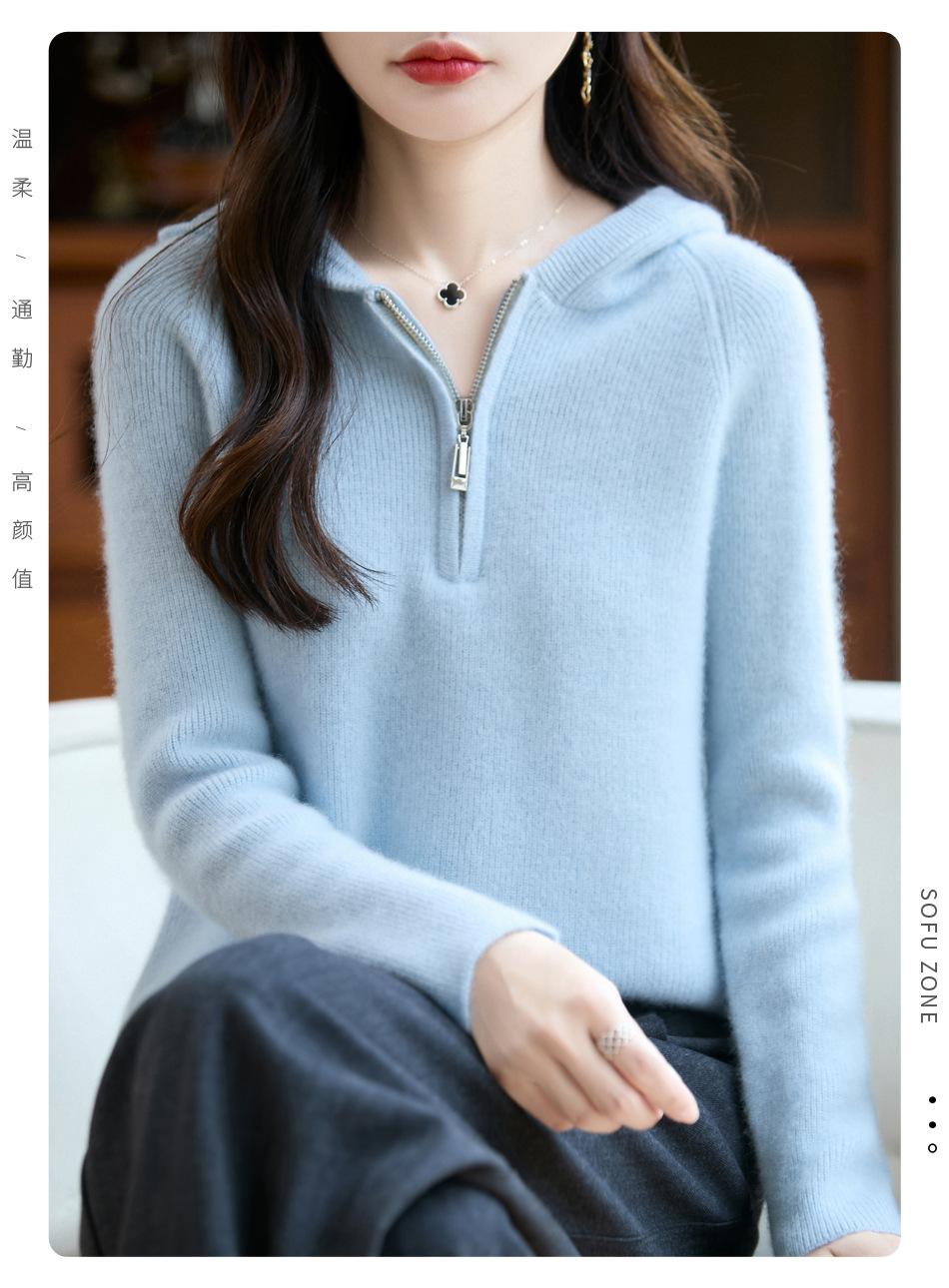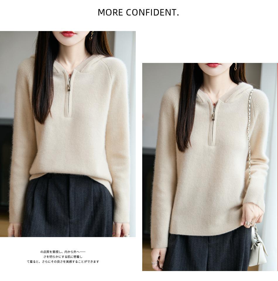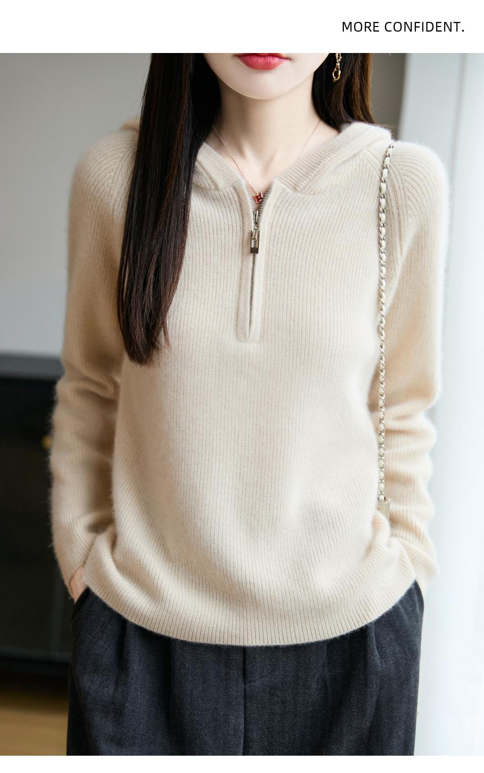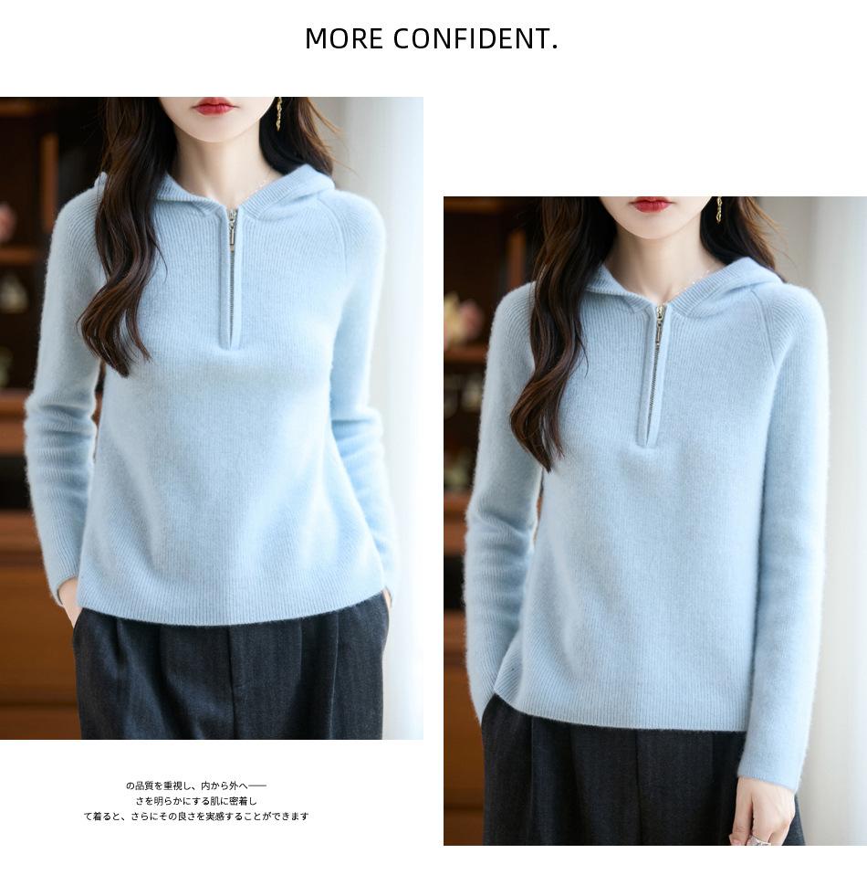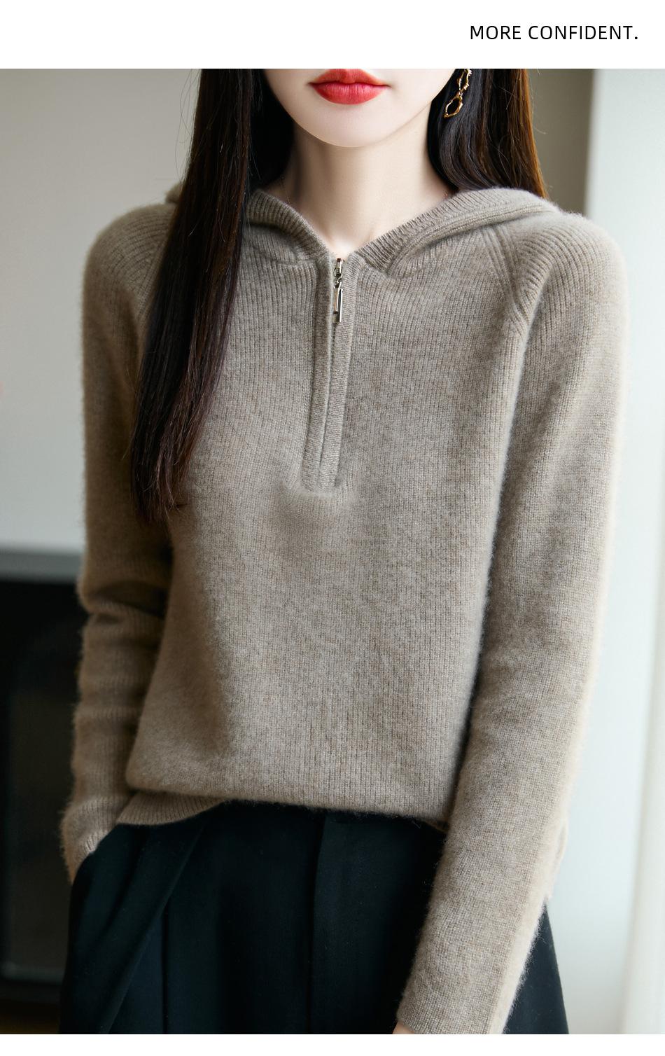 Suéter Tricotado de Lã Pura com Capuz e Meio Zíper Outono/Inverno 2025 Manga Longa Feminino Cor Sólida Macio Quente Camada Base