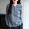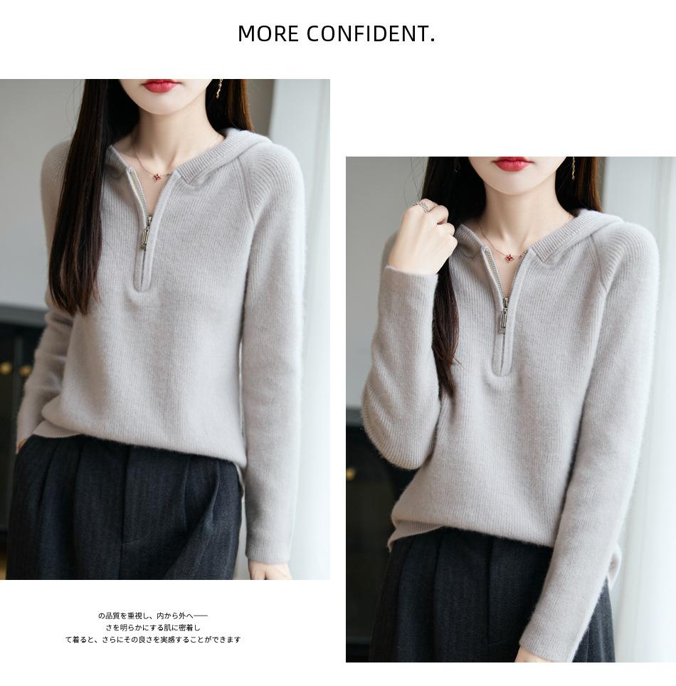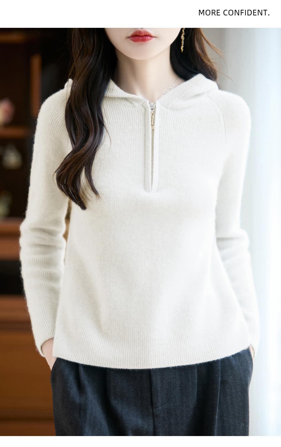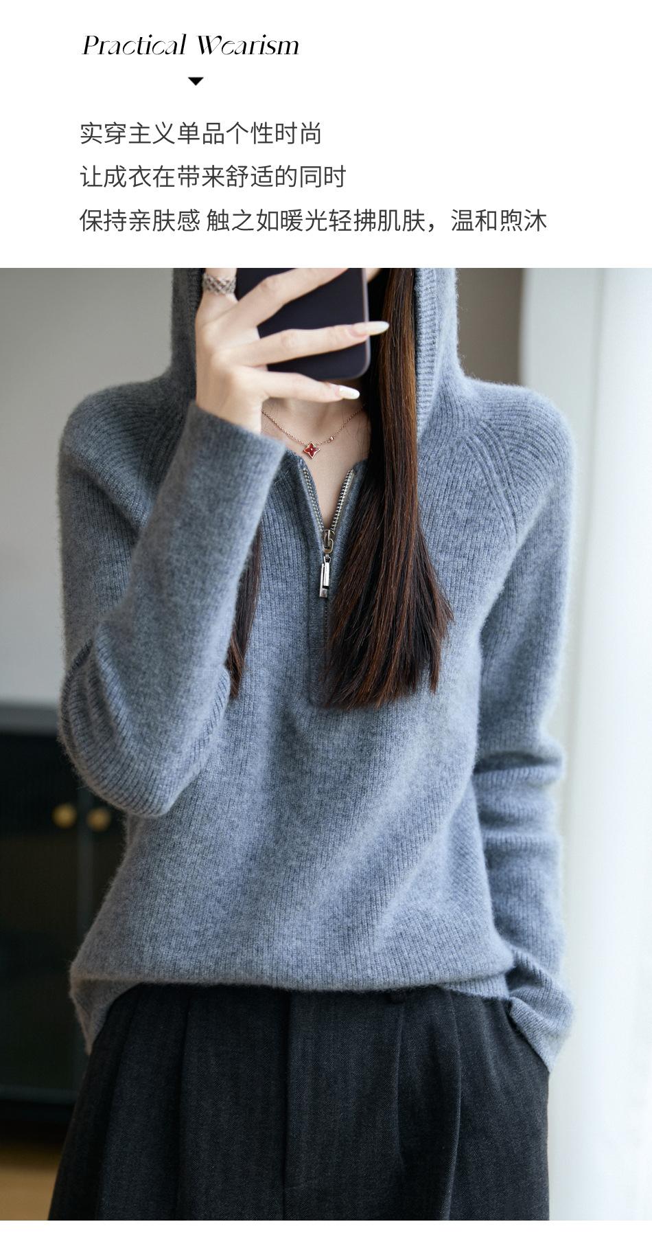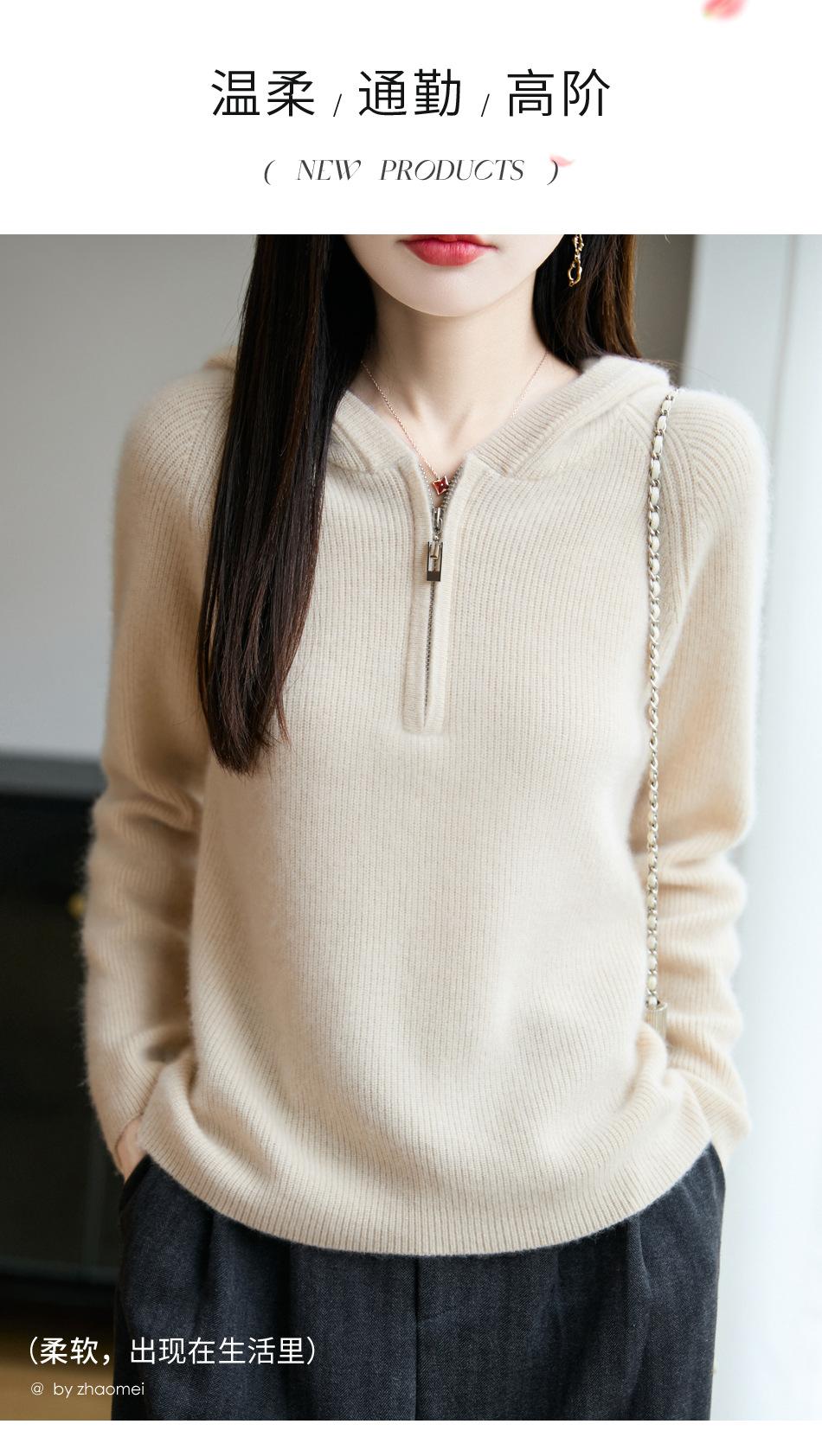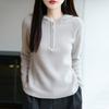 Suéter Tricotado de Lã Pura com Capuz e Meio Zíper Outono/Inverno 2025 Manga Longa Feminino Cor Sólida Macio Quente Camada Base