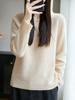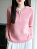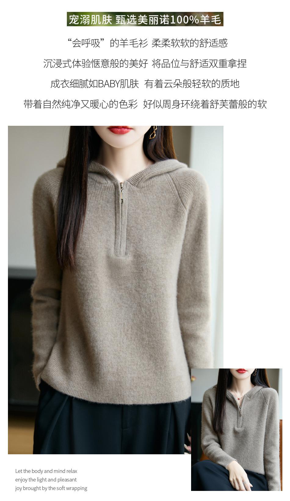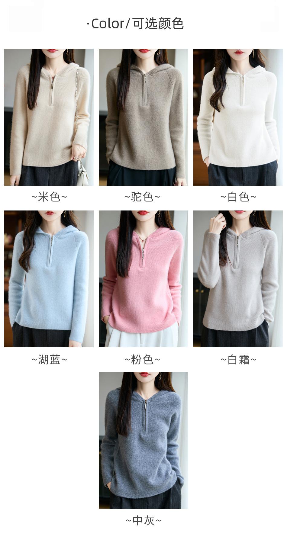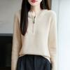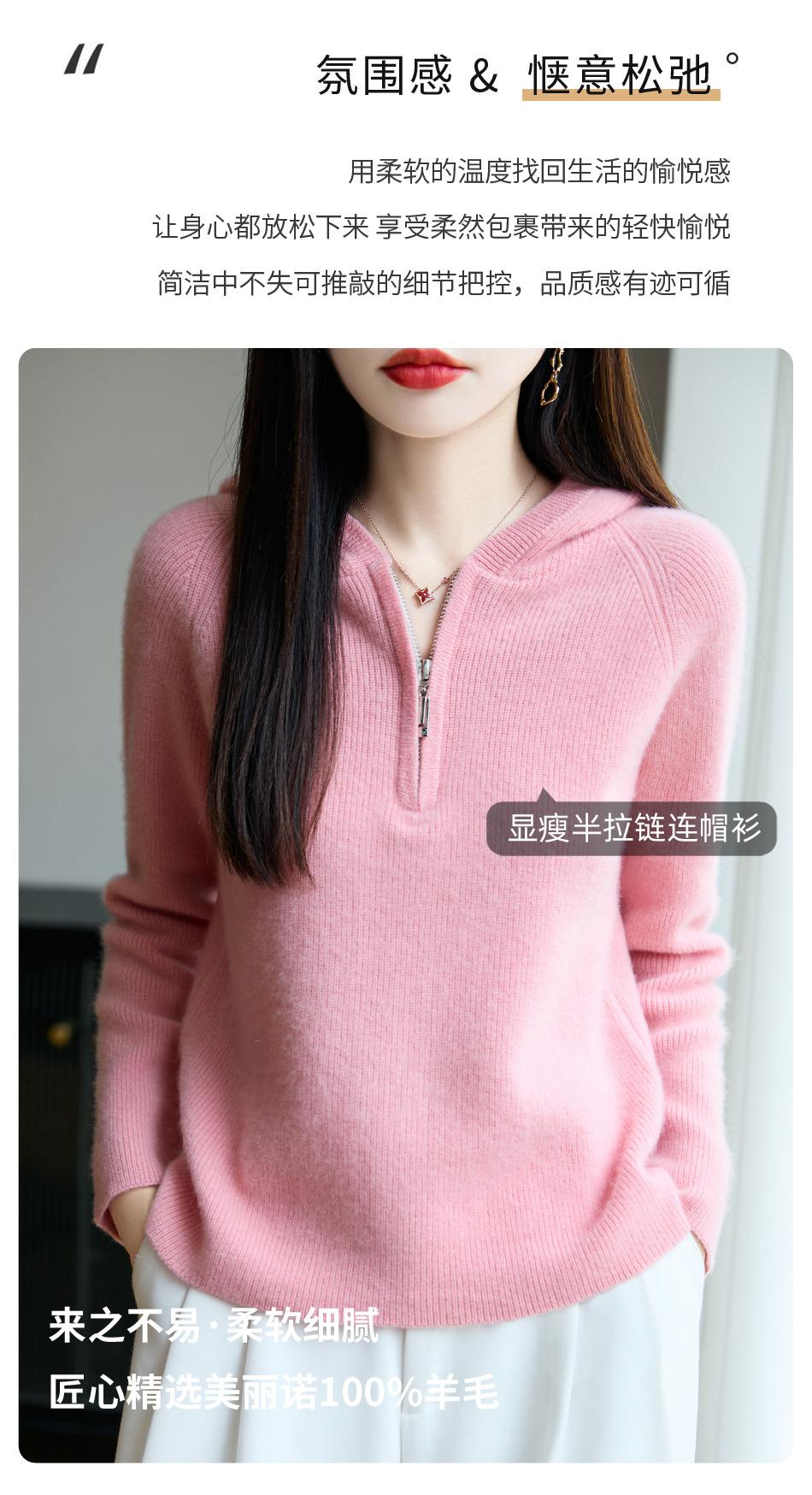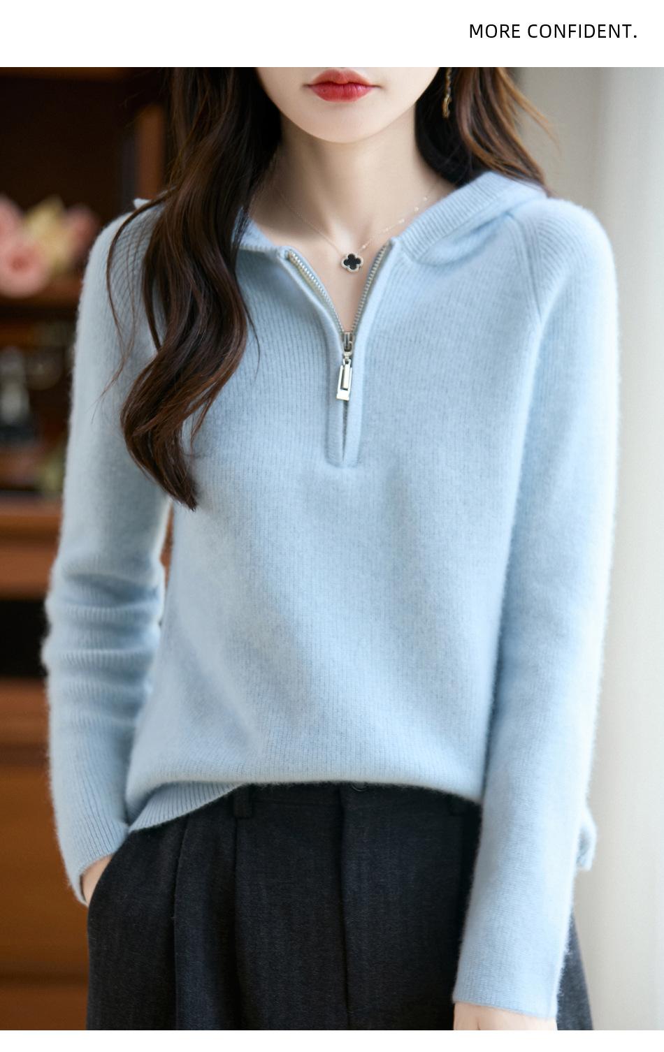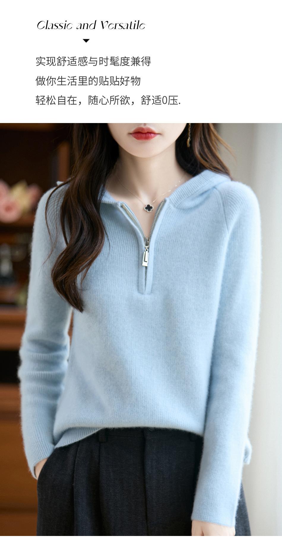 Suéter Tricotado de Lã Pura com Capuz e Meio Zíper Outono/Inverno 2025 Manga Longa Feminino Cor Sólida Macio Quente Camada Base