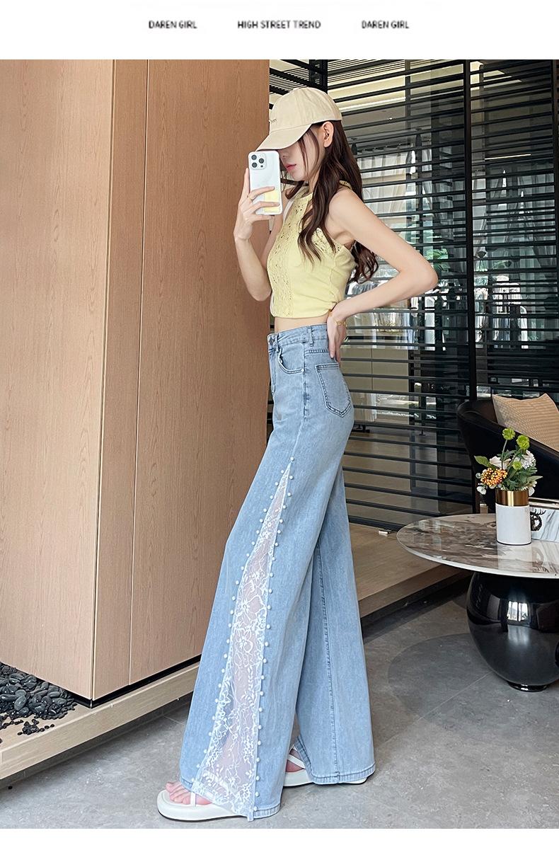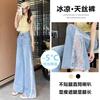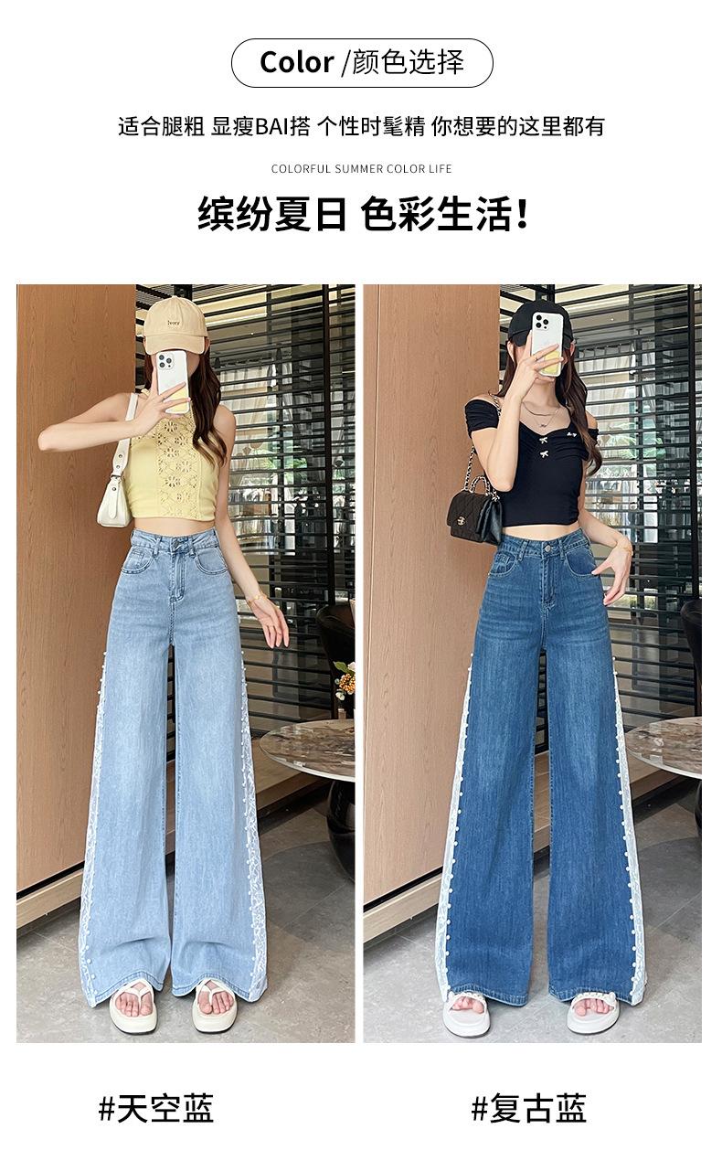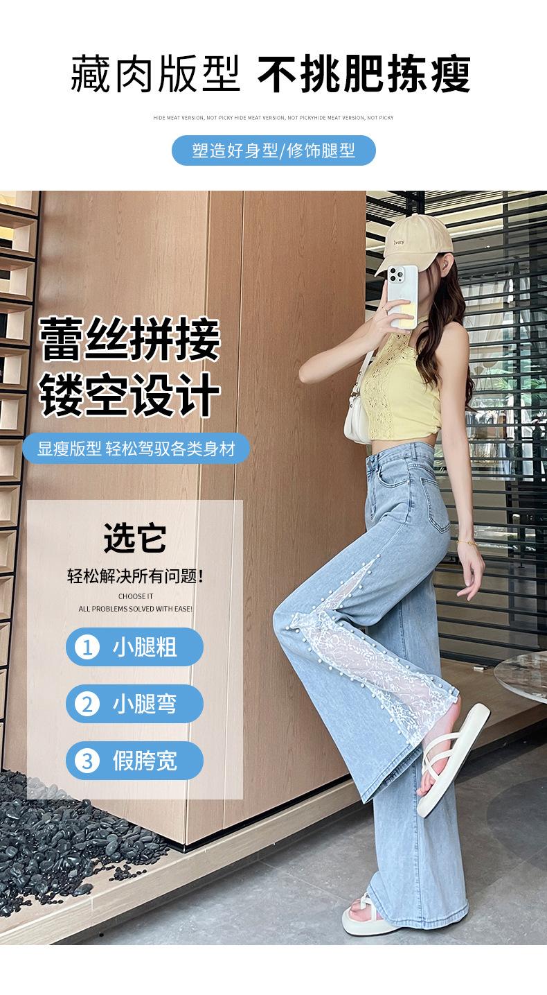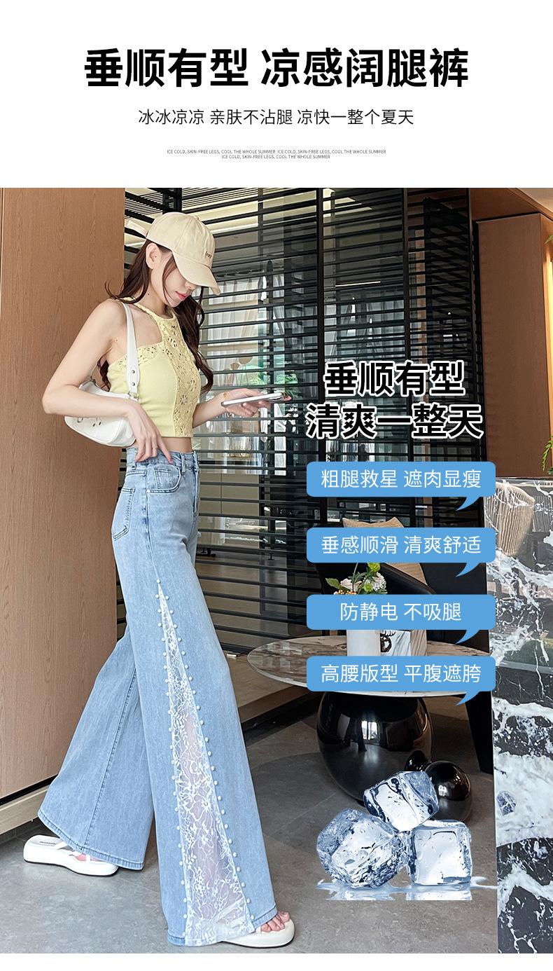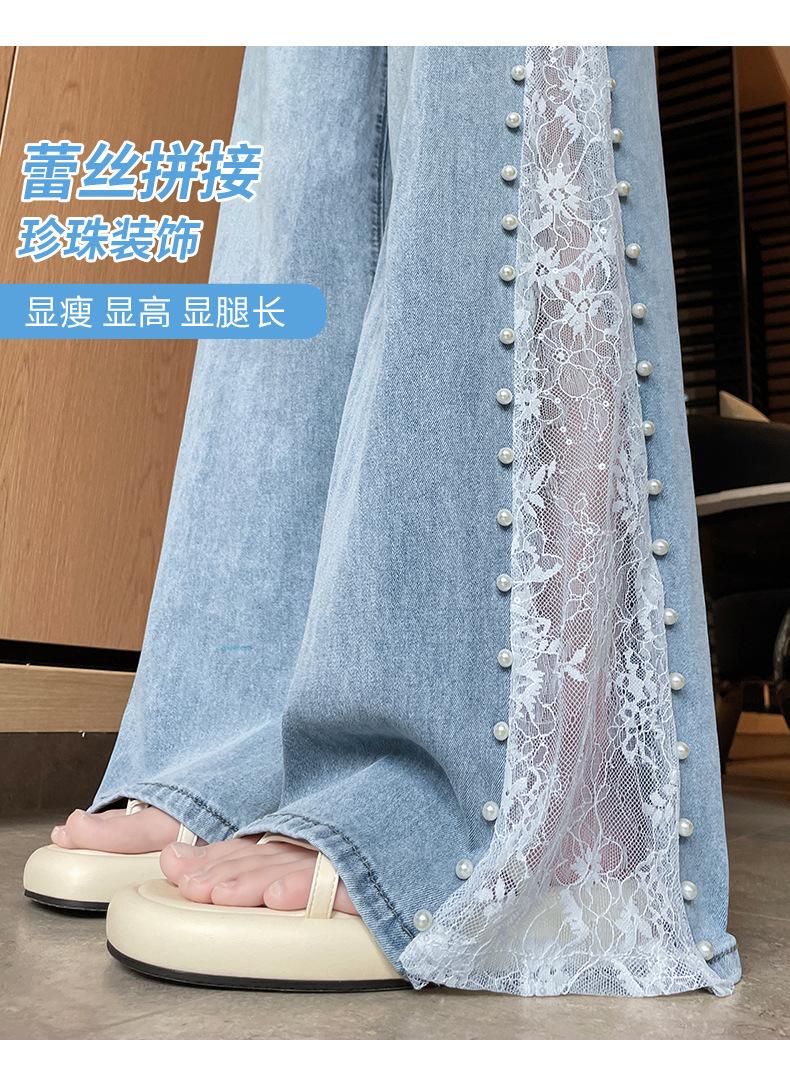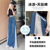Jeans Tencel Vazados com Renda Pernas Largas Feminino 2025 Novo Verão Fino Super Quente Solto Emagrecimento Calças Retas