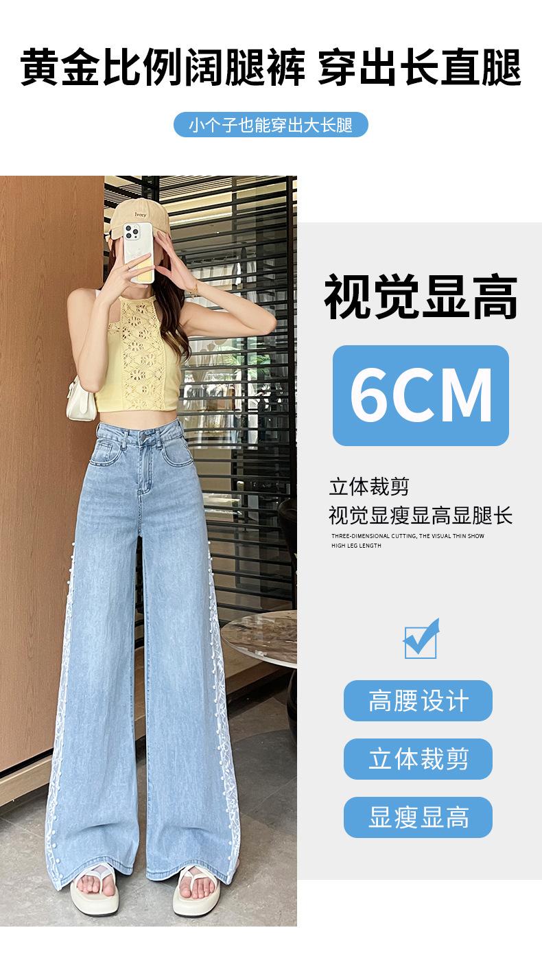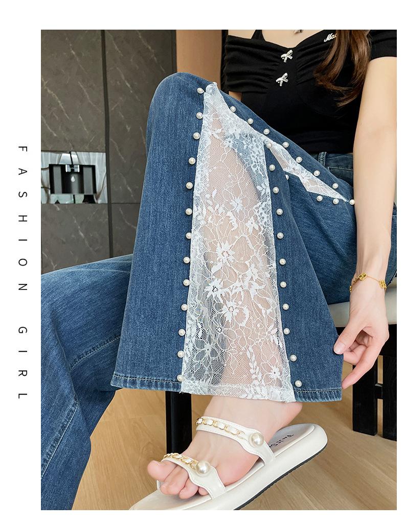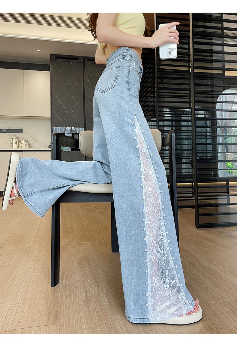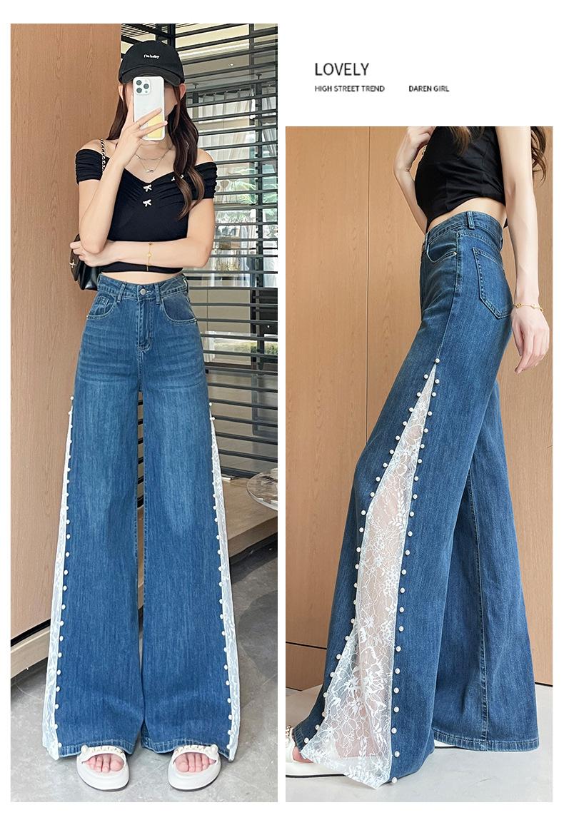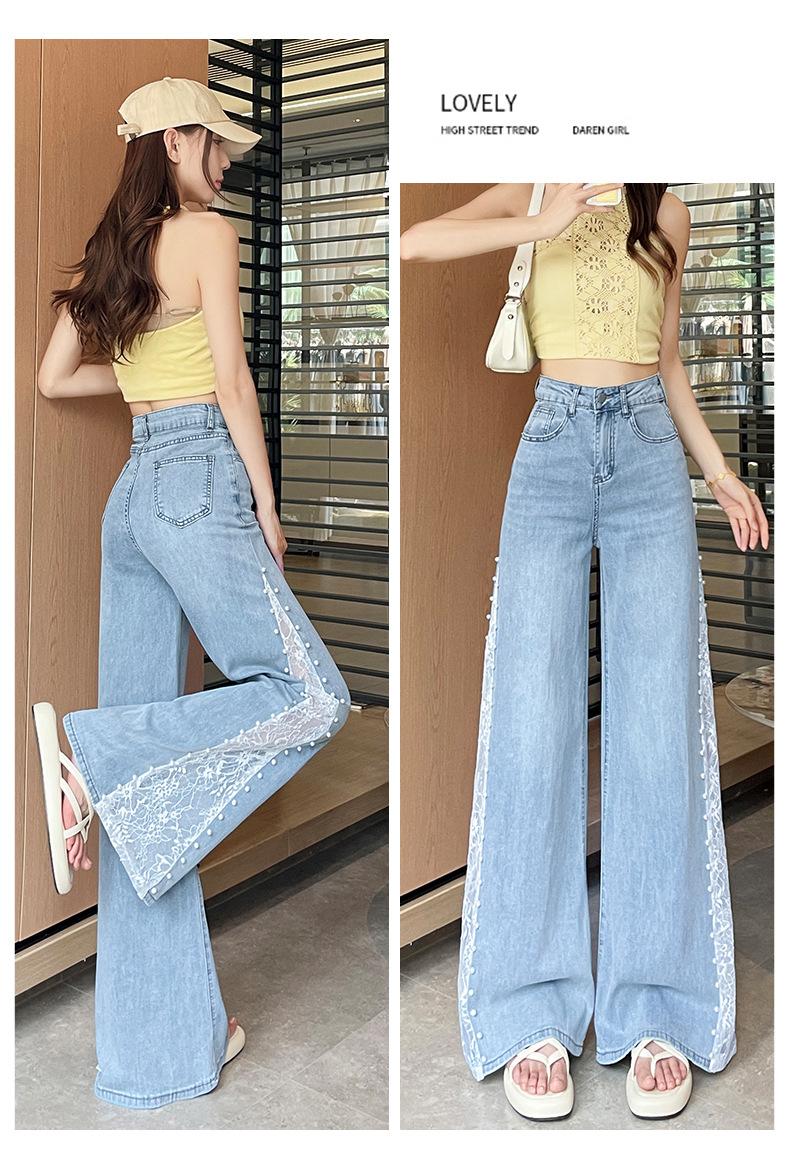 Jeans Tencel Vazados com Renda Pernas Largas Feminino 2025 Novo Verão Fino Super Quente Solto Emagrecimento Calças Retas
