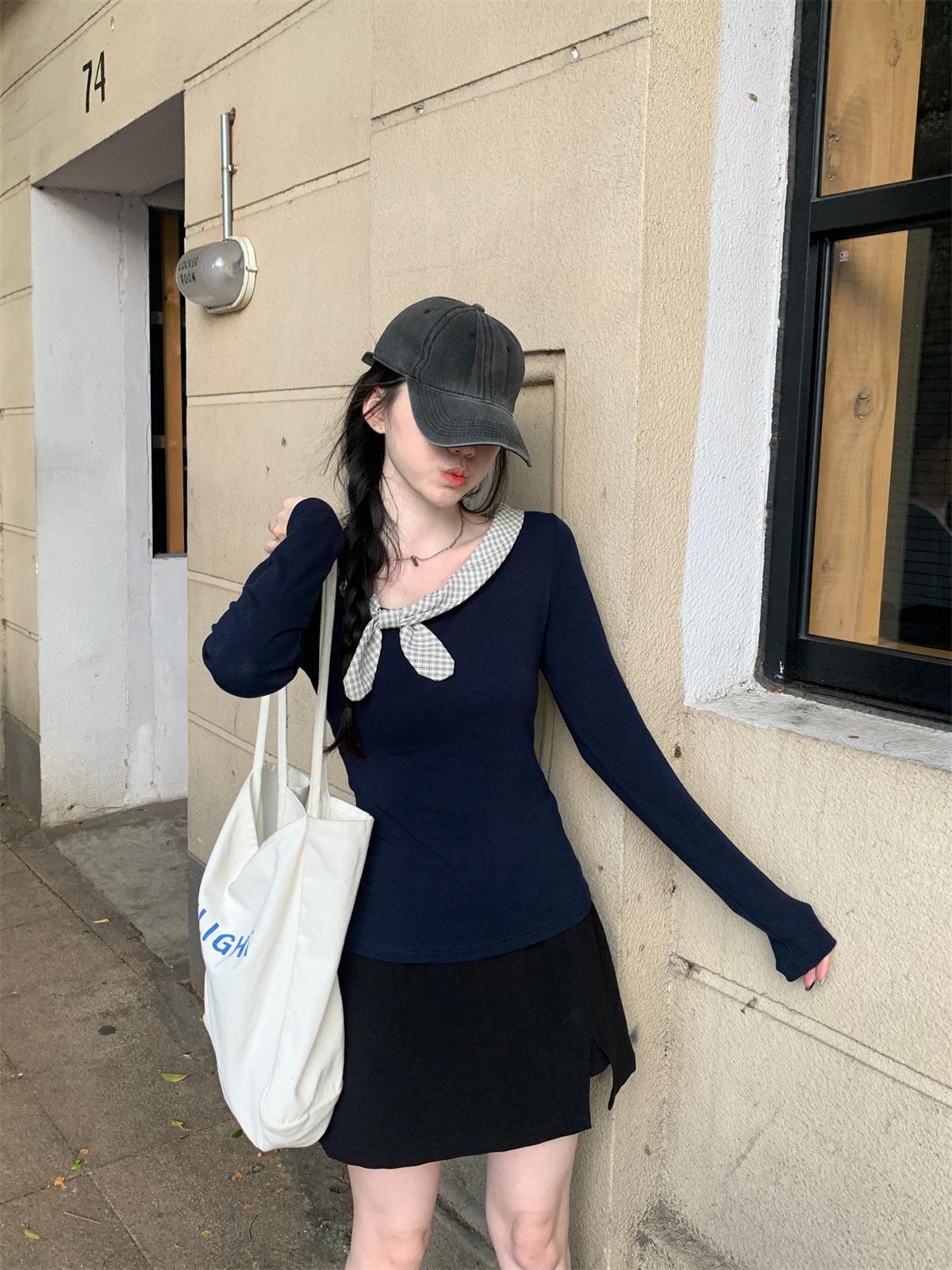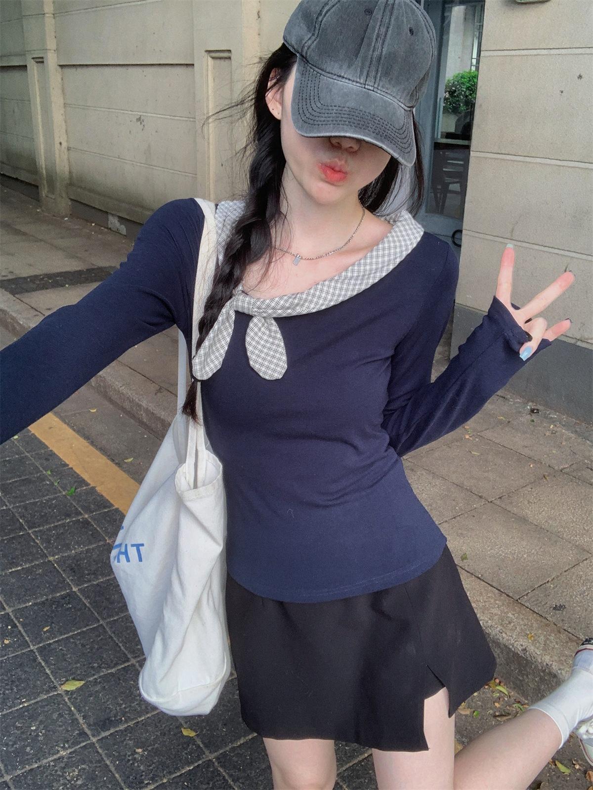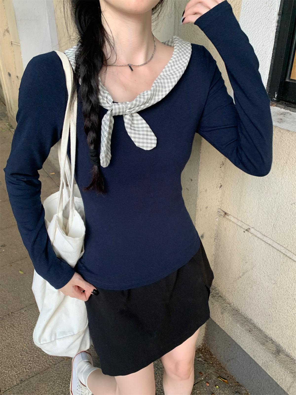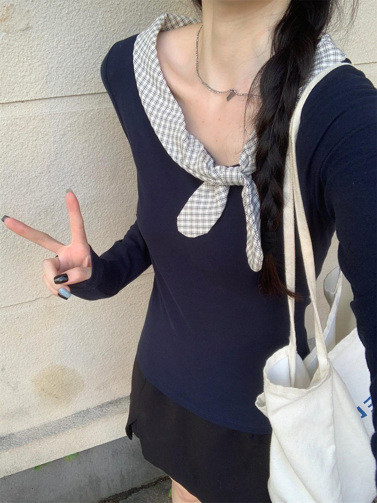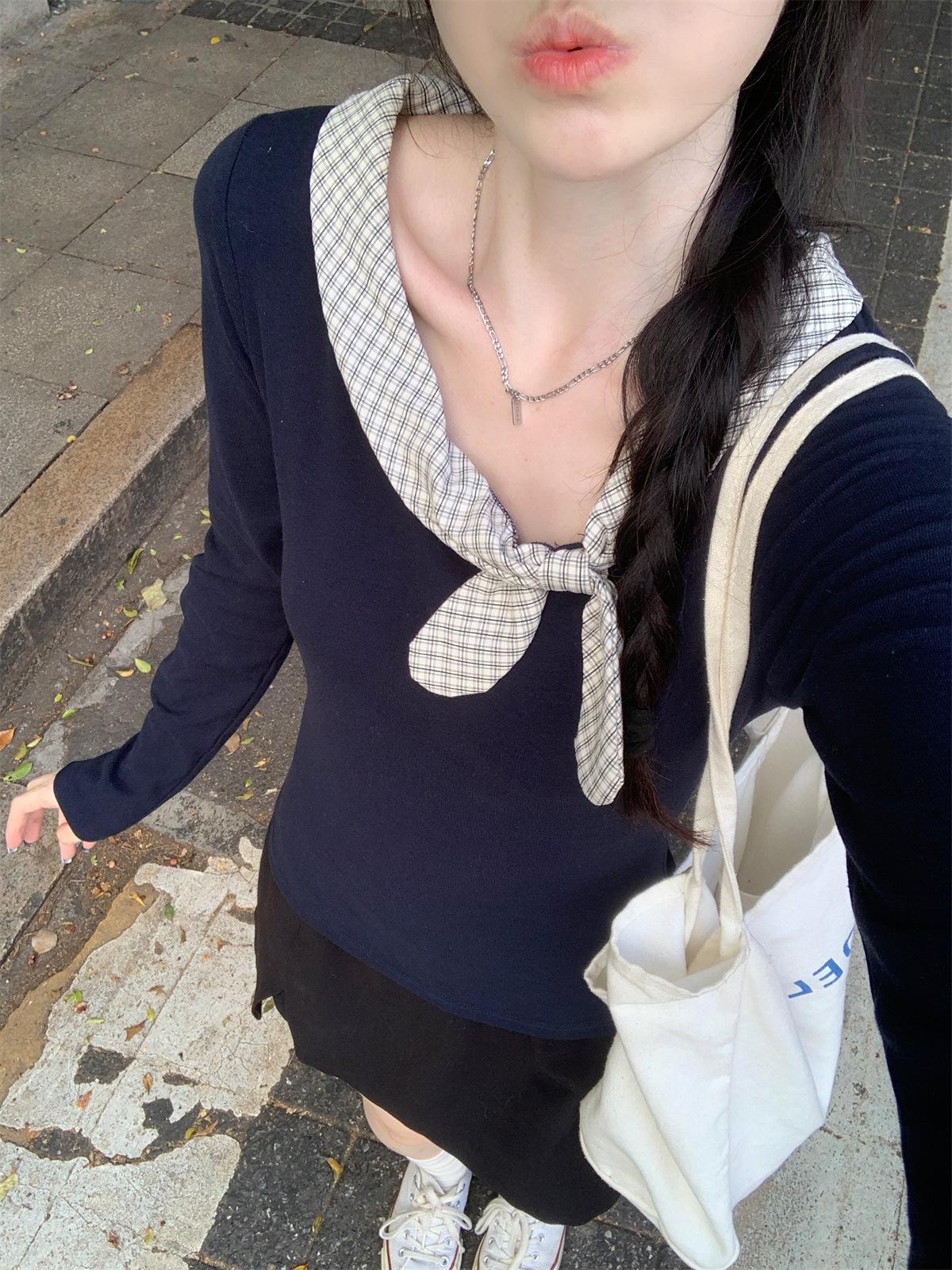 Estilo americano outono 2025 versão coreana slim fit redutor de idade design de gravata xadrez com laço camiseta de manga comprida camisa básica top