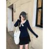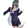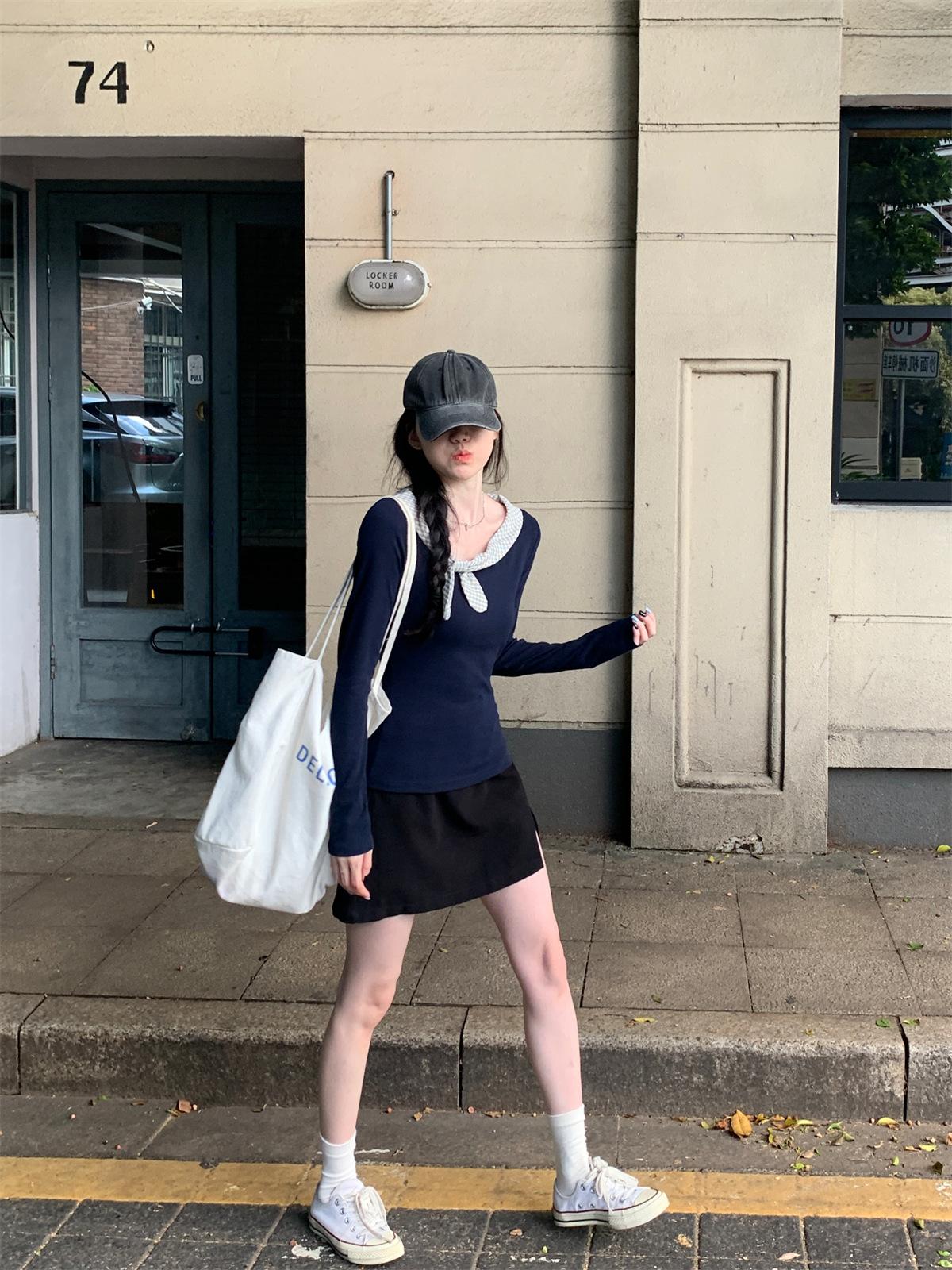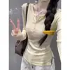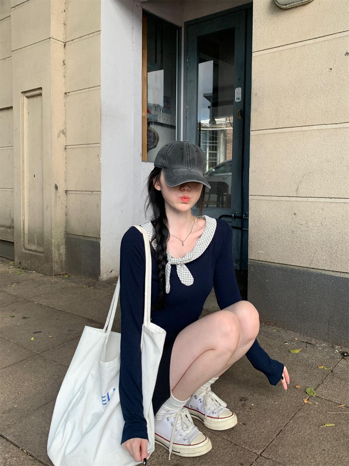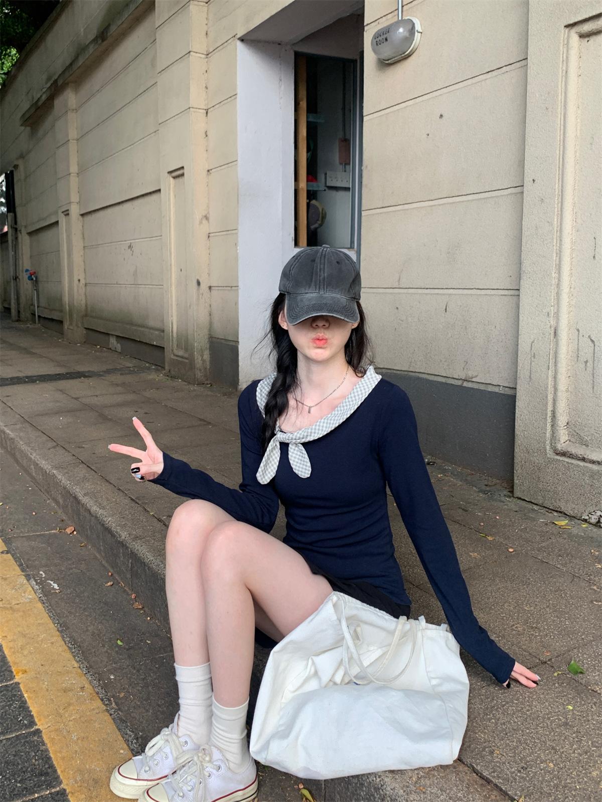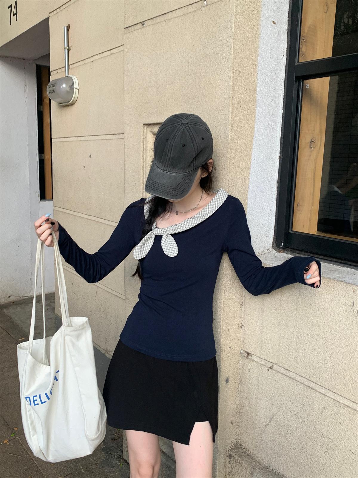 Estilo americano outono 2025 versão coreana slim fit redutor de idade design de gravata xadrez com laço camiseta de manga comprida camisa básica top