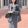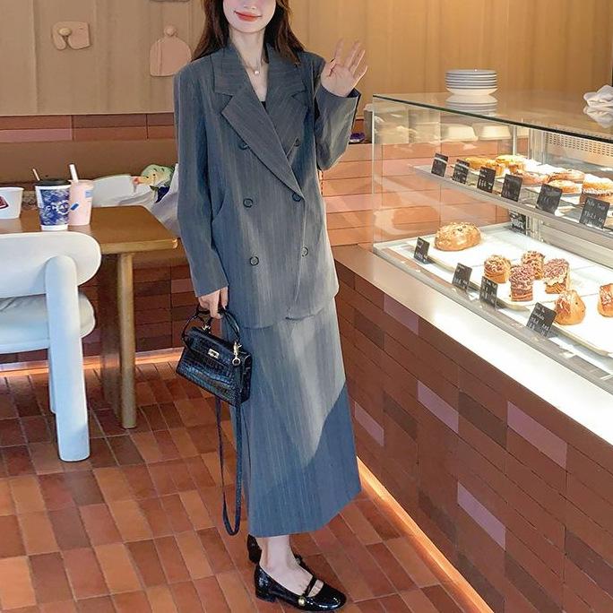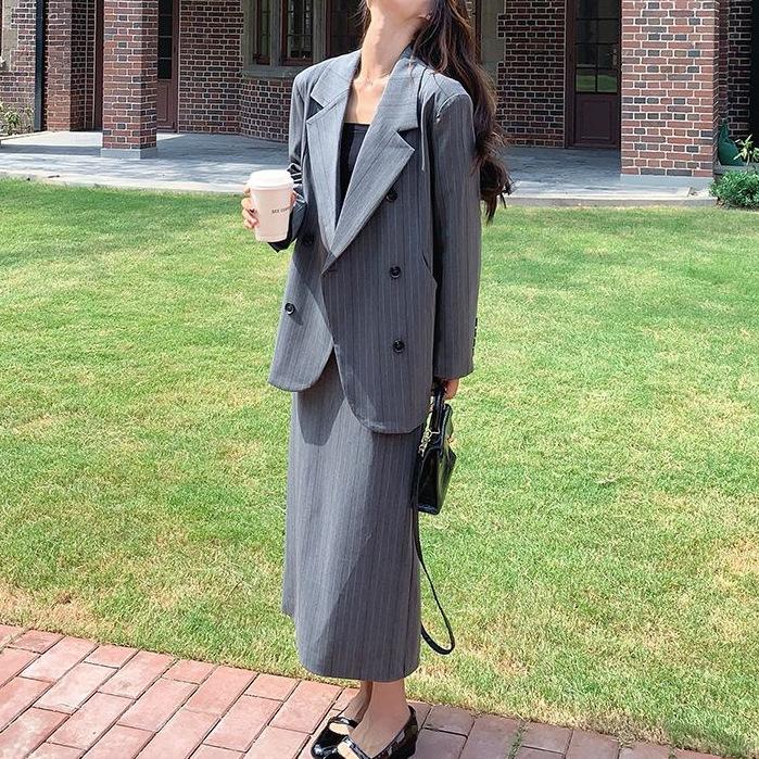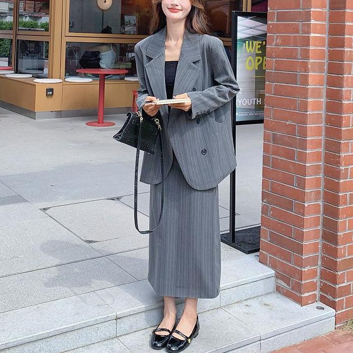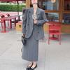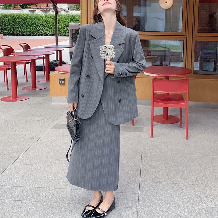 Conjunto de Terno Listrado Cinza Feminino Saia 2025 Primavera e Outono Novo Blazer de Alto Senso Saia Duas Peças