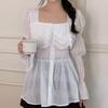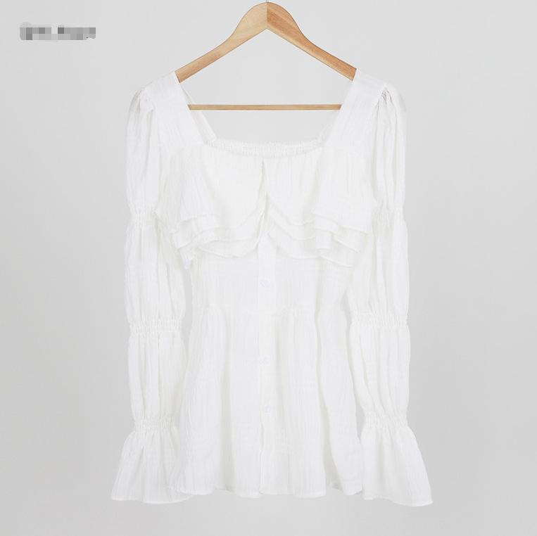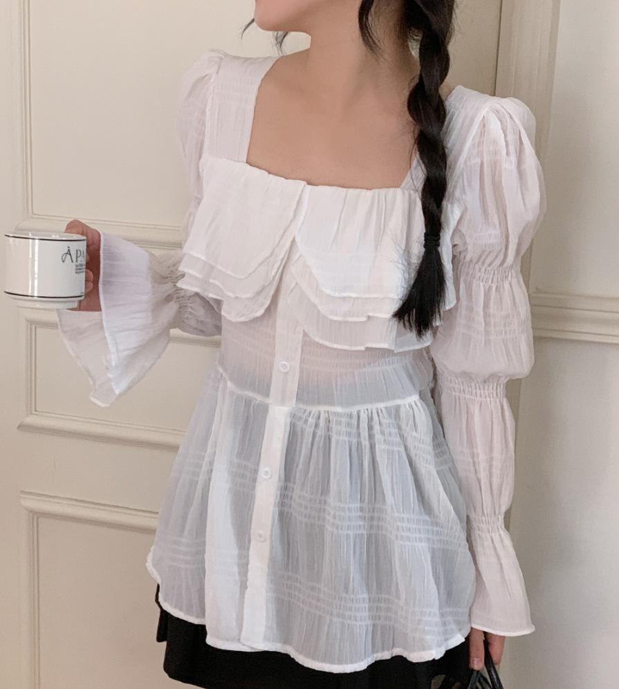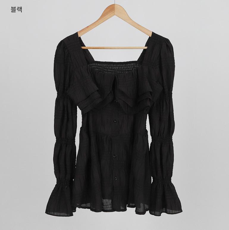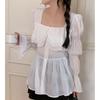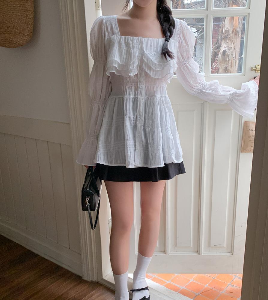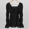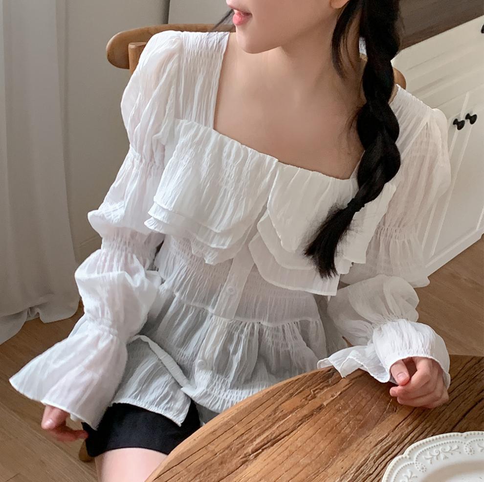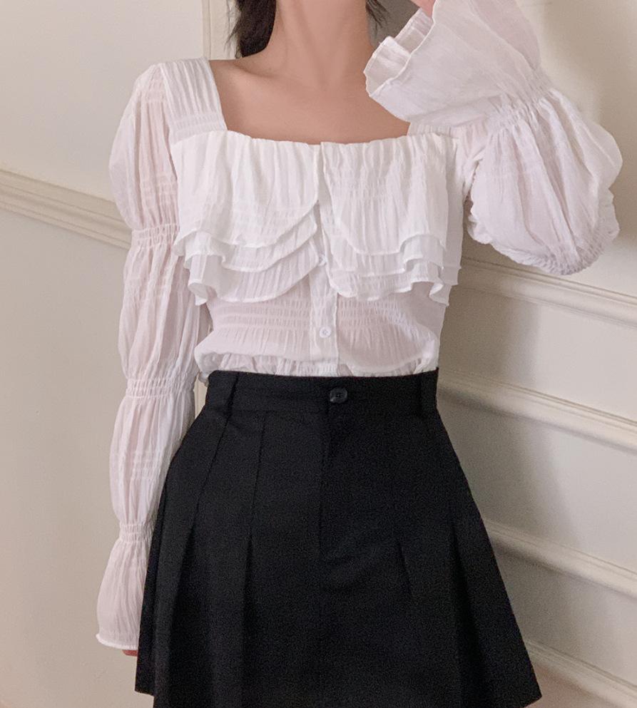 Top Camisa Feminina Manga Longa Temperamento Emagrecimento Comprimento Estendido Bainha Babados Decote Quadrado Sexy Coreano Início do Outono