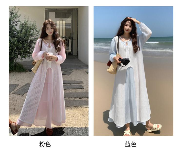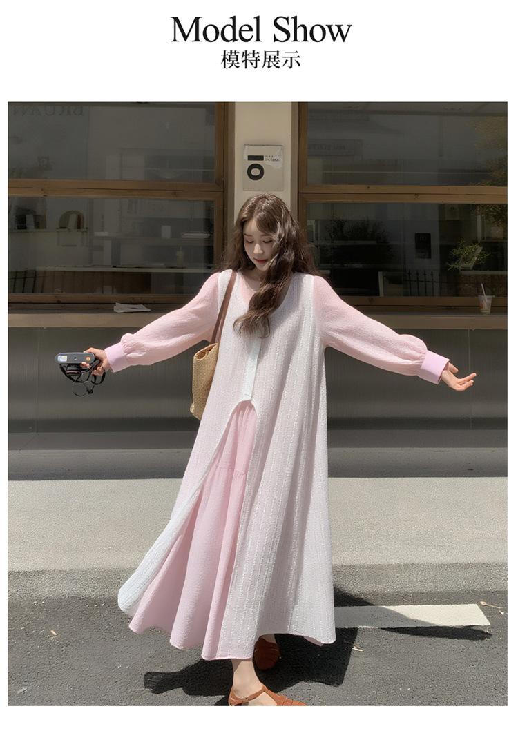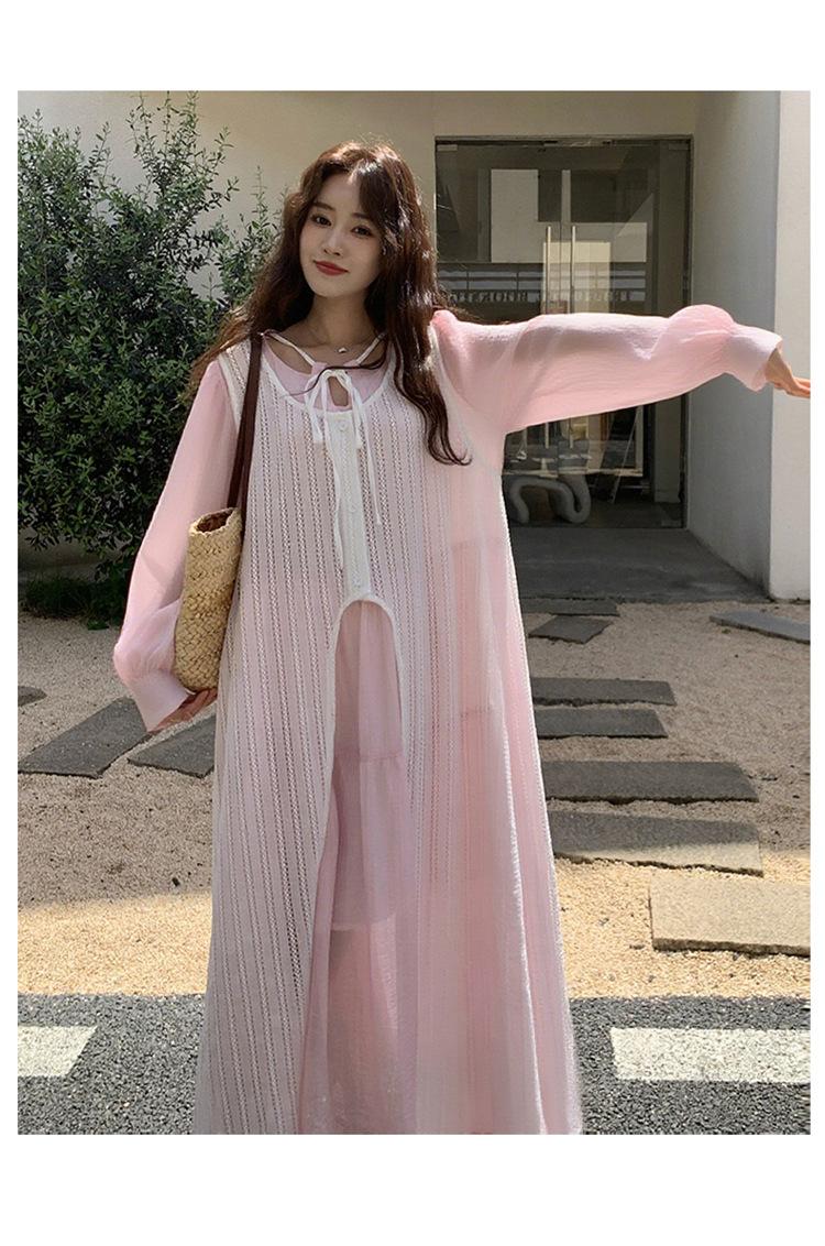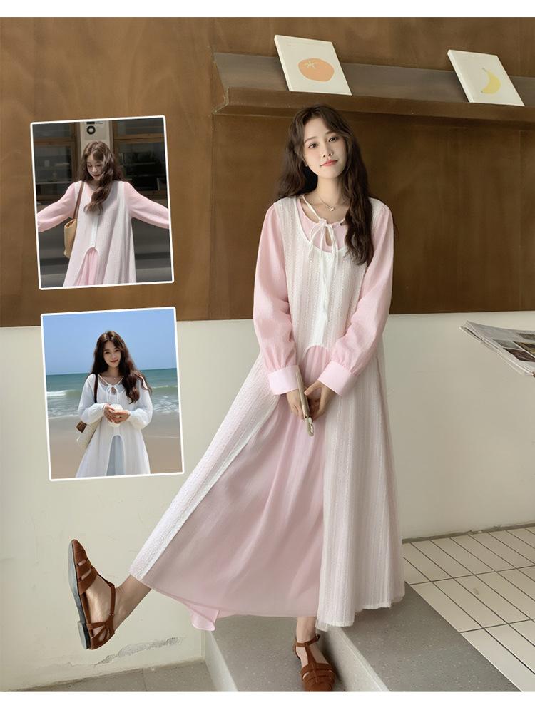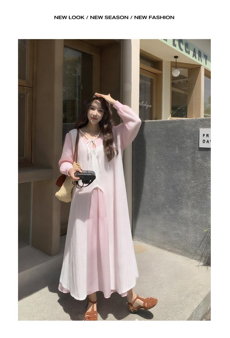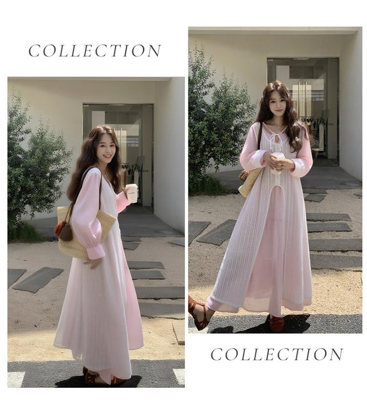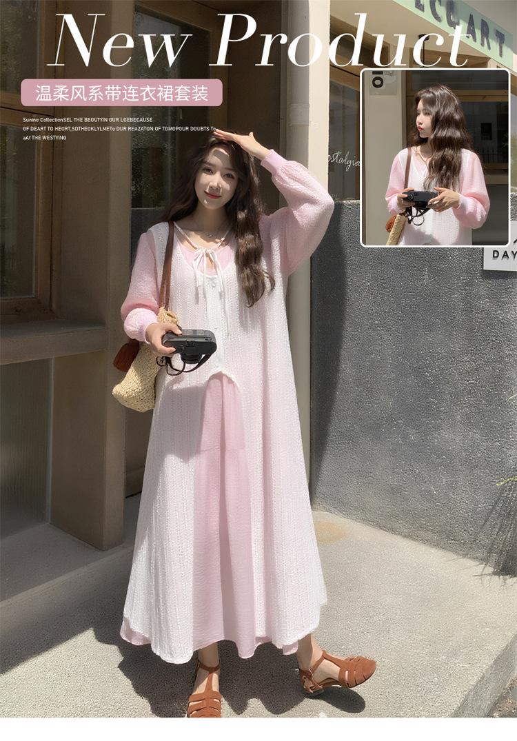 Conjunto de duas peças moderno primavera e outono 2025 novo estilo que reduz a idade estilo preguiçoso cardigã vestido longo sobreposto conjunto de duas peças moderno