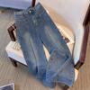 Jeans Azul Slim de Perna Reta Feminino Primavera e Outono Novo Estilo Plus Size Novo Produto Cintura Alta Elástico Petite Calça de Perna Larga Nove Pontos