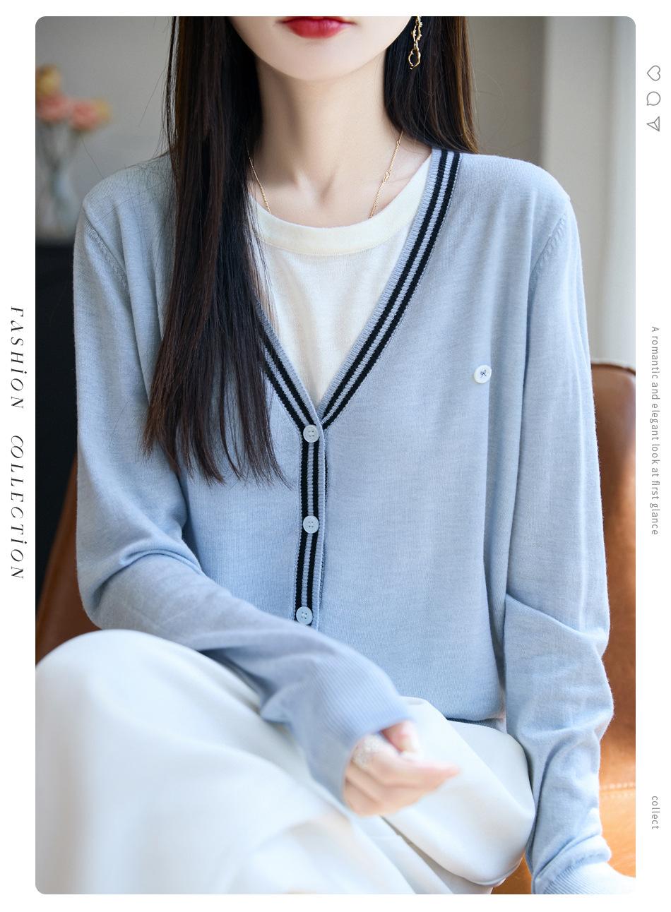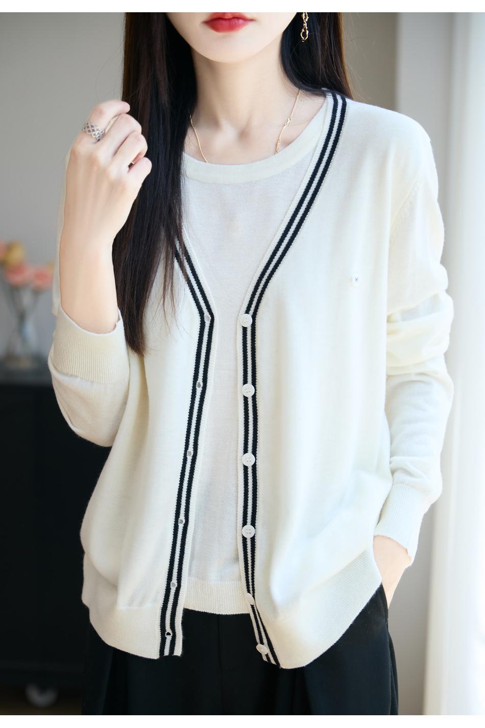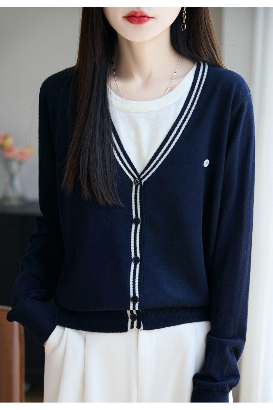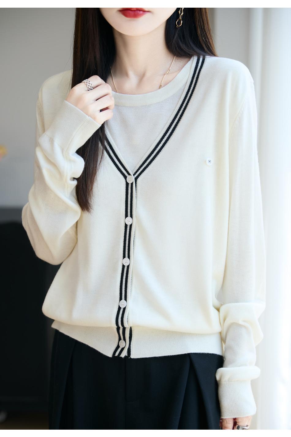 Cardigã de lã merino fina com design falso de duas peças feminino novo outono e inverno listrado gola V casaco de malha versátil e preguiçoso