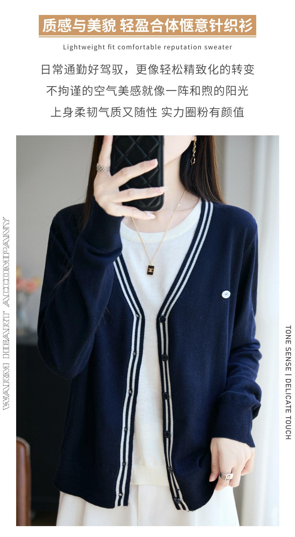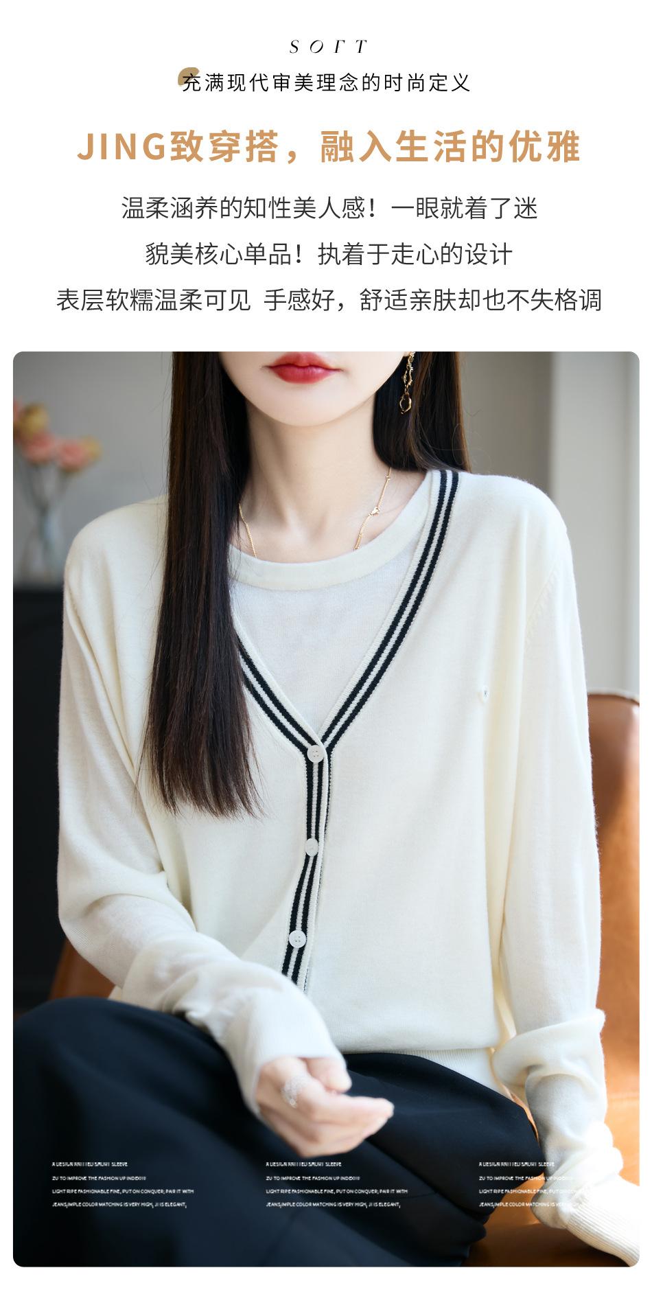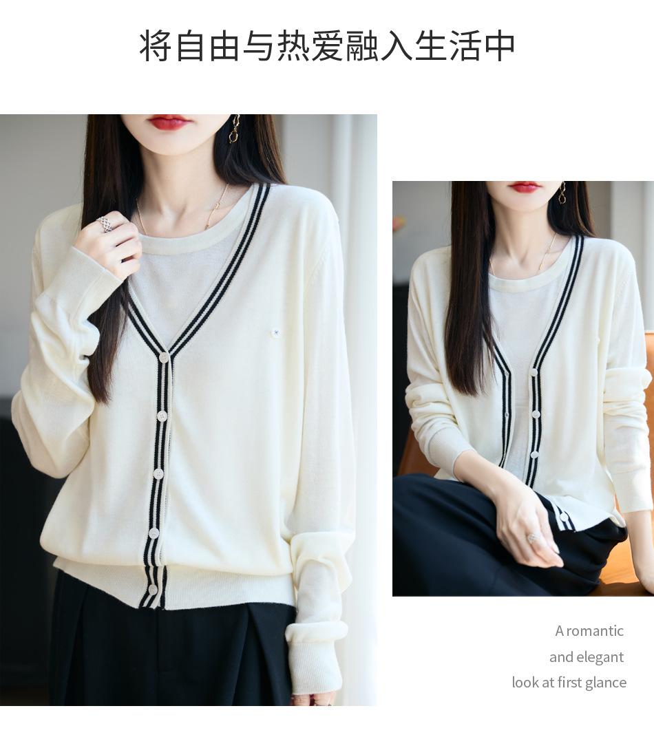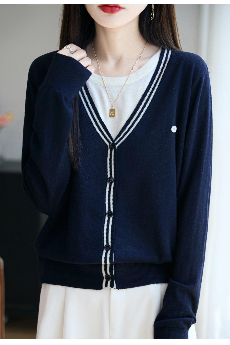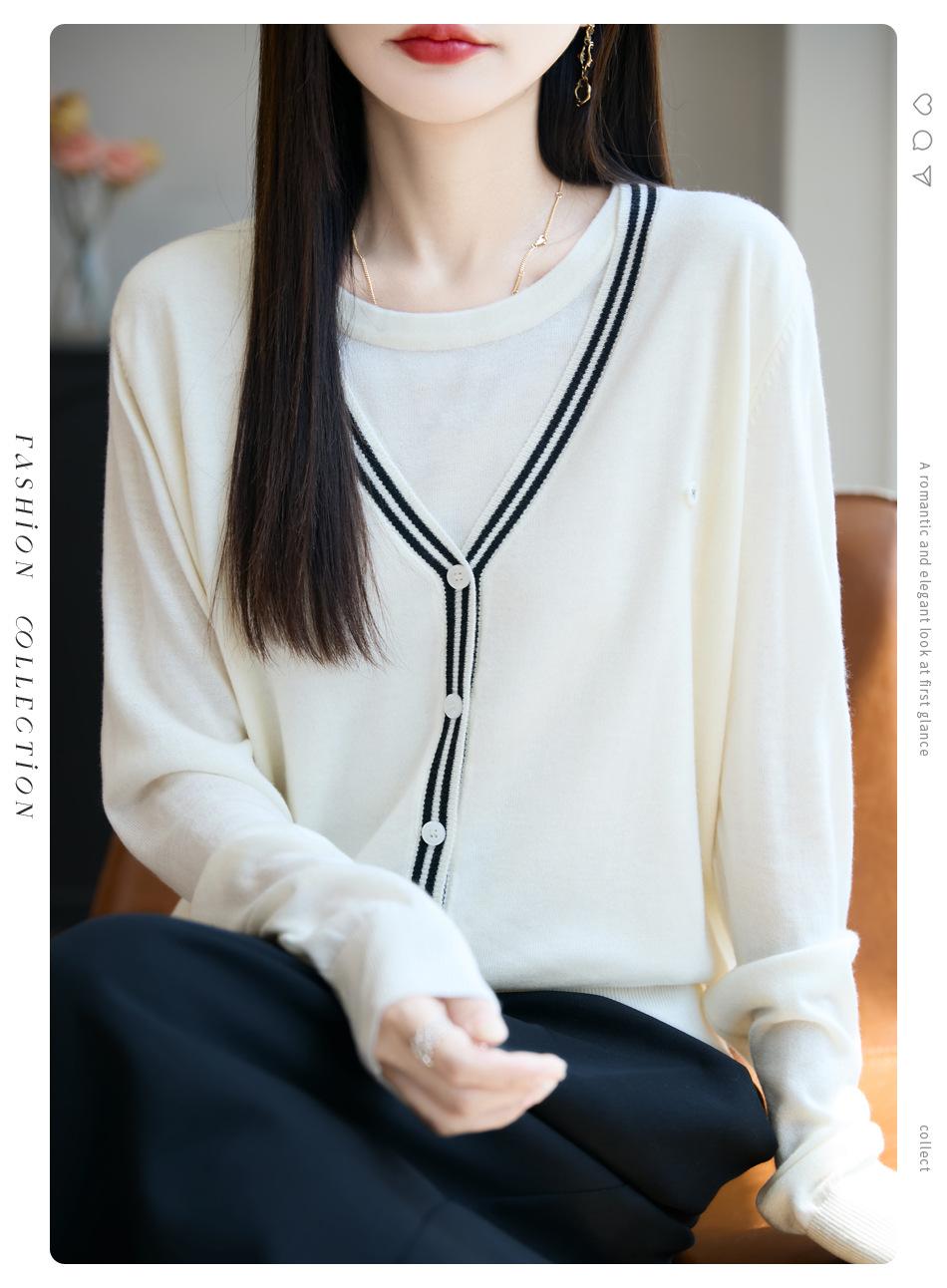 Cardigã de lã merino fina com design falso de duas peças feminino novo outono e inverno listrado gola V casaco de malha versátil e preguiçoso