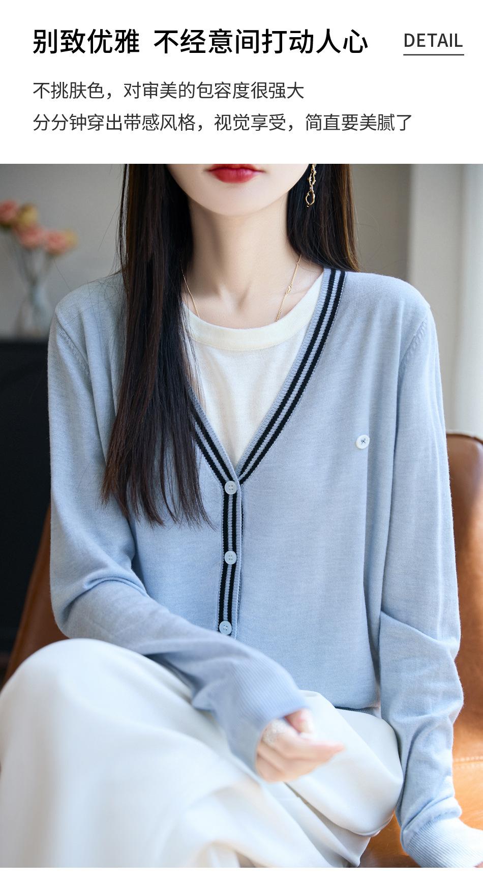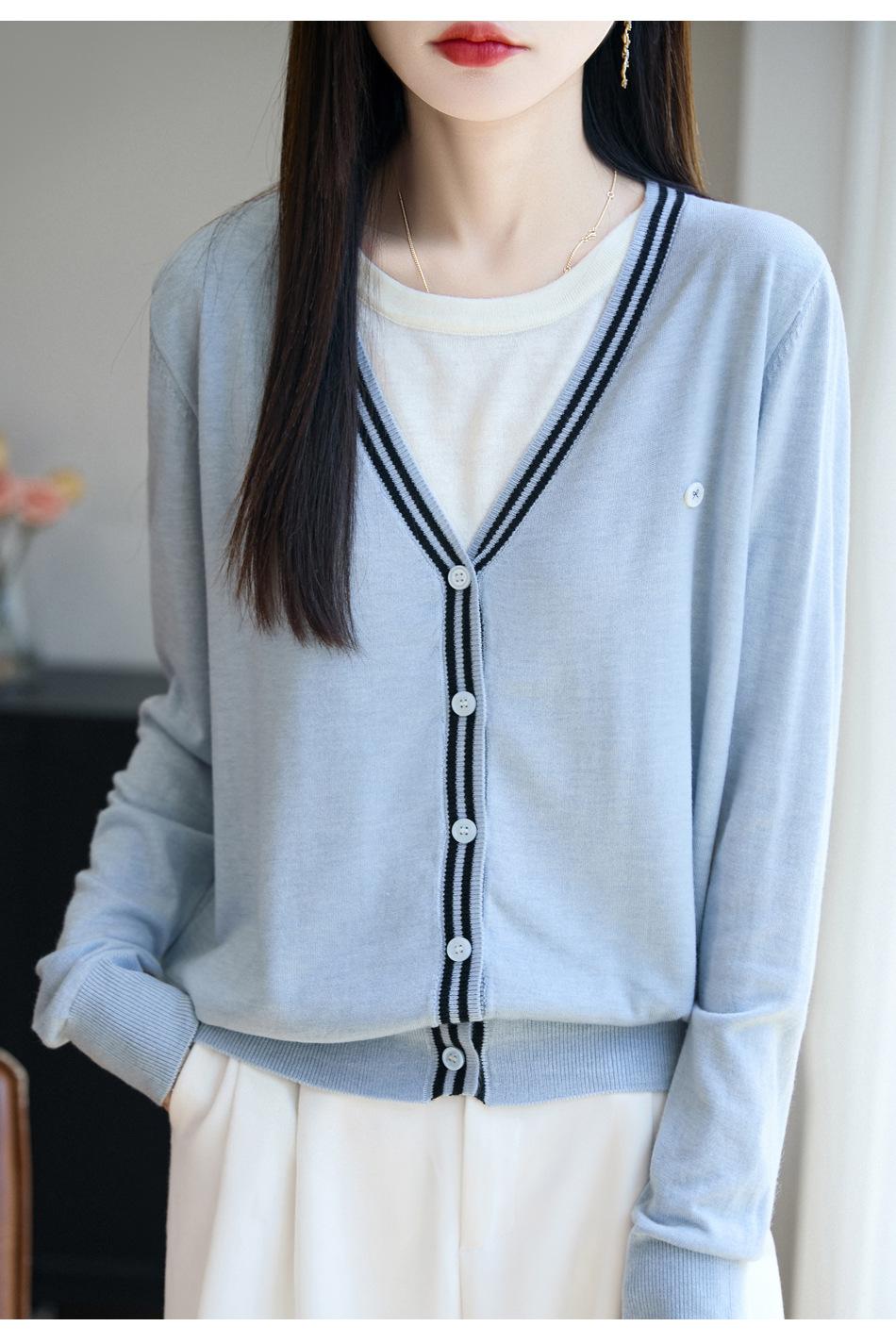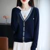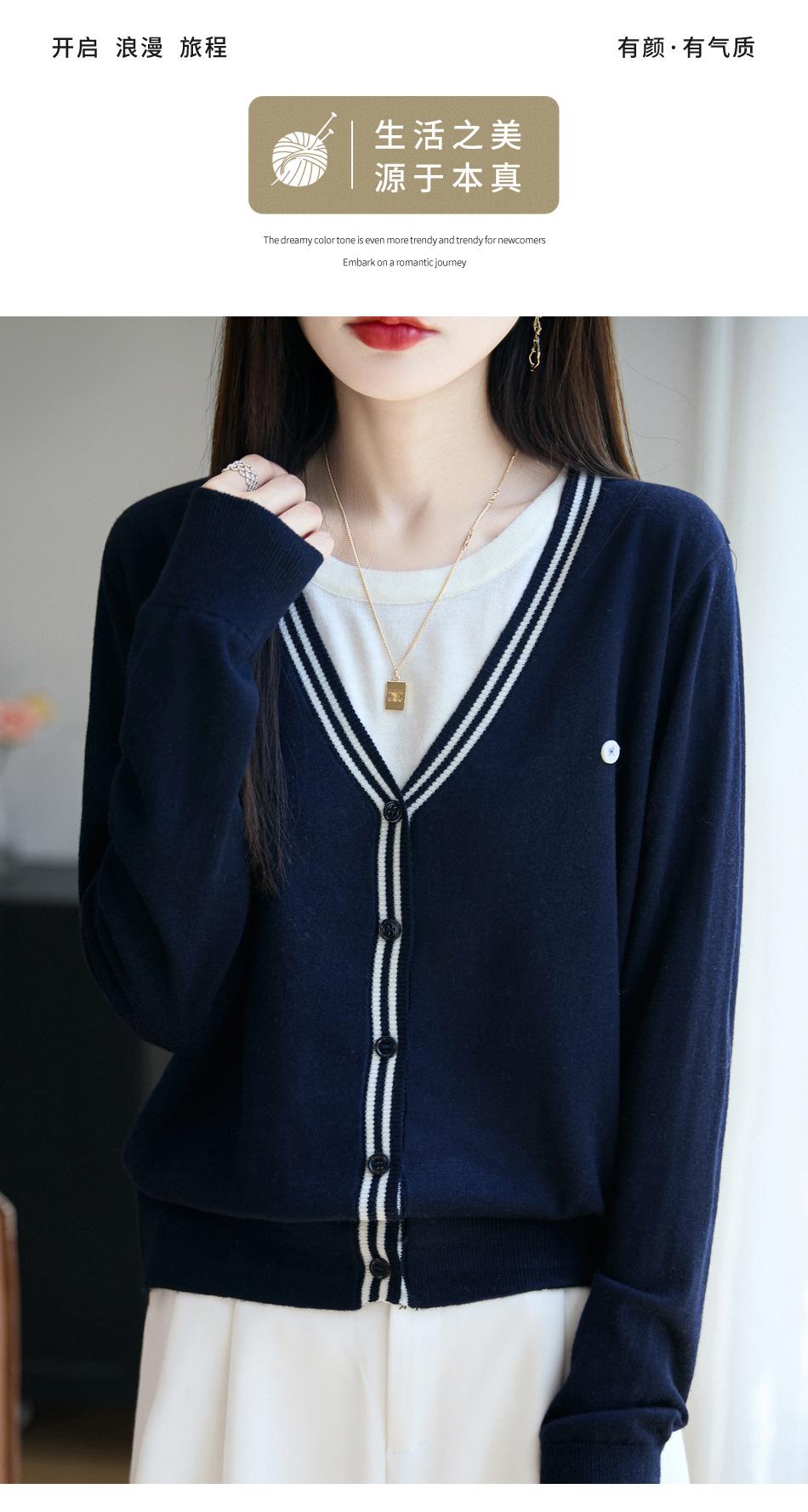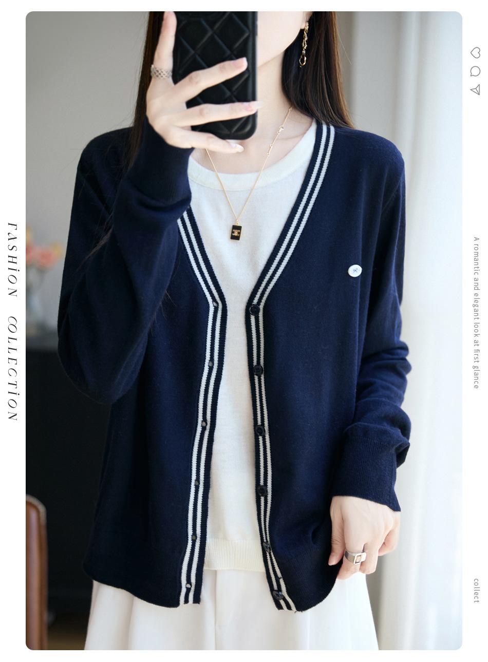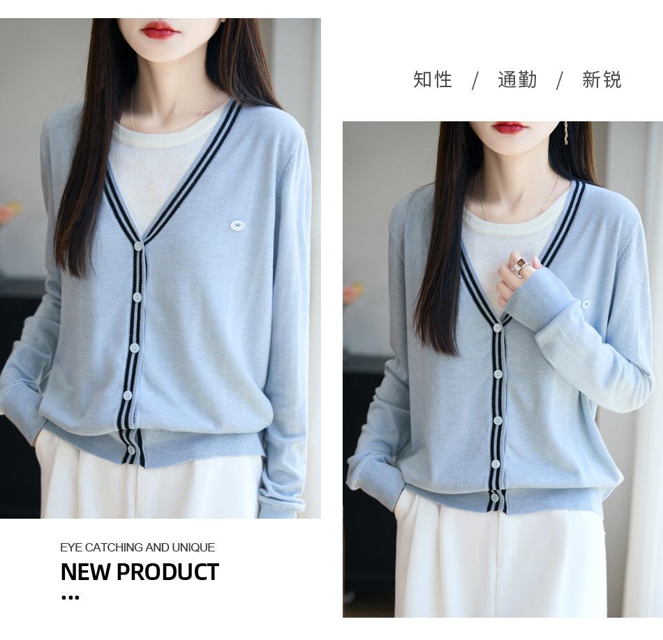 Cardigã de lã merino fina com design falso de duas peças feminino novo outono e inverno listrado gola V casaco de malha versátil e preguiçoso