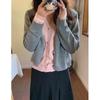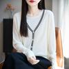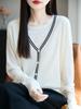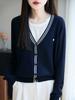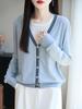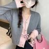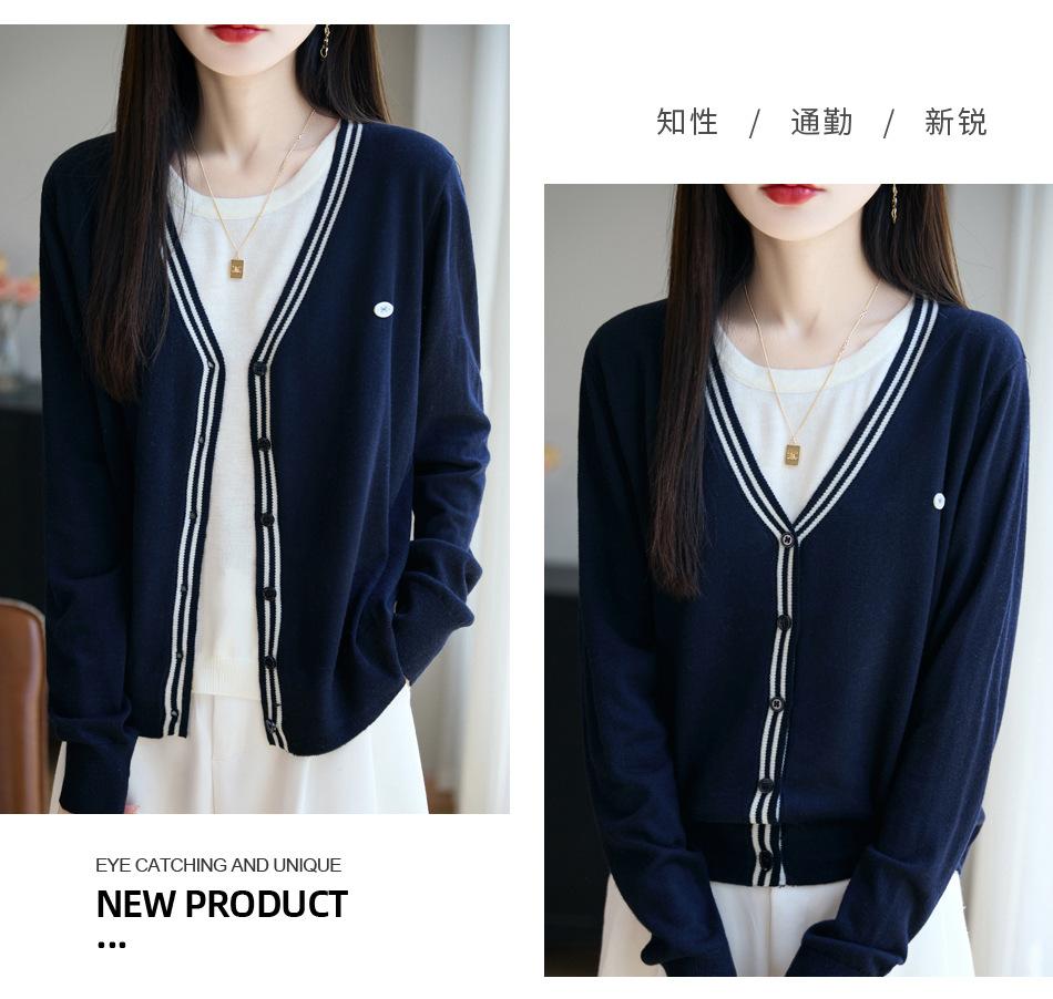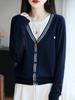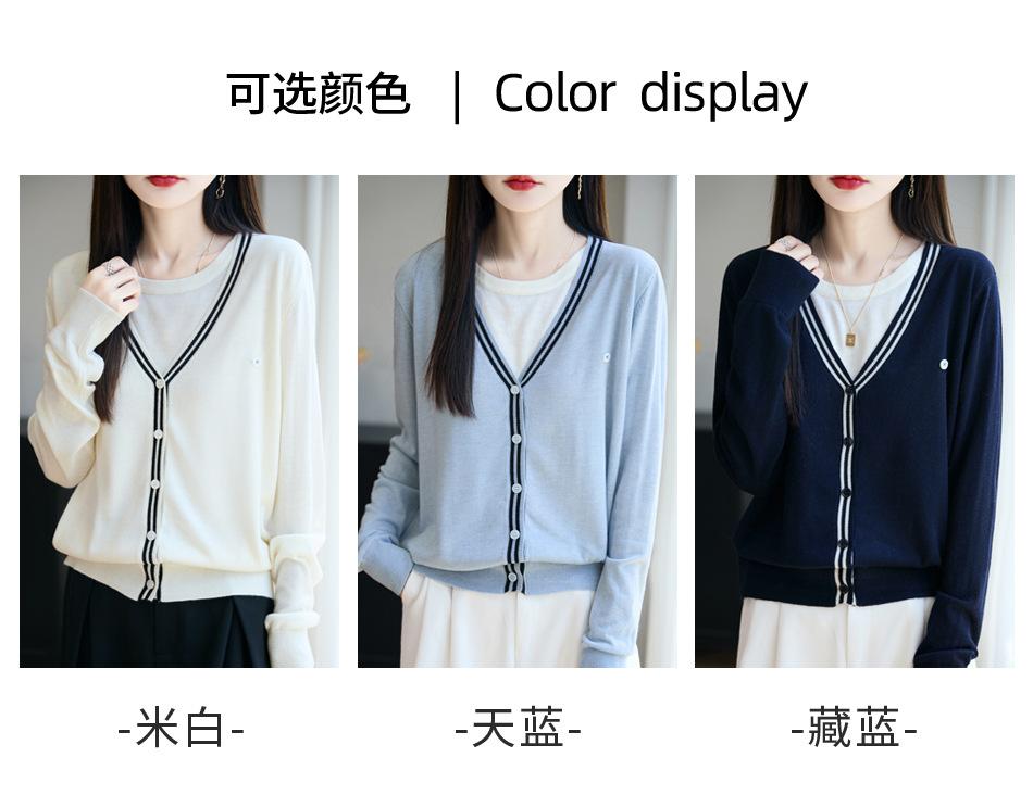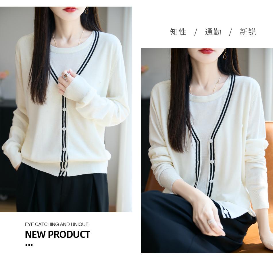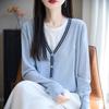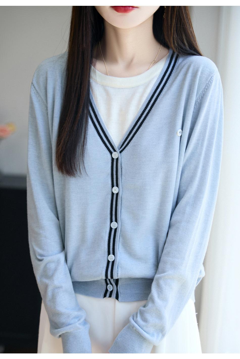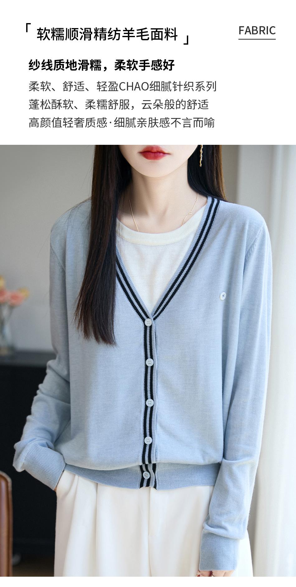 Cardigã de lã merino fina com design falso de duas peças feminino novo outono e inverno listrado gola V casaco de malha versátil e preguiçoso