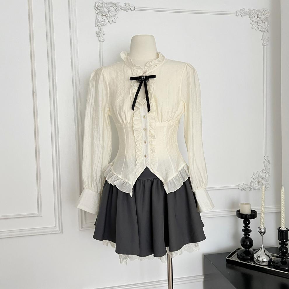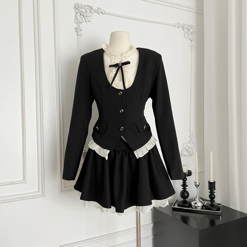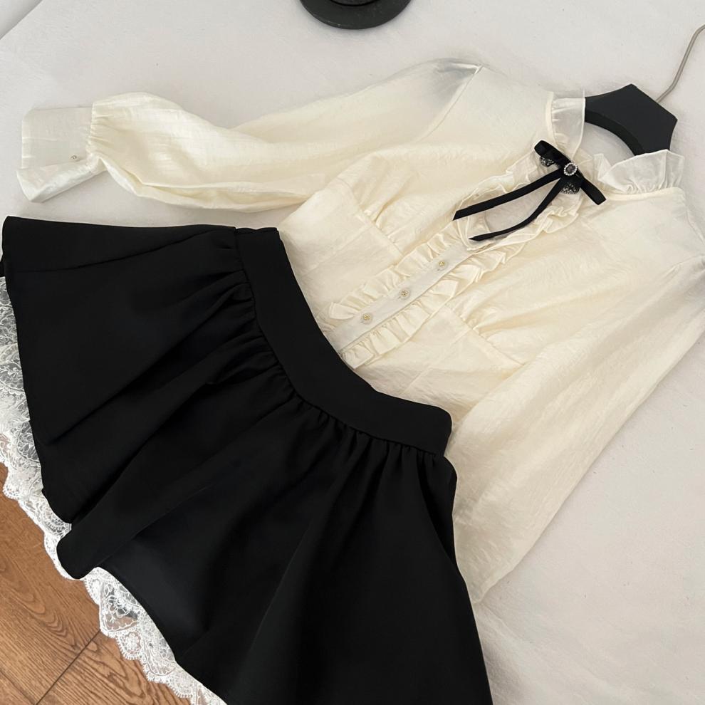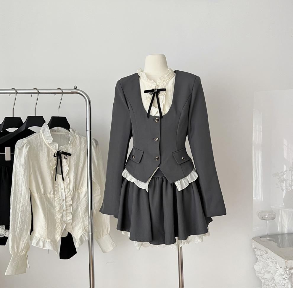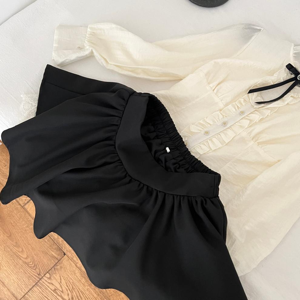 Conjunto de terno leve estilo profissional senso de design camisa com babados saia bufante de cintura alta conjunto de três peças