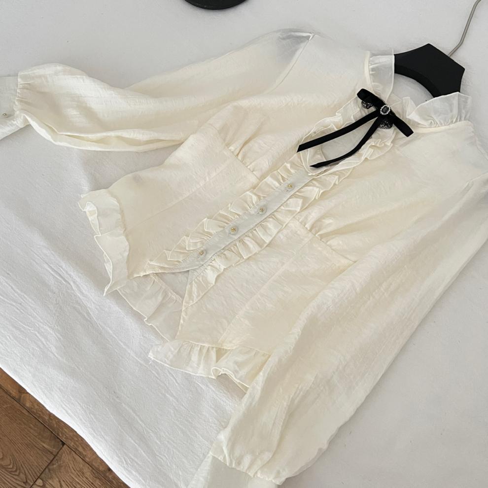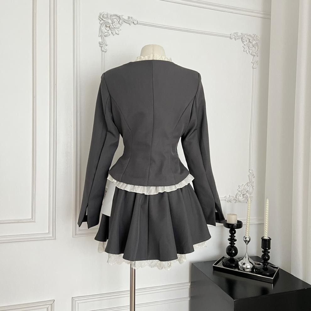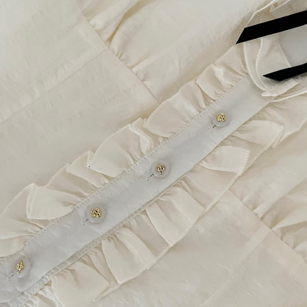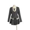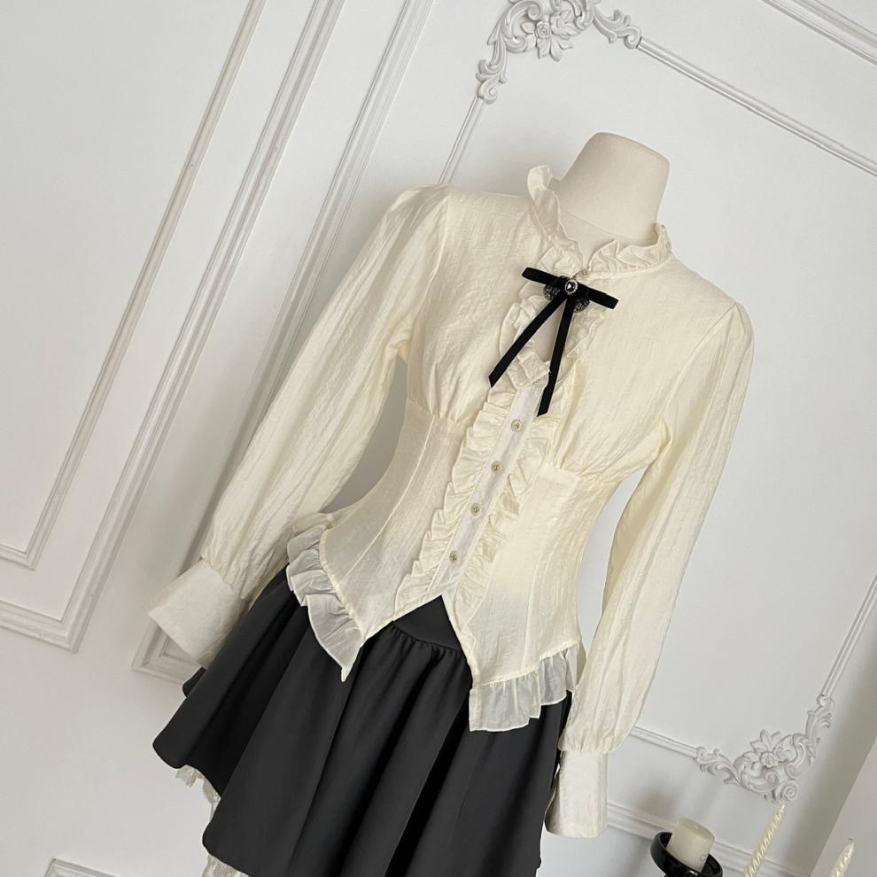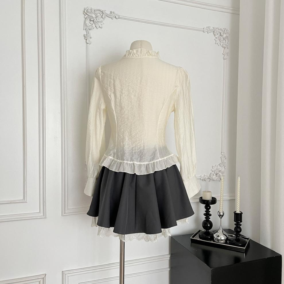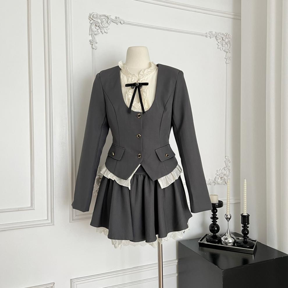 Conjunto de terno leve estilo profissional senso de design camisa com babados saia bufante de cintura alta conjunto de três peças