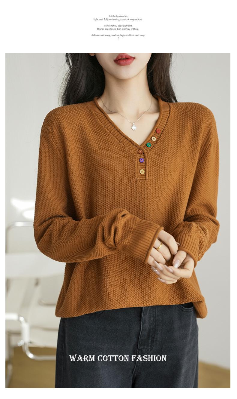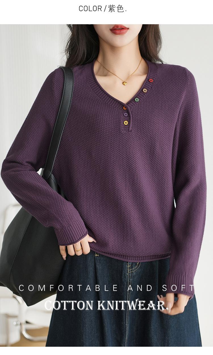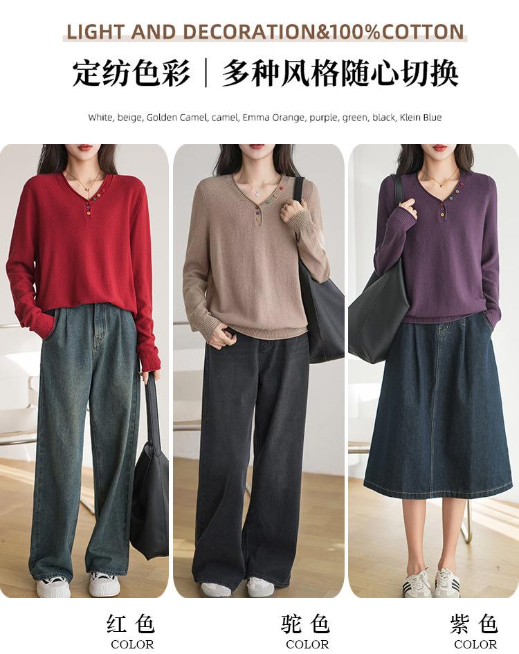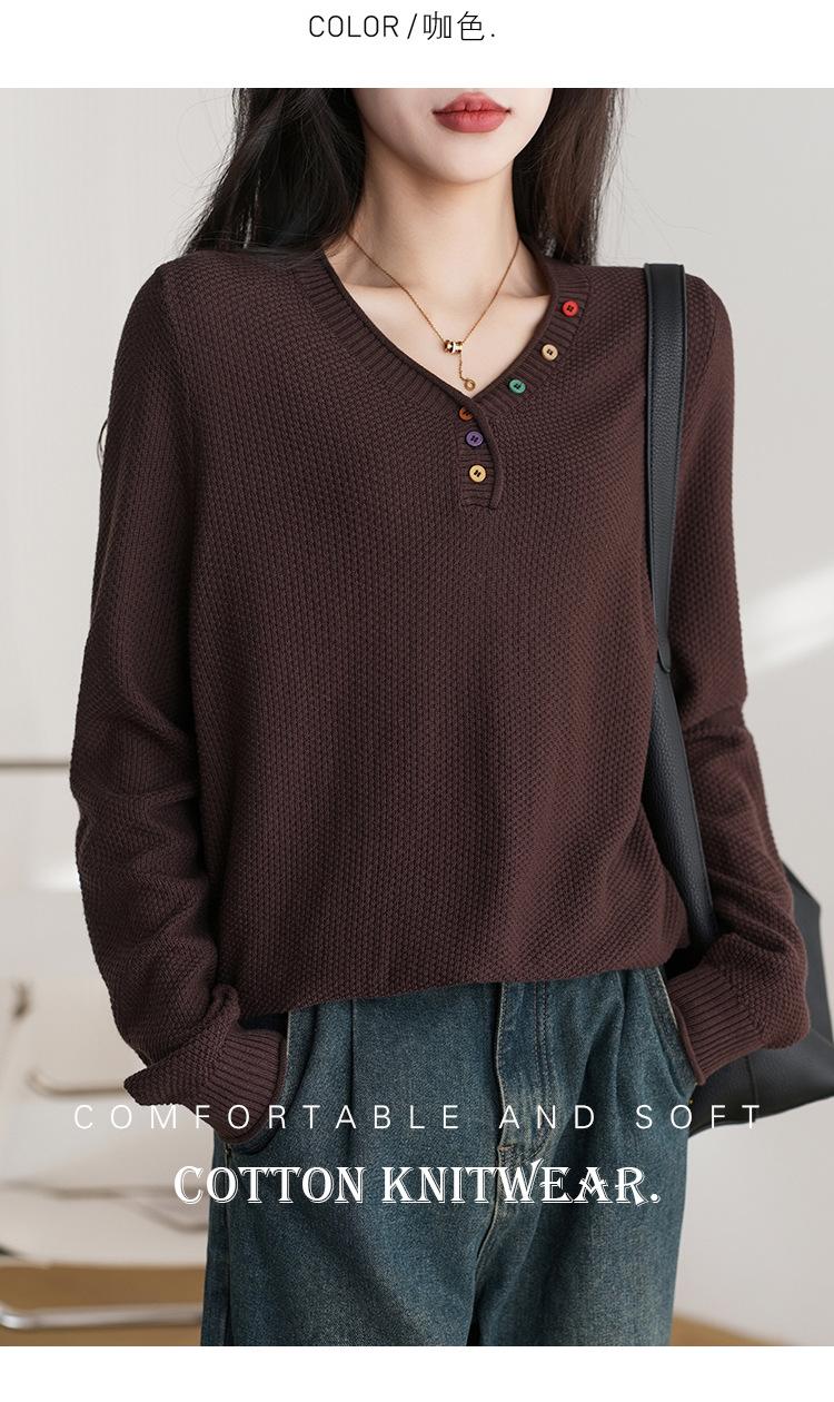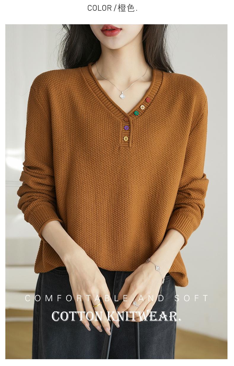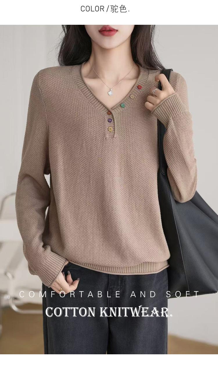 Suéter Tricotado de Algodão Puro com Decote em V e Fivela Colorida, Pulôver Solto de Cor Sólida, Camiseta Básica para Mulheres
