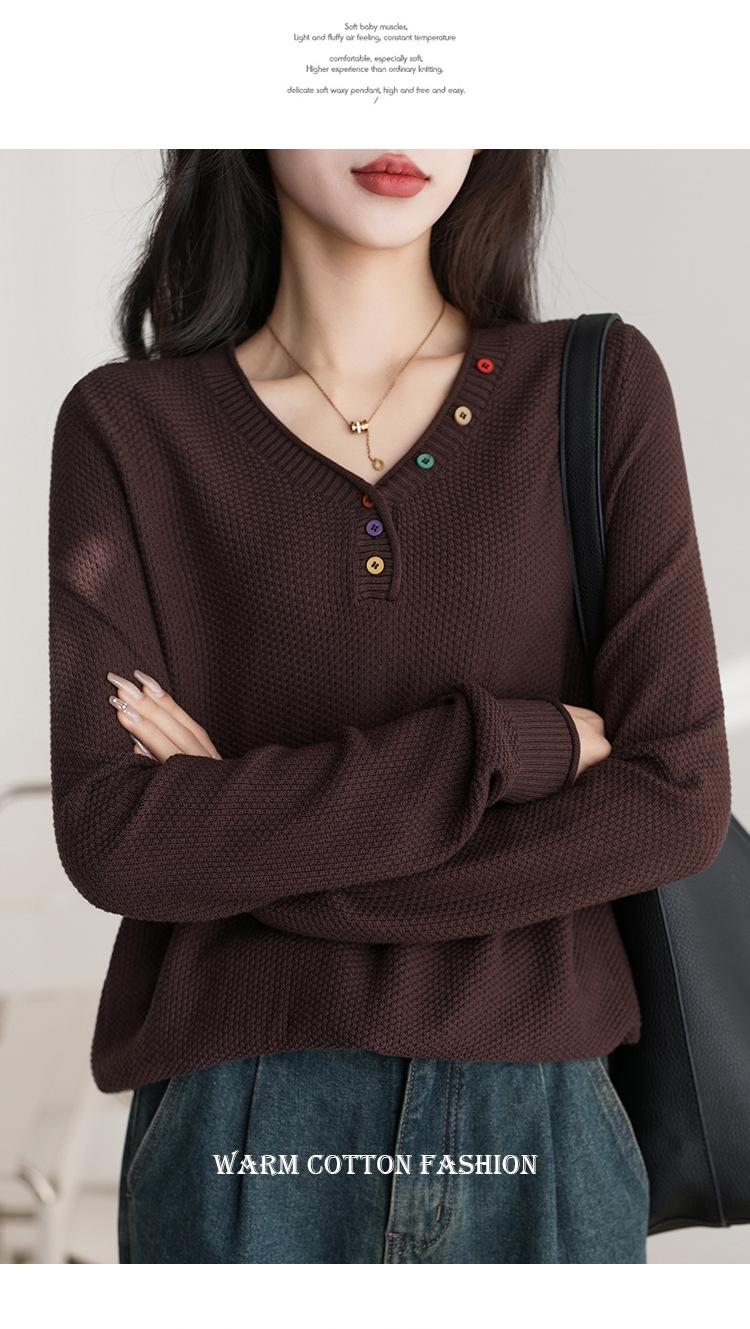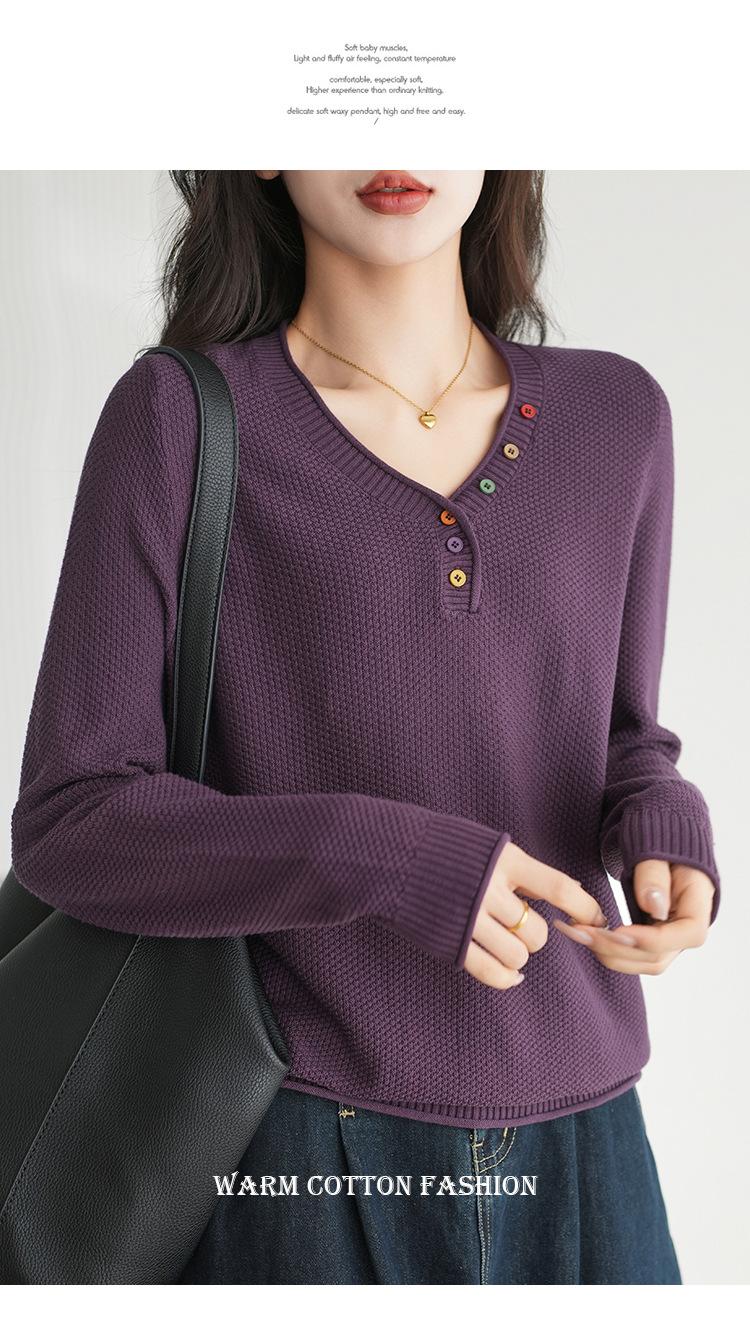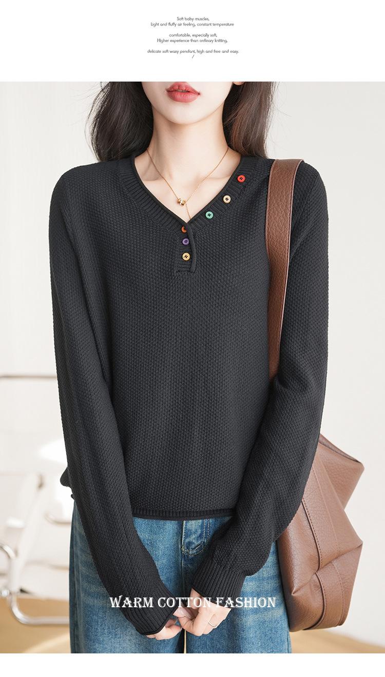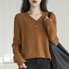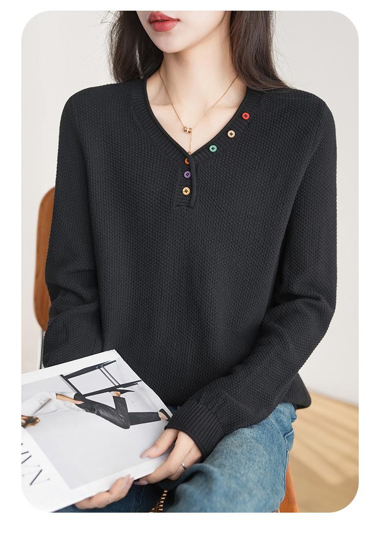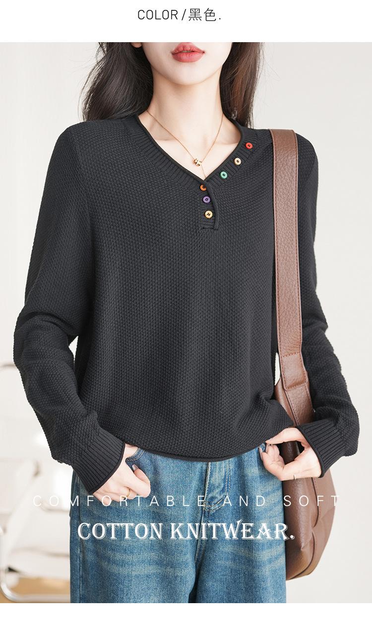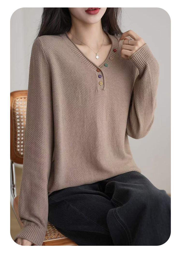 Suéter Tricotado de Algodão Puro com Decote em V e Fivela Colorida, Pulôver Solto de Cor Sólida, Camiseta Básica para Mulheres