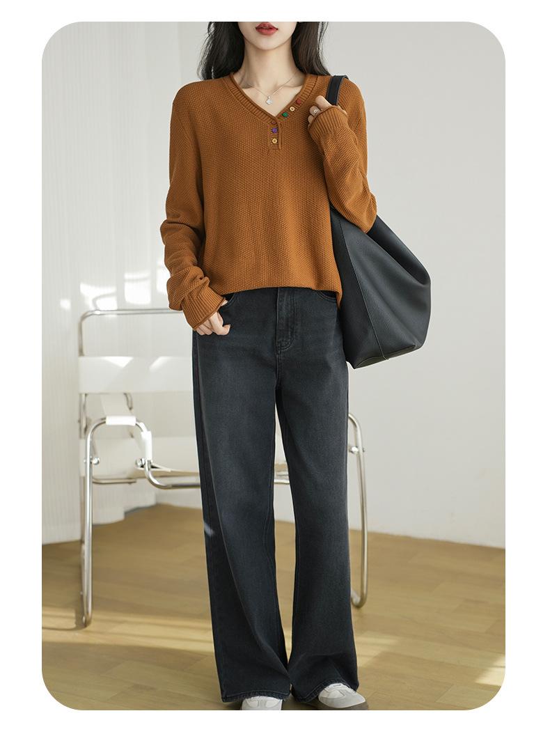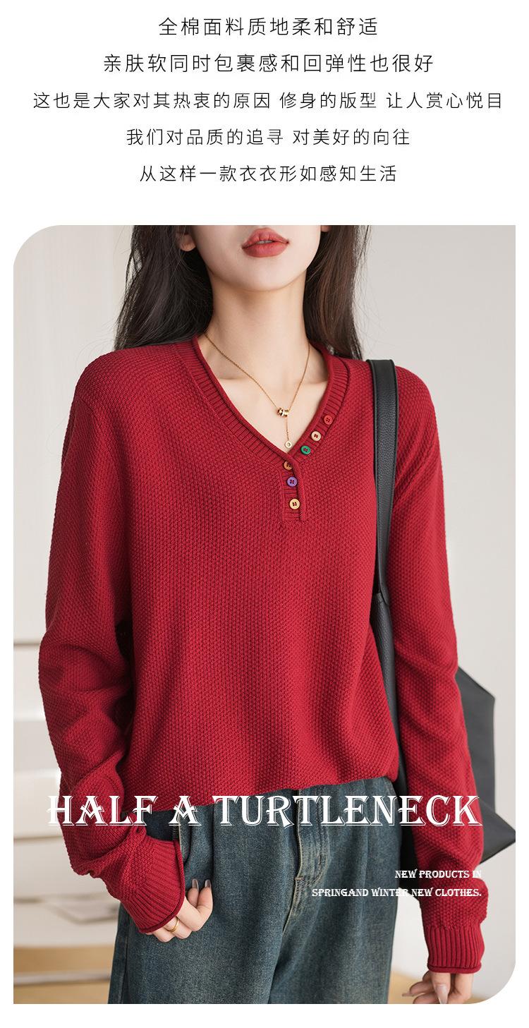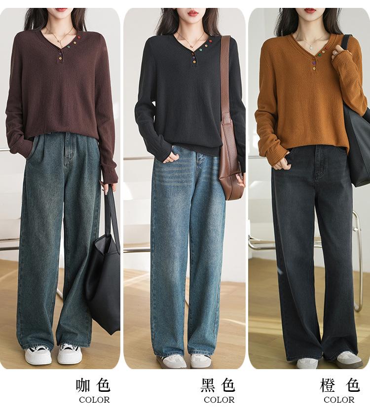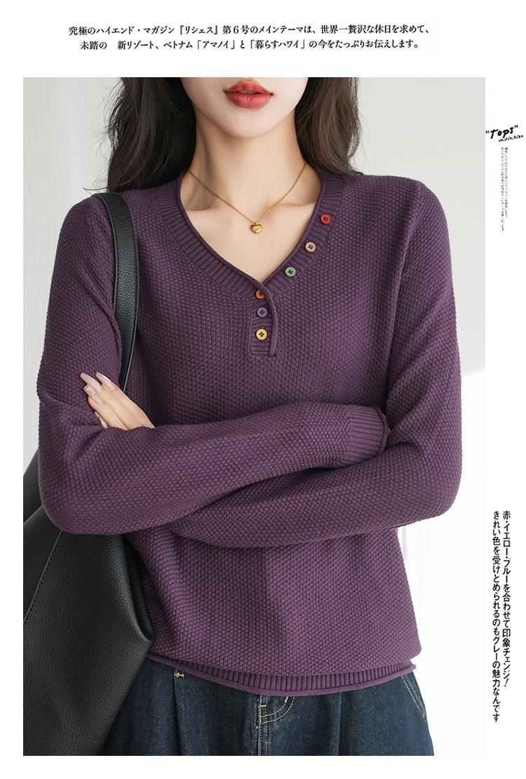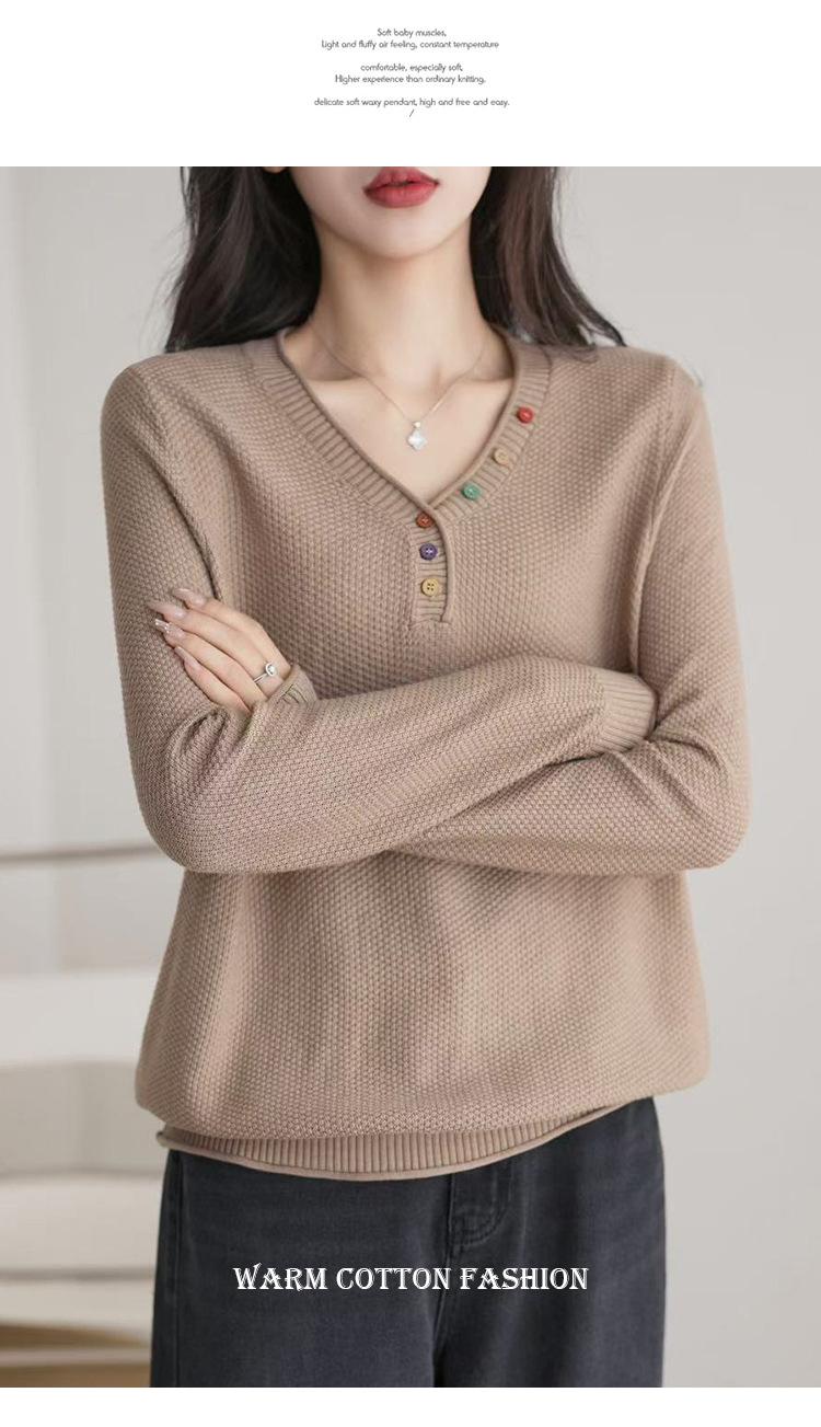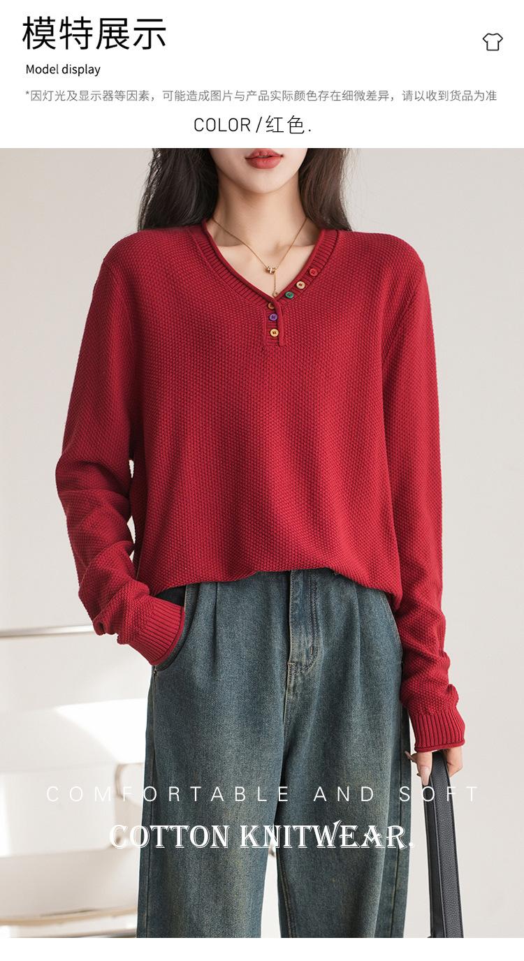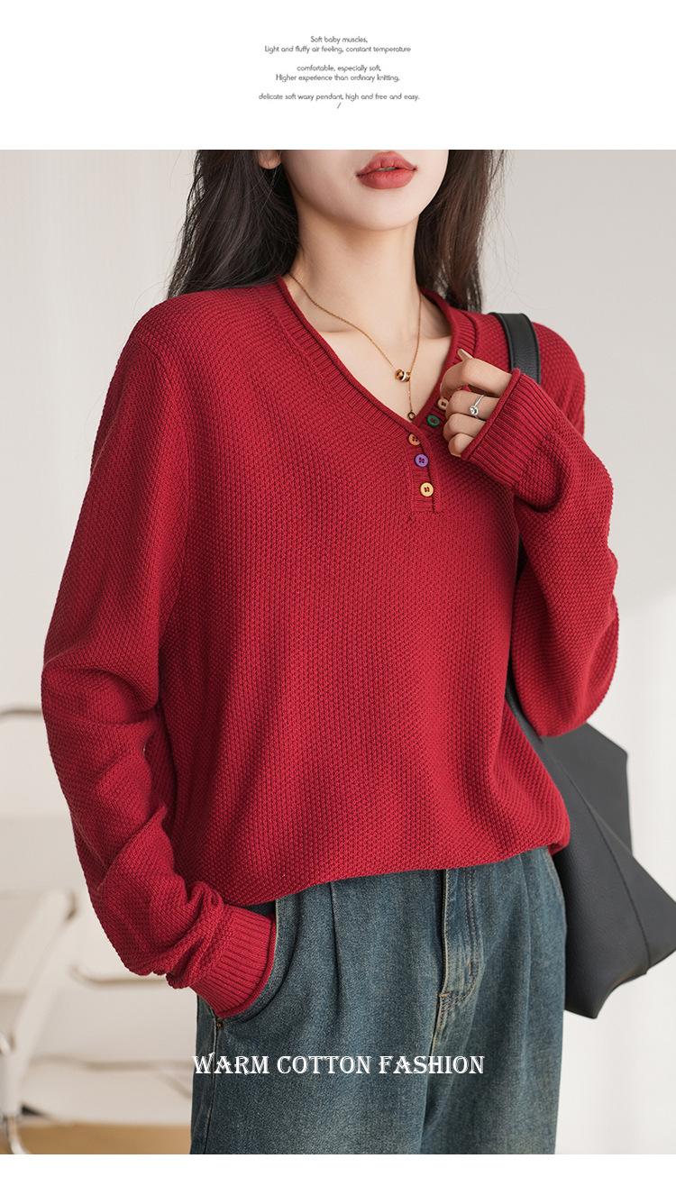 Suéter Tricotado de Algodão Puro com Decote em V e Fivela Colorida, Pulôver Solto de Cor Sólida, Camiseta Básica para Mulheres