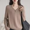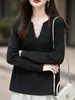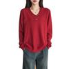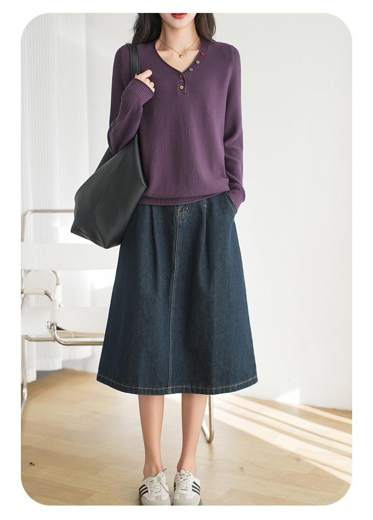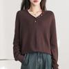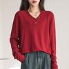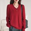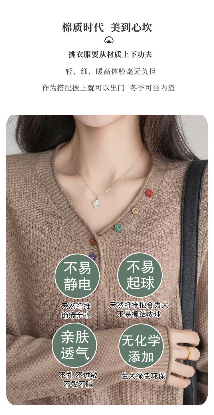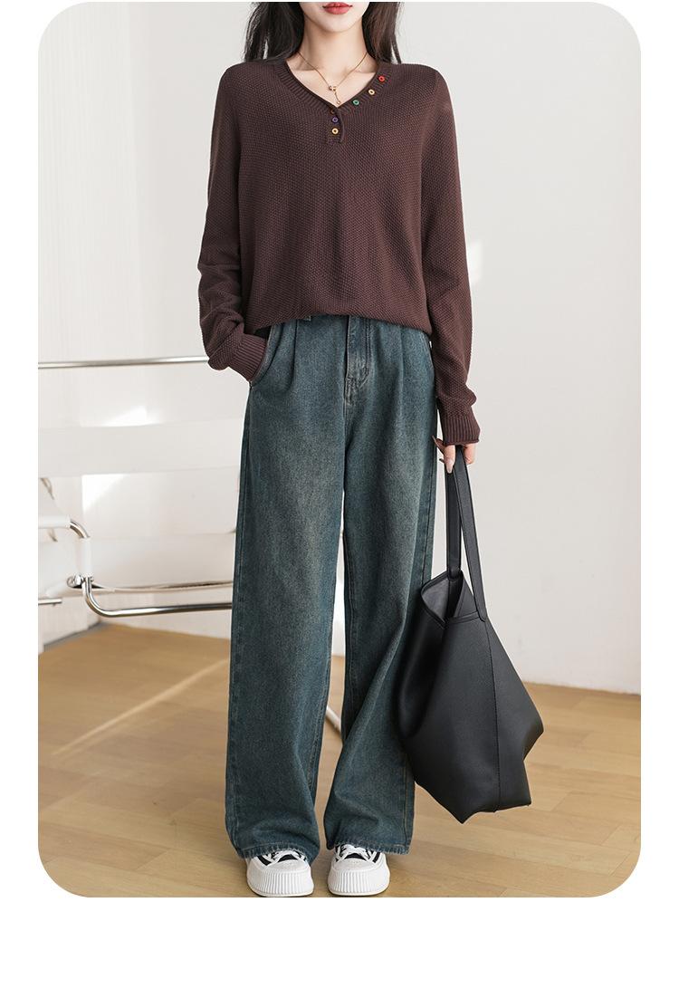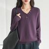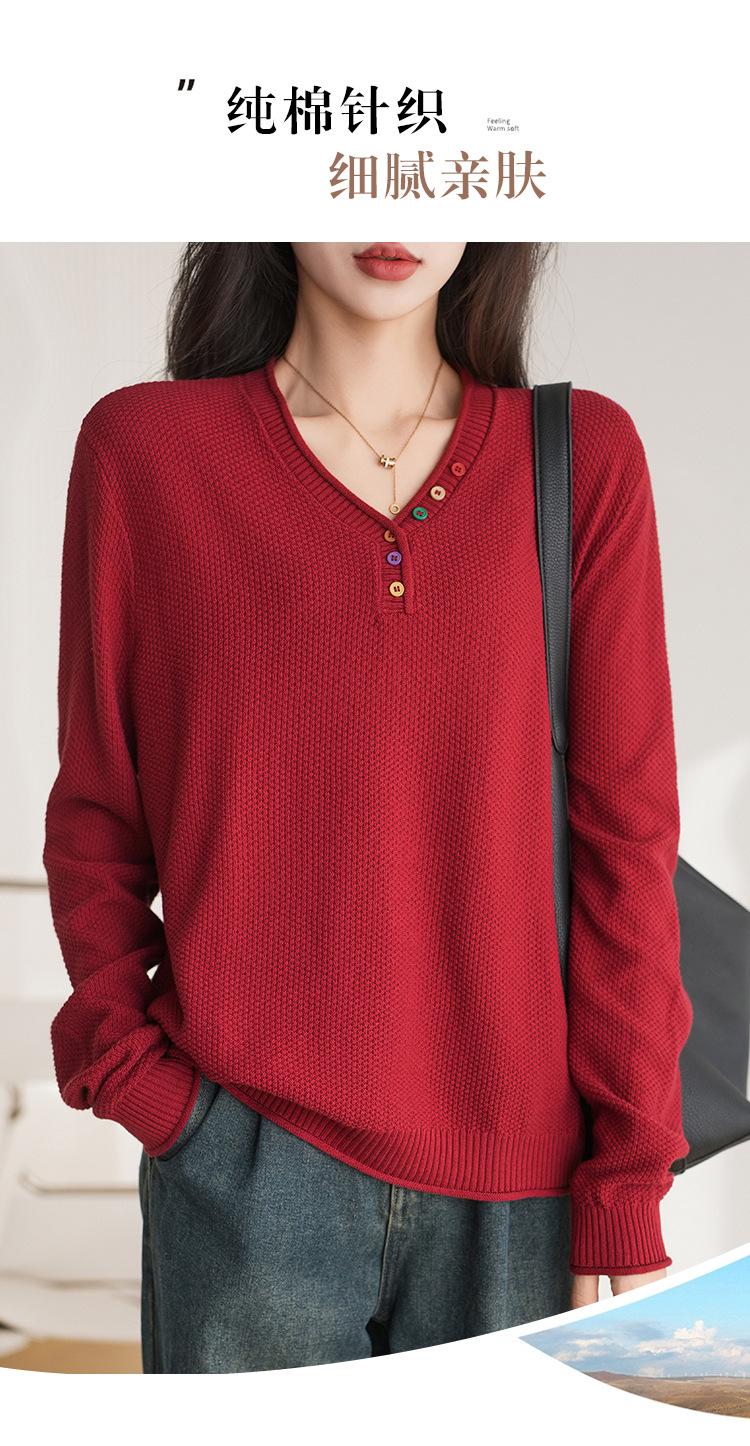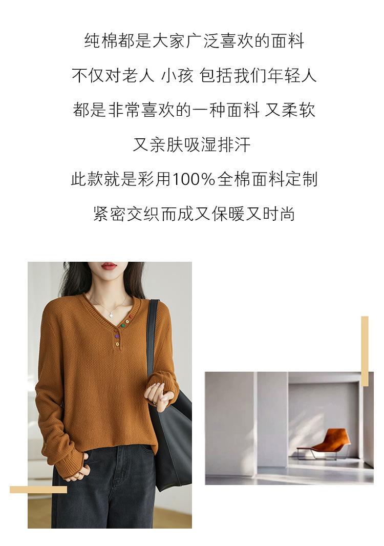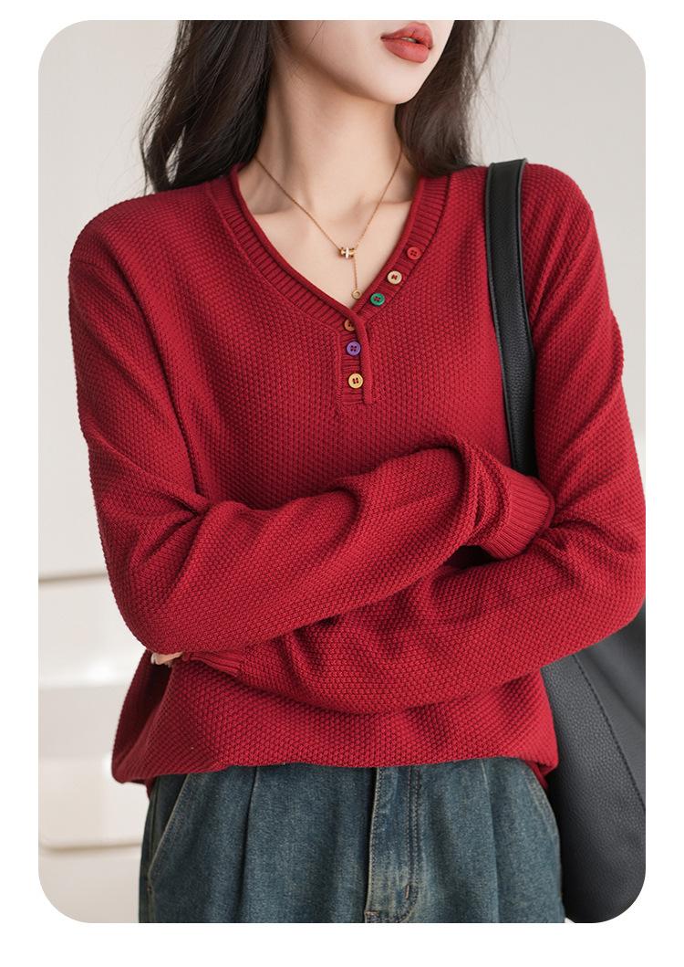 Suéter Tricotado de Algodão Puro com Decote em V e Fivela Colorida, Pulôver Solto de Cor Sólida, Camiseta Básica para Mulheres