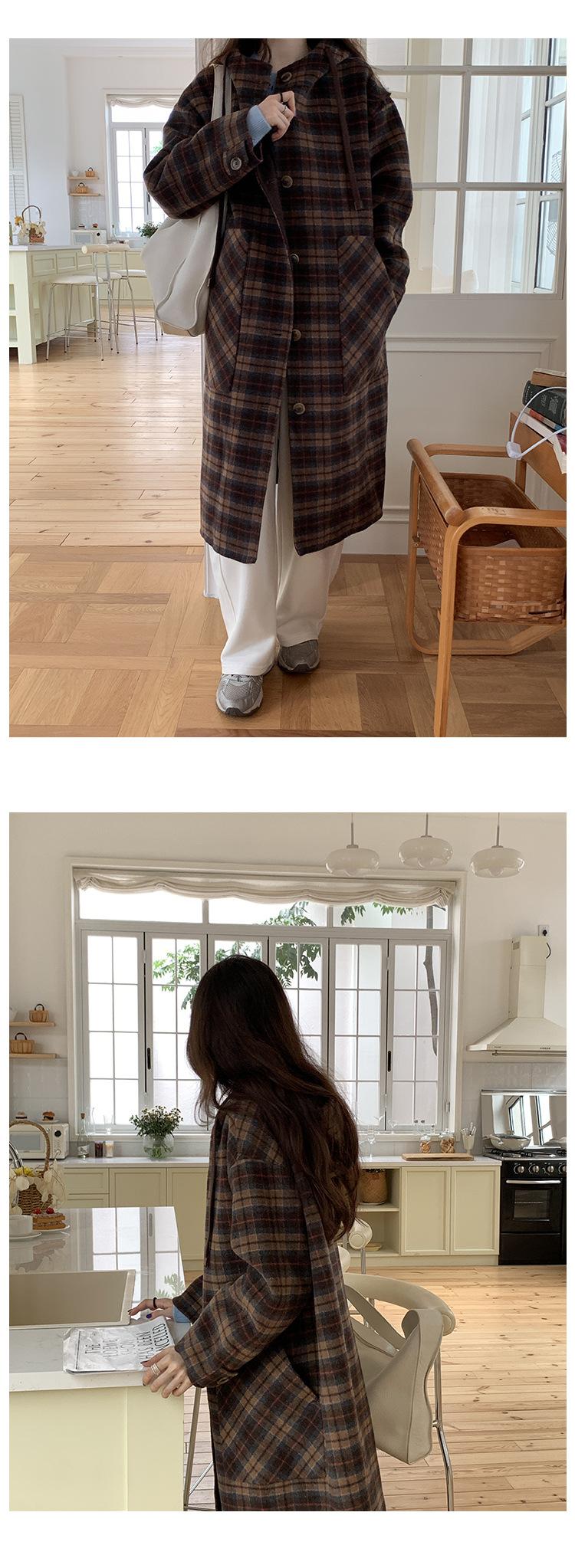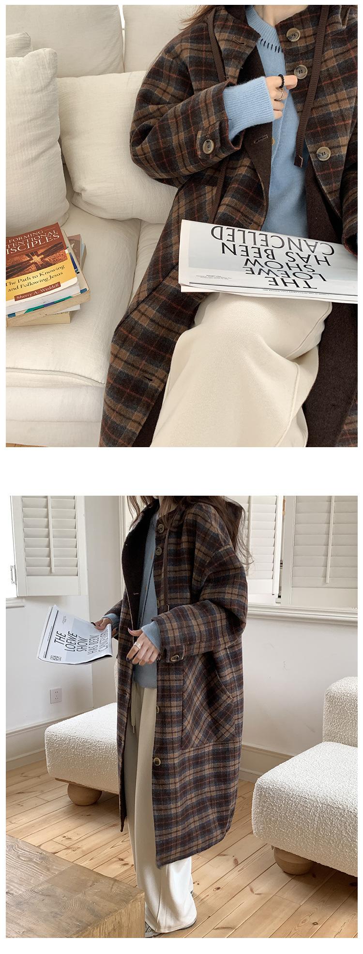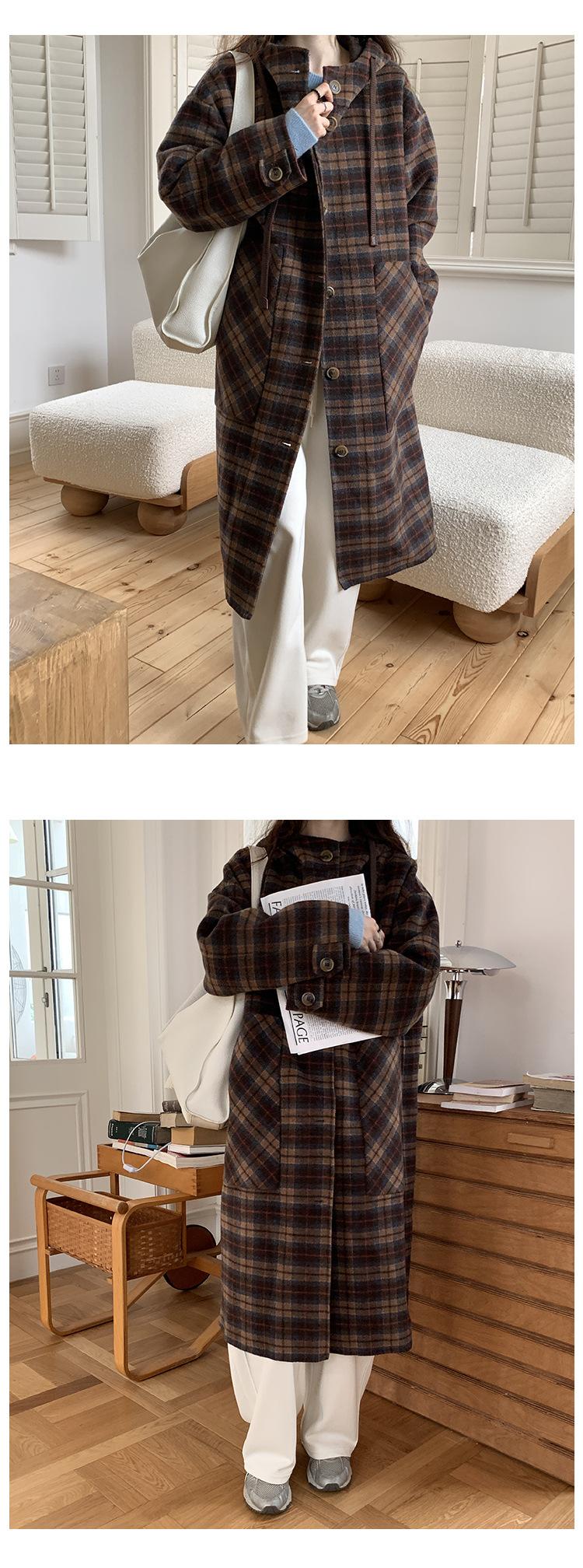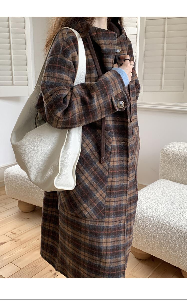 Casaco Xadrez de Lã 70% Dupla Face Feminino Inverno Novo Coreano Retrô Cáqui Solto com Capuz Casaco de Lã