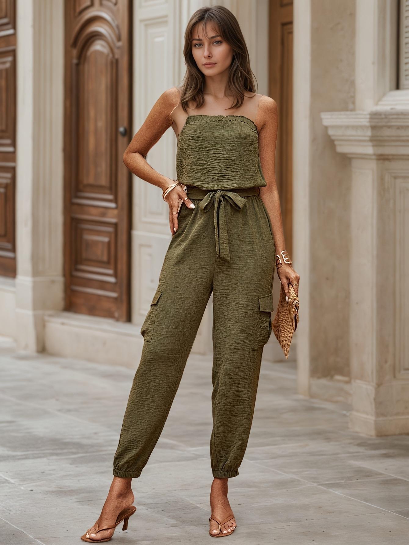 Amazon Europa e América Comércio Exterior Transfronteiriço Roupas Femininas 2025 Primavera e Verão Cor Sólida Sem Alças Bolso Amarração Macacão Casual Feminino