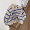 Suéter Listrado de Lã 100% com Gola Tesoura Versátil Retrô Color Block Tricô Cardigã Design Feminino Senso de Nicho Top