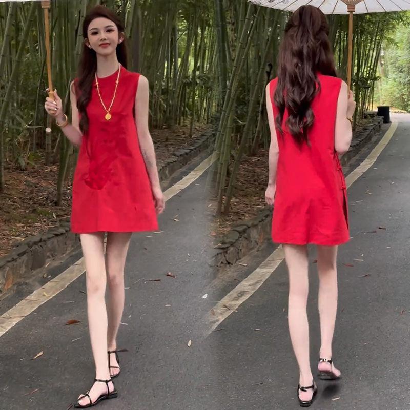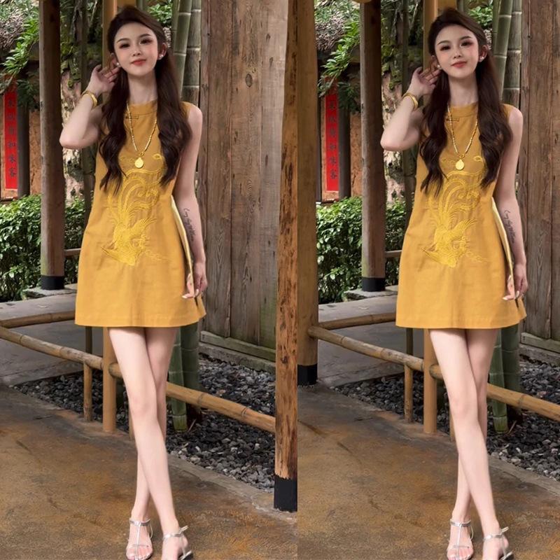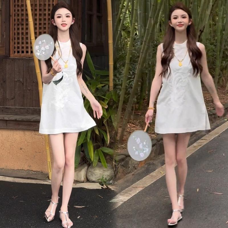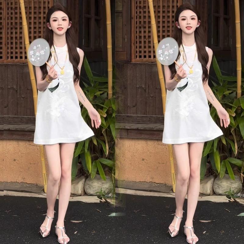 Novo Vestido Estilo Chinês para Mulheres 2025 Verão Novo Estilo Visual Emagrecedor Bordado Pesado Botão de Disco Saia Midi