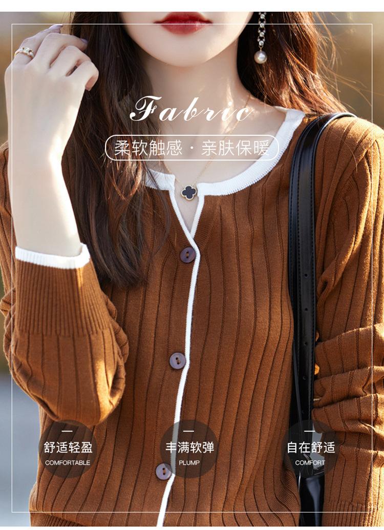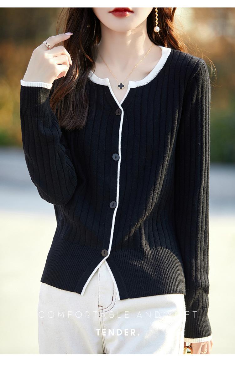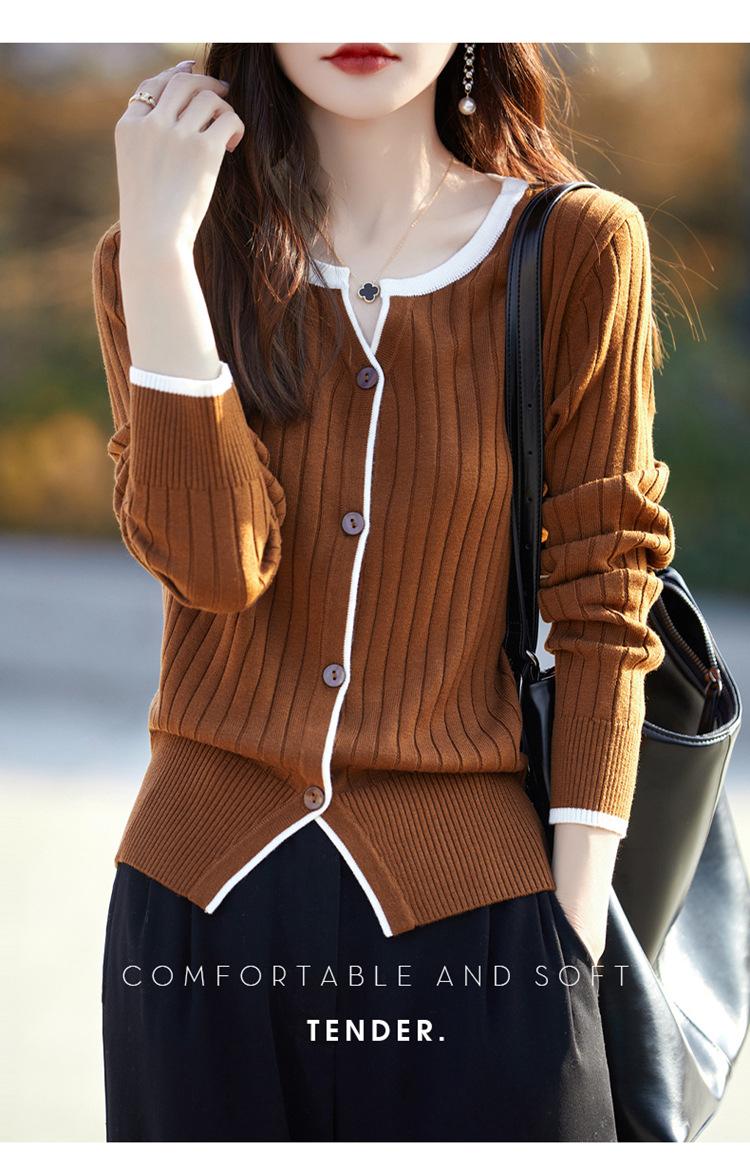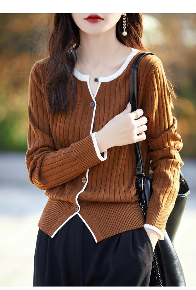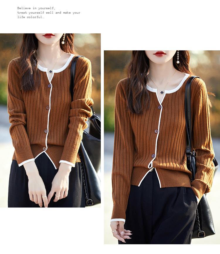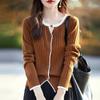 Tricô de Lã Penteada Decote V para Mulheres 2025 Início do Outono Novo Cardigan Casaco Versátil Manga Longa Decote Redondo Tricô Cor Contrastante